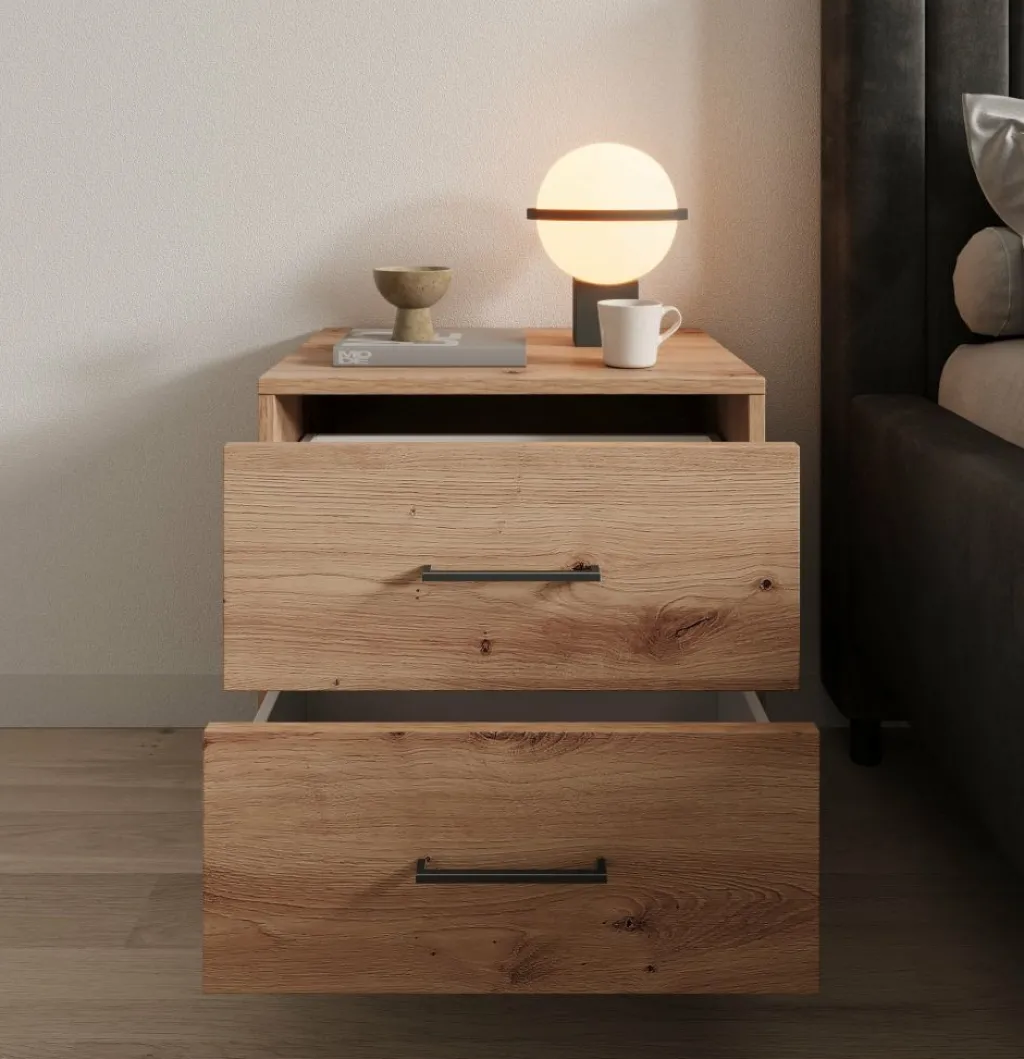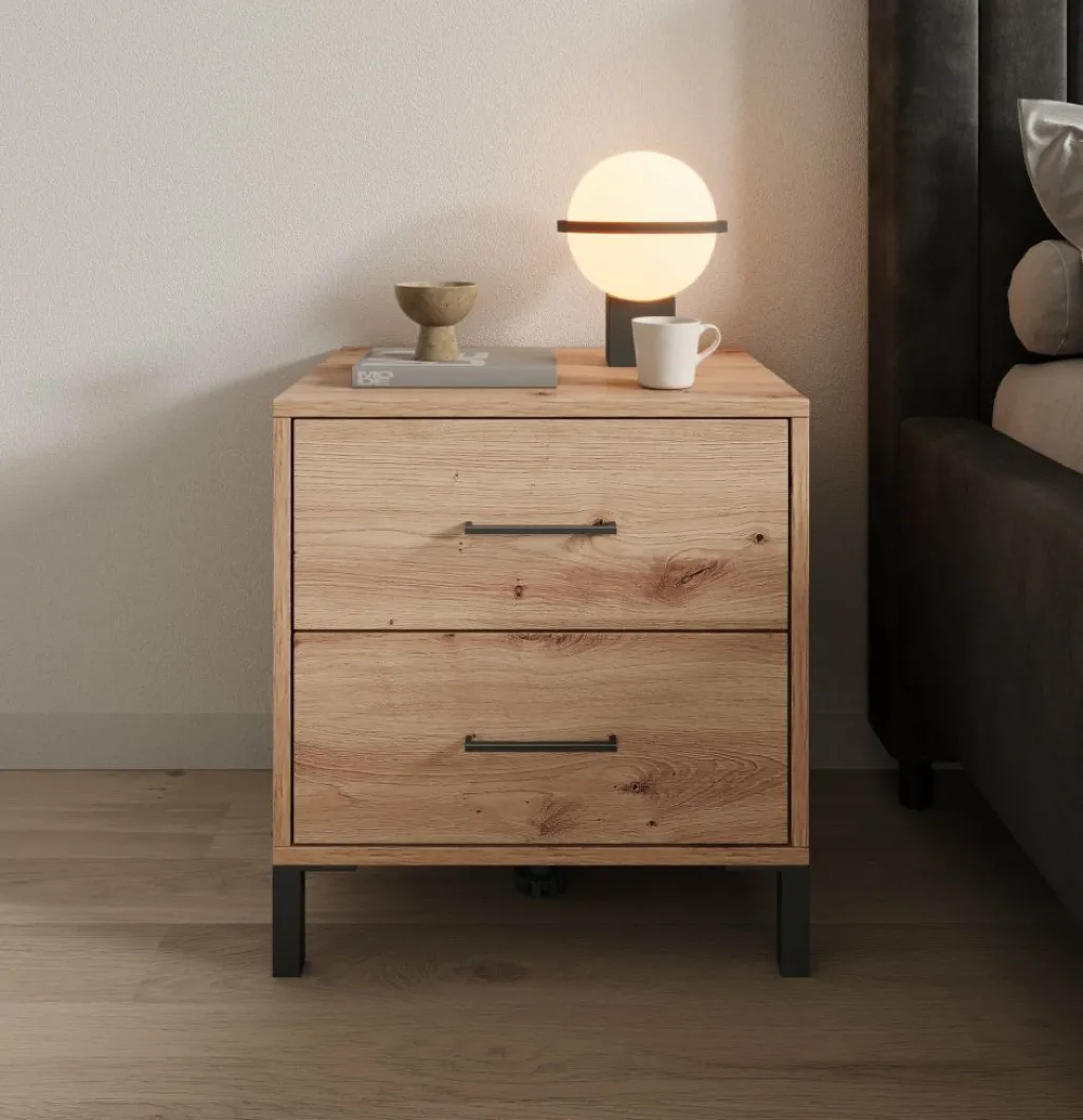 Nachtkastje Vidor is een opbergkastje voor naast het bed in een moderne stijl. Het nachtkastje is uitgevoerd in een eiken kleur met zwarte poten. De Vidor beschikt over 2 lades die te openen zijn met zwarte handgrepen.