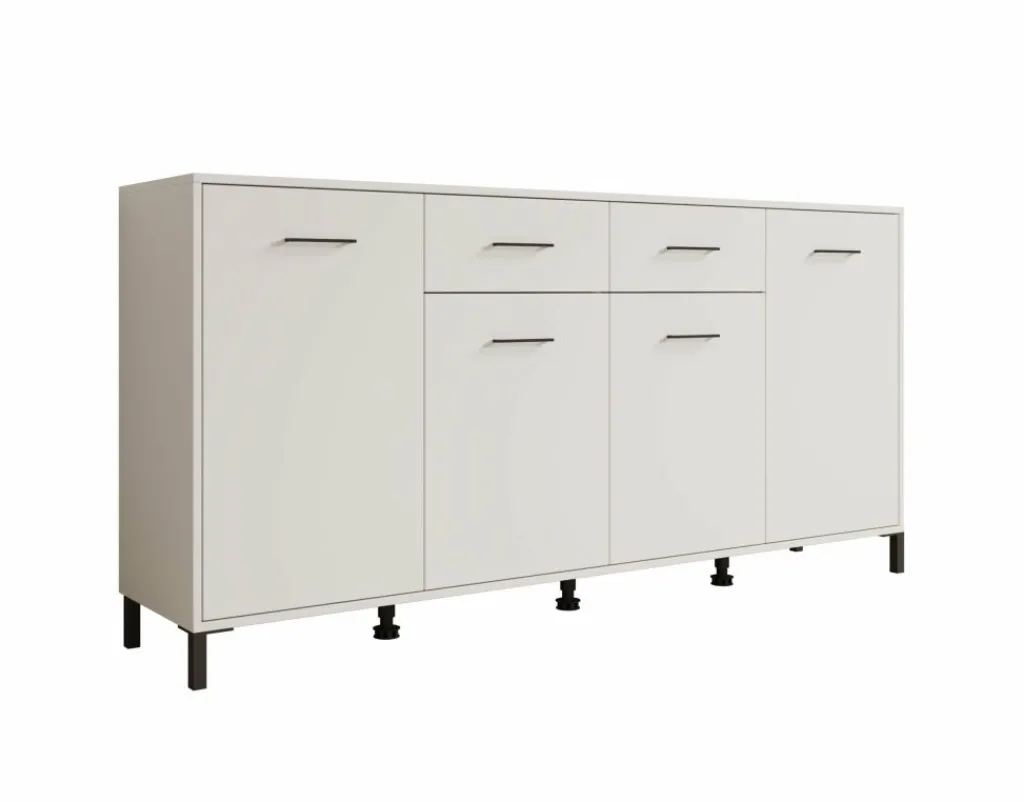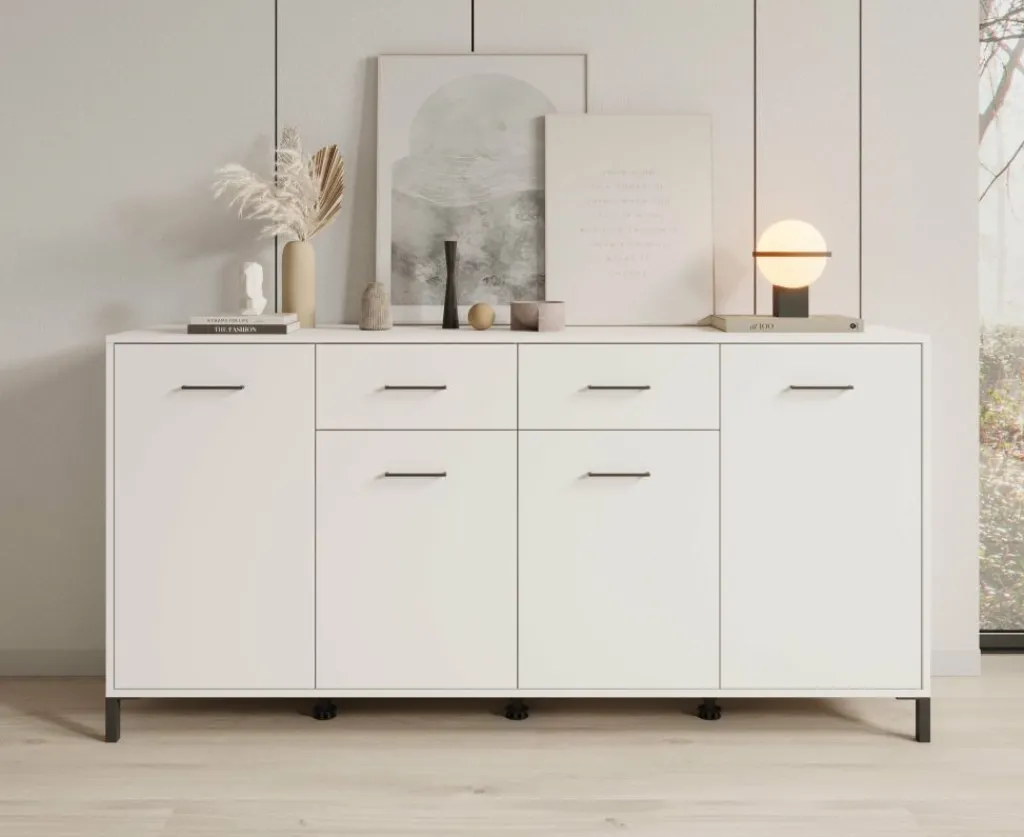 Dressoir Vidor is een opbergkast in moderne stijl. De kast beschikt over 2 lades en 4 deuren die openen met zwarte handgrepen. Achter de deuren zijn in totaal 8 opbergvakken te vinden. Het dressoir is uitgevoerd in een witte kleur met zwarte poten.