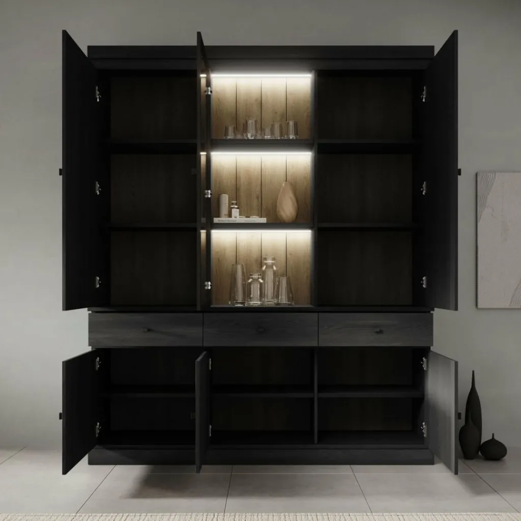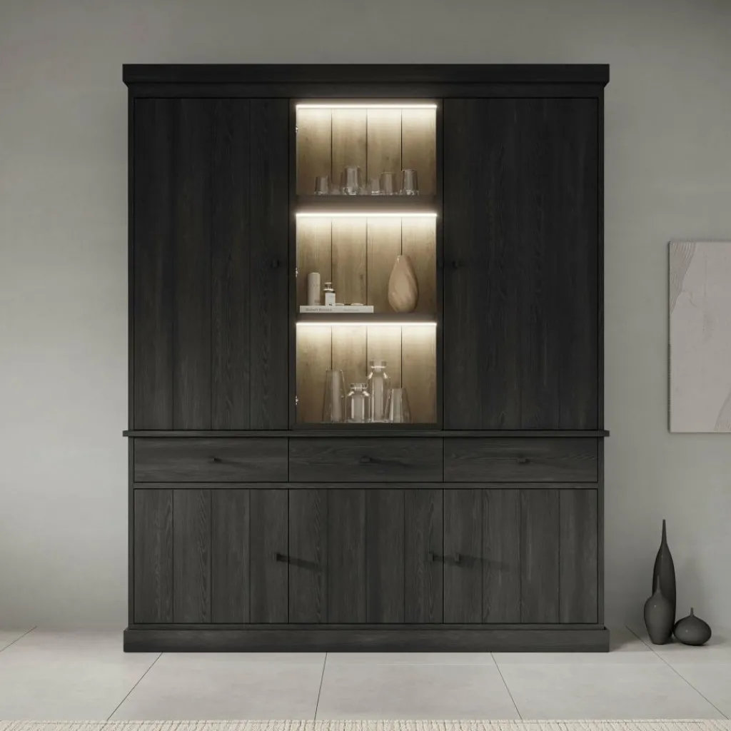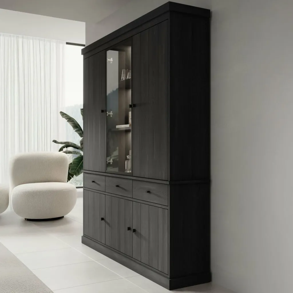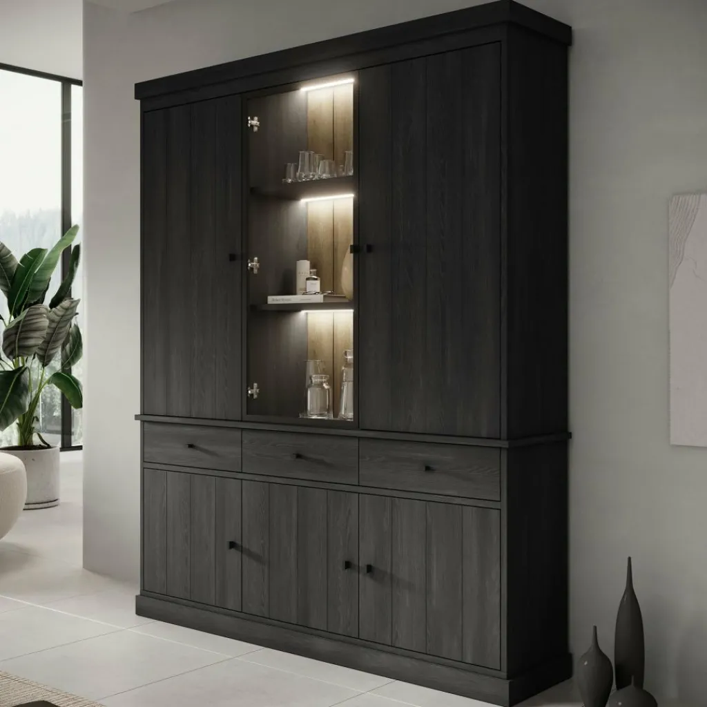 Buffetkast Vince is een praktisch vormgegeven kast in zwart eiken kleur. De kast is gemaakt van melamine gelamineerd spaanplaat en bestaat uit twee delen: een onder- en bovenkast. Het onderste gedeelte beschikt over 3 lades en 3 deuren waarachter zich 6 opbergvakken bevinden. Het bovenste gedeelte heeft 3 deuren, waarvan de middelste is uitgevoerd met glas. Achter deze deuren bevinden zich nog eens 9 opbergvakken. Alle lades en deuren openen met zwarte knoppen.