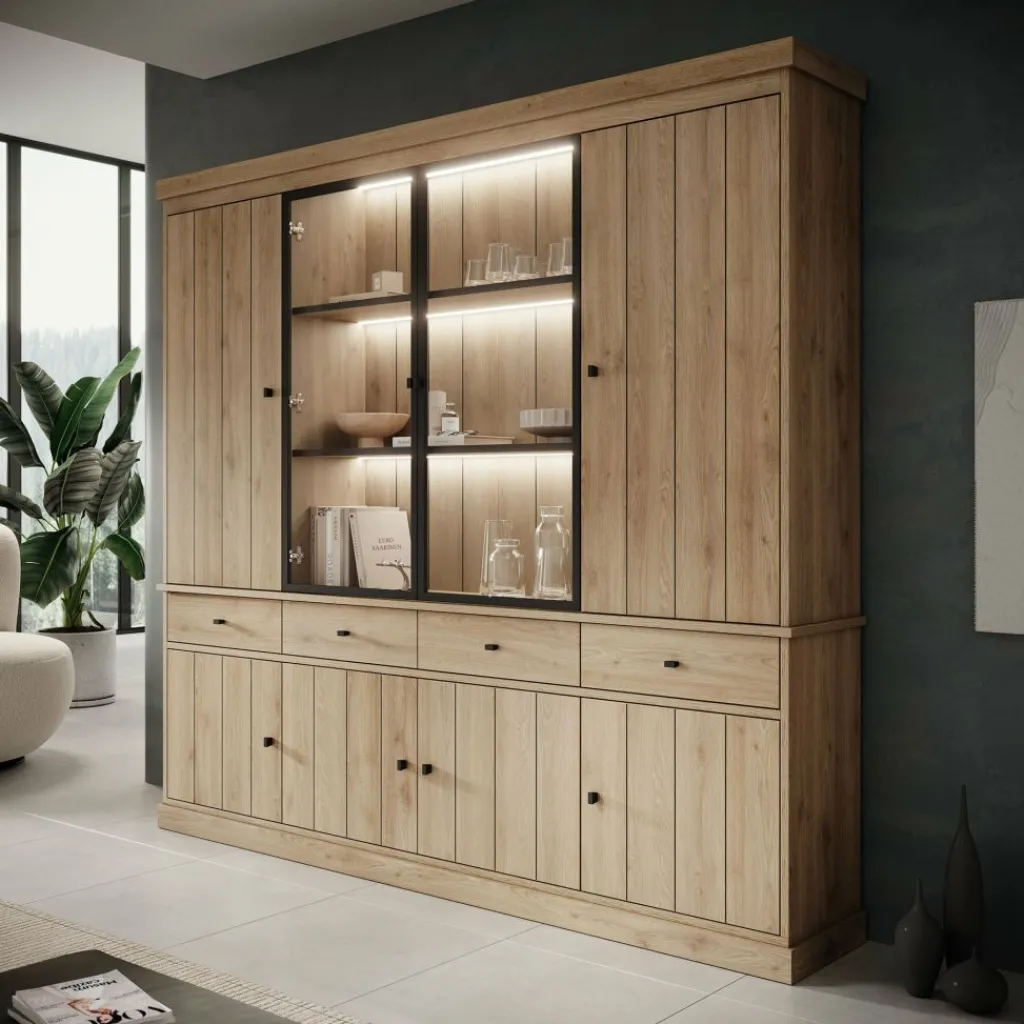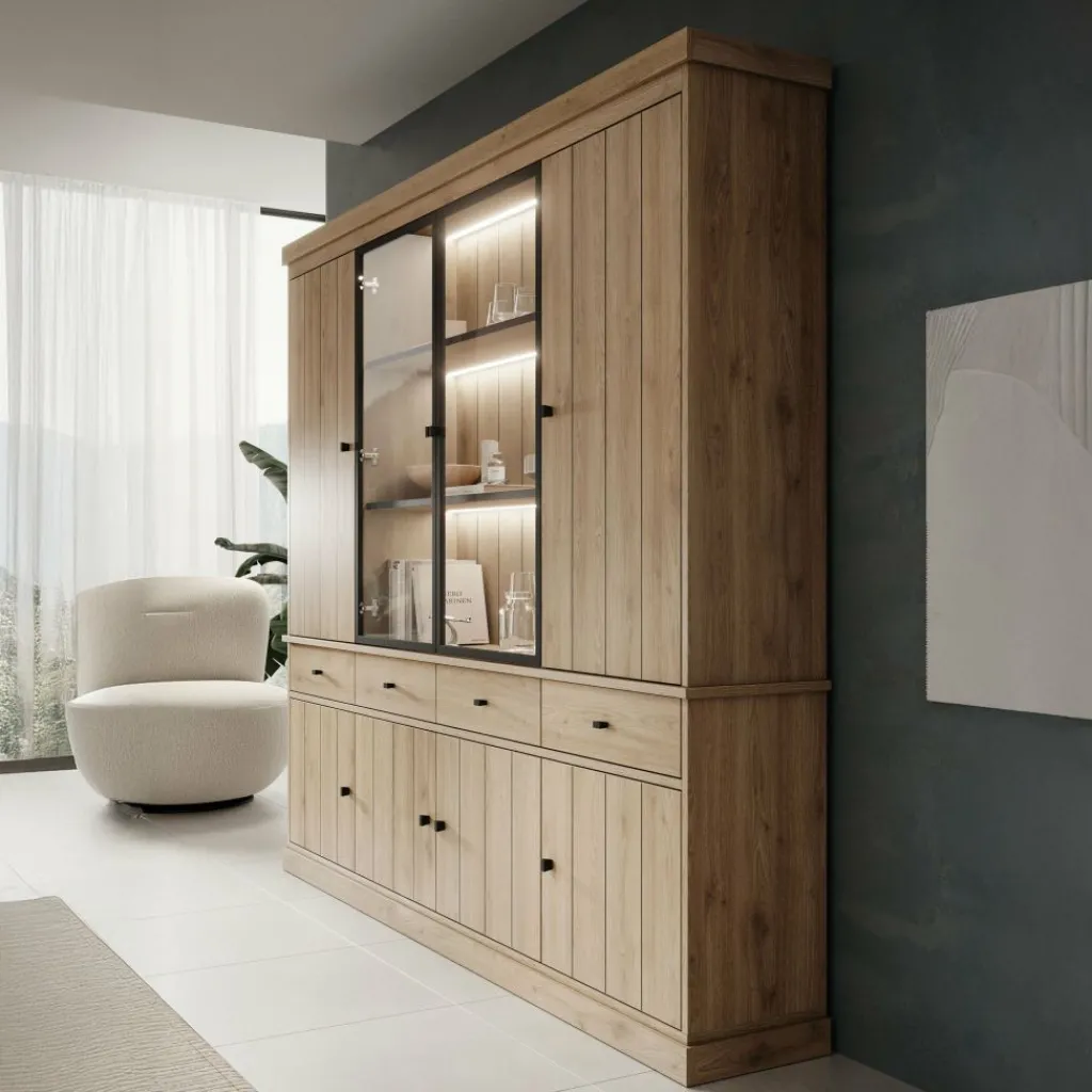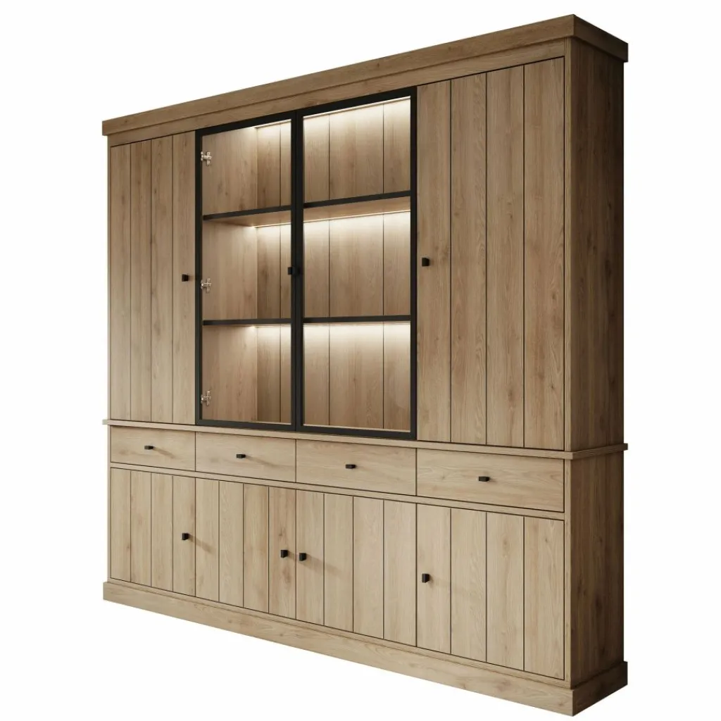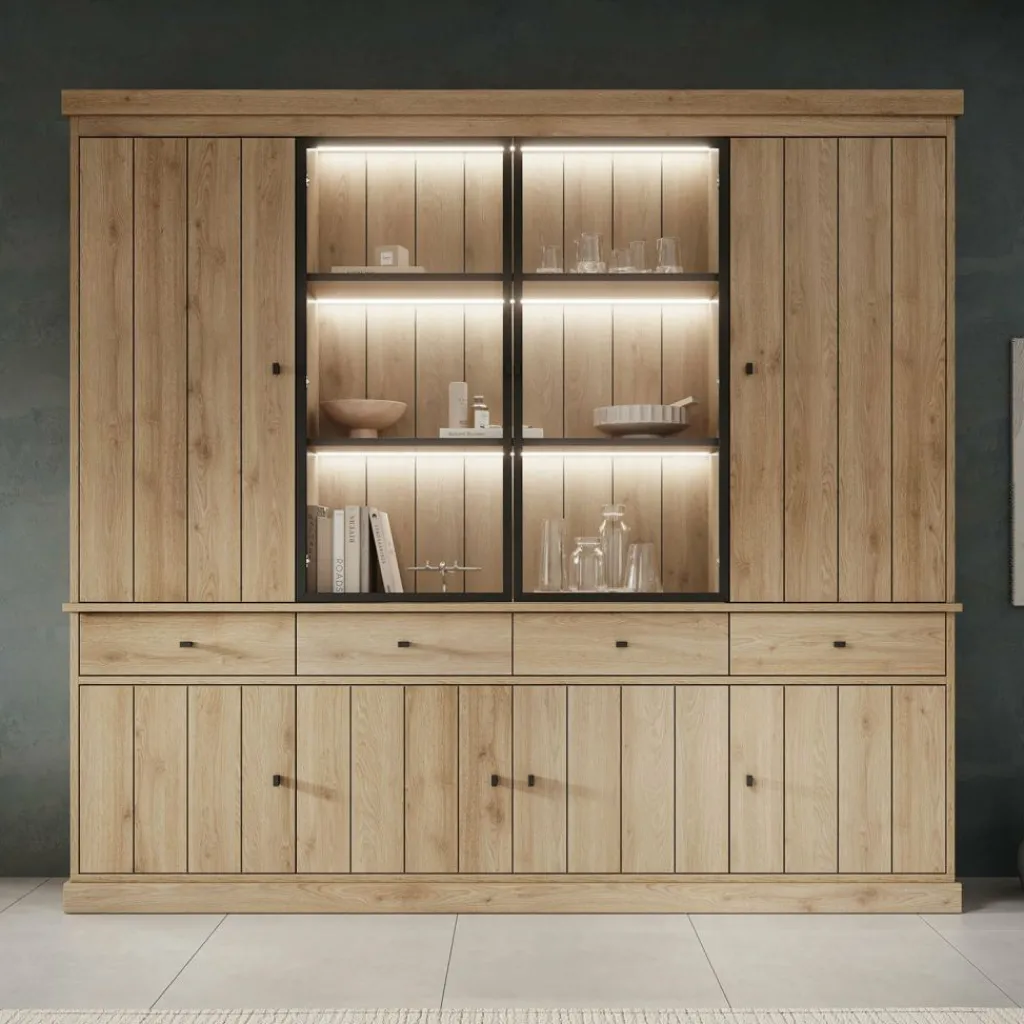 Buffetkast Vince is een praktisch vormgegeven kast in eiken kleur. De kast is gemaakt van melamine gelamineerd spaanplaat en bestaat uit twee delen: een onder- en bovenkast. Het onderste gedeelte beschikt over 4 lades en 4 deuren waarachter zich 8 opbergvakken bevinden. Het bovenste gedeelte heeft 4 deuren, waarvan de middelste 2 zijn uitgevoerd met glas. Achter deze deuren bevinden zich nog eens 9 opbergvakken. Alle lades en deuren openen met zwarte knoppen.