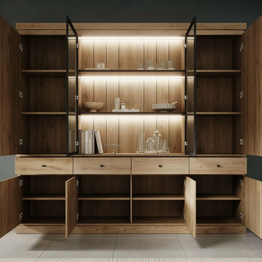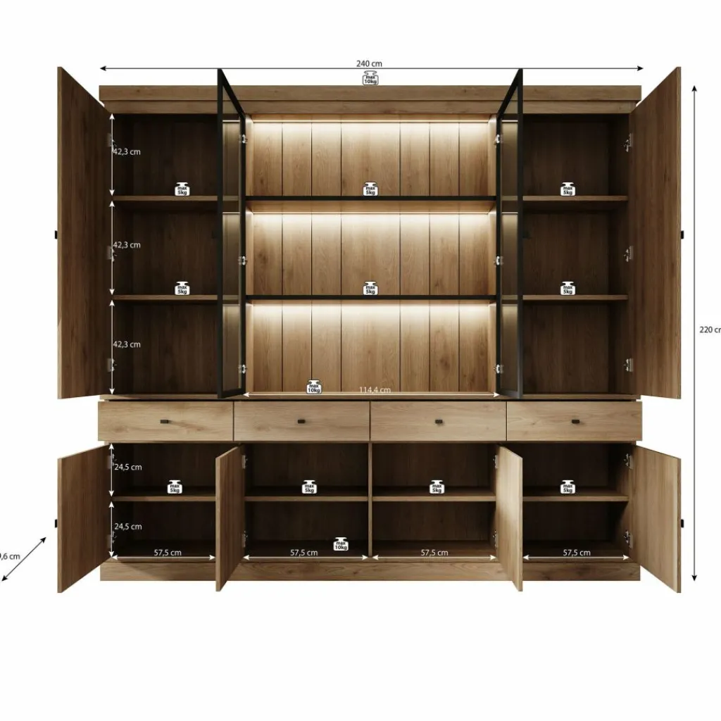 De kast is voorzien van LED-verlichting, wat zorgt voor extra sfeer en een duidelijk accent in het meubel. De verlichting is eenvoudig in- en uit te schakelen via de meegeleverde voetschakelaar.