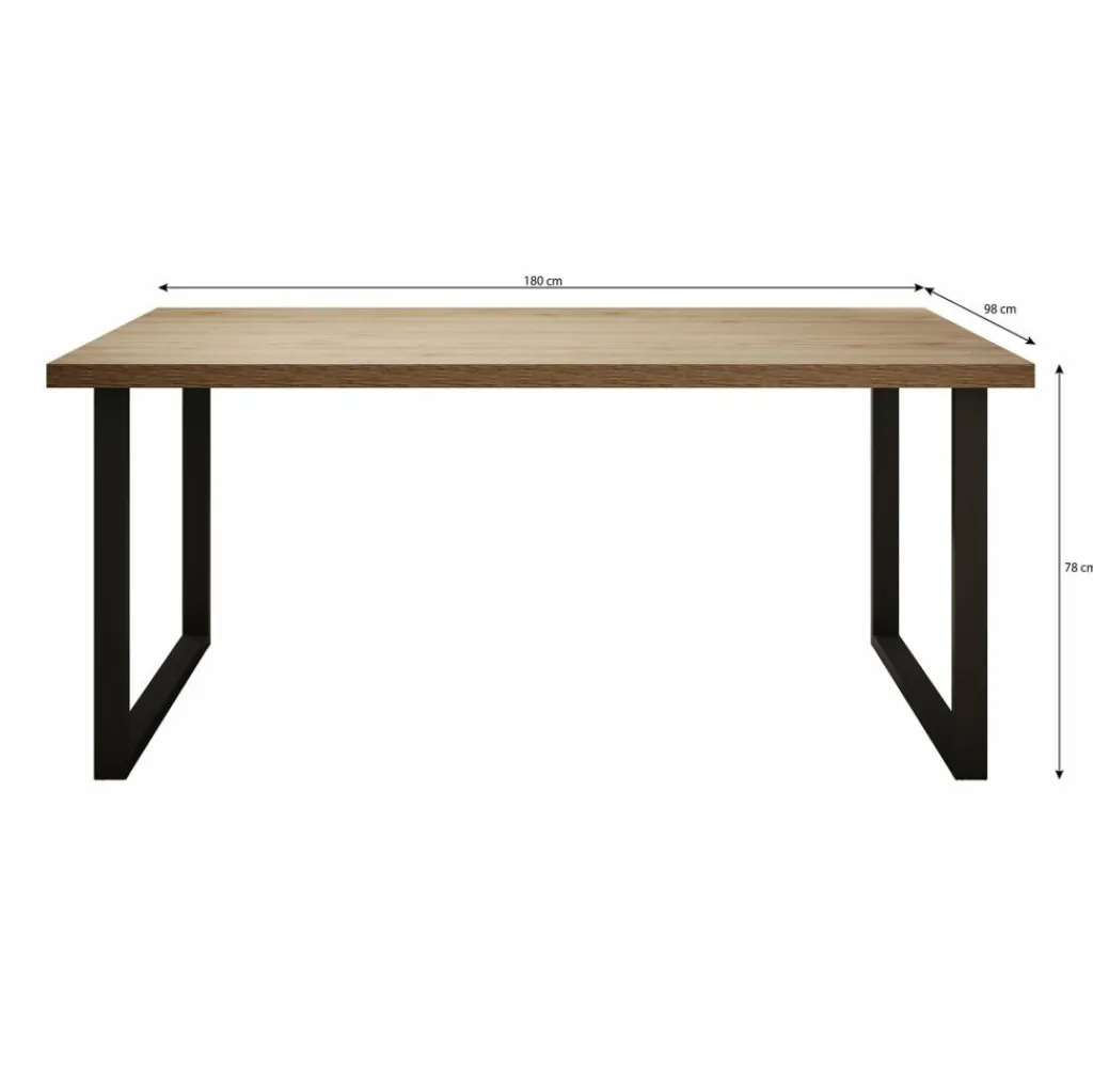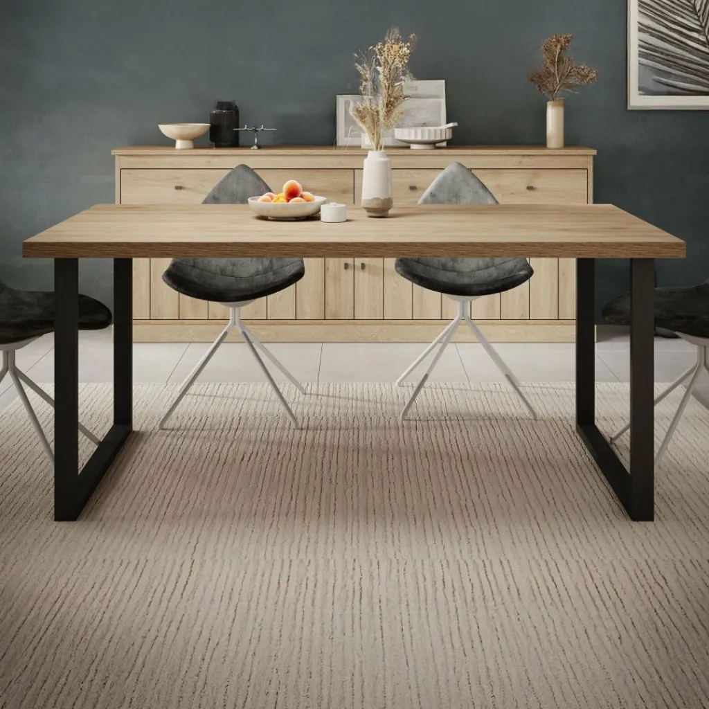 Eetkamertafel Vince is een rechthoekige eettafel uitgevoerd in een industriële stijl. Het blad is uitgevoerd in eiken kleur en is gemaakt van melamine gelamineerd spaanplaat. Het strakke metalen onderstel bestaat uit twee U-vormige poten met een zwarte coating, wat zorgt voor een stabiele constructie en een robuuste uitstraling. De tafel is geschikt voor 4 tot 6 personen.