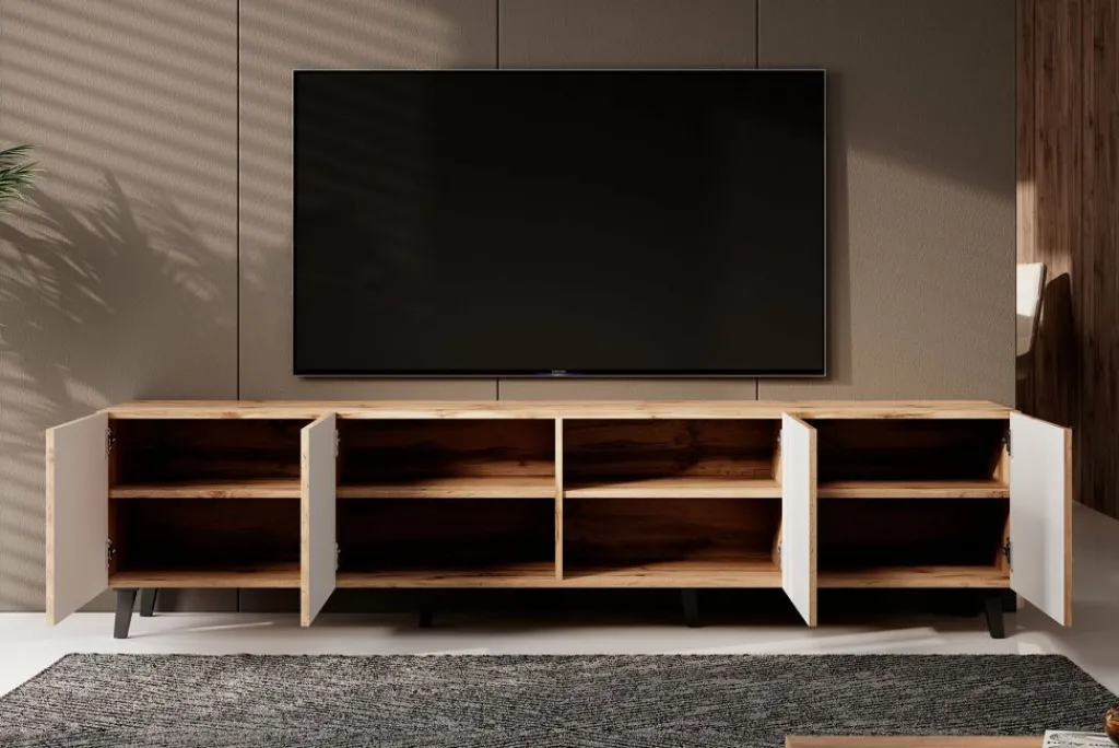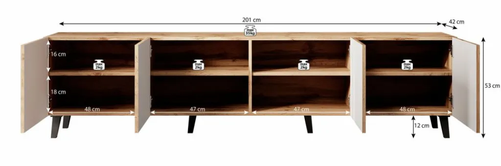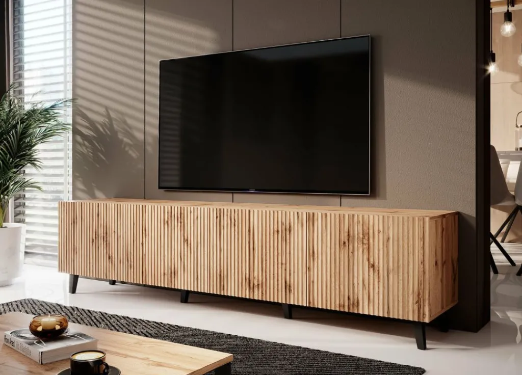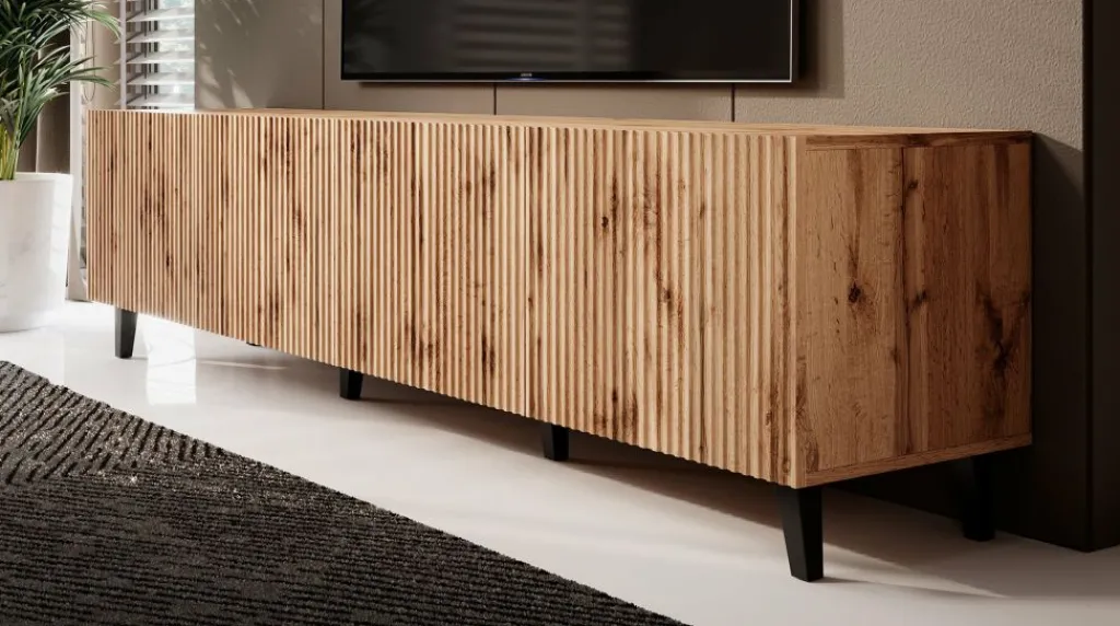 TV-meubel Vintar is een strak meubel uitgevoerd in een eiken kleur. Deze kast heeft een breedte van 201 centimeter en is gemaakt van spaanplaat. De kast beschikt over vier klepdeuren welke te openen zijn via de bovenzijde. De voorzijde van het meubel heeft een lamellen-effect. Het meubel staat op zwarte hoge pootjes. Dankzij het kleur- en materiaalgebruik is dit meubel geschikt voor zowel industriële als hotelchique interieurs.