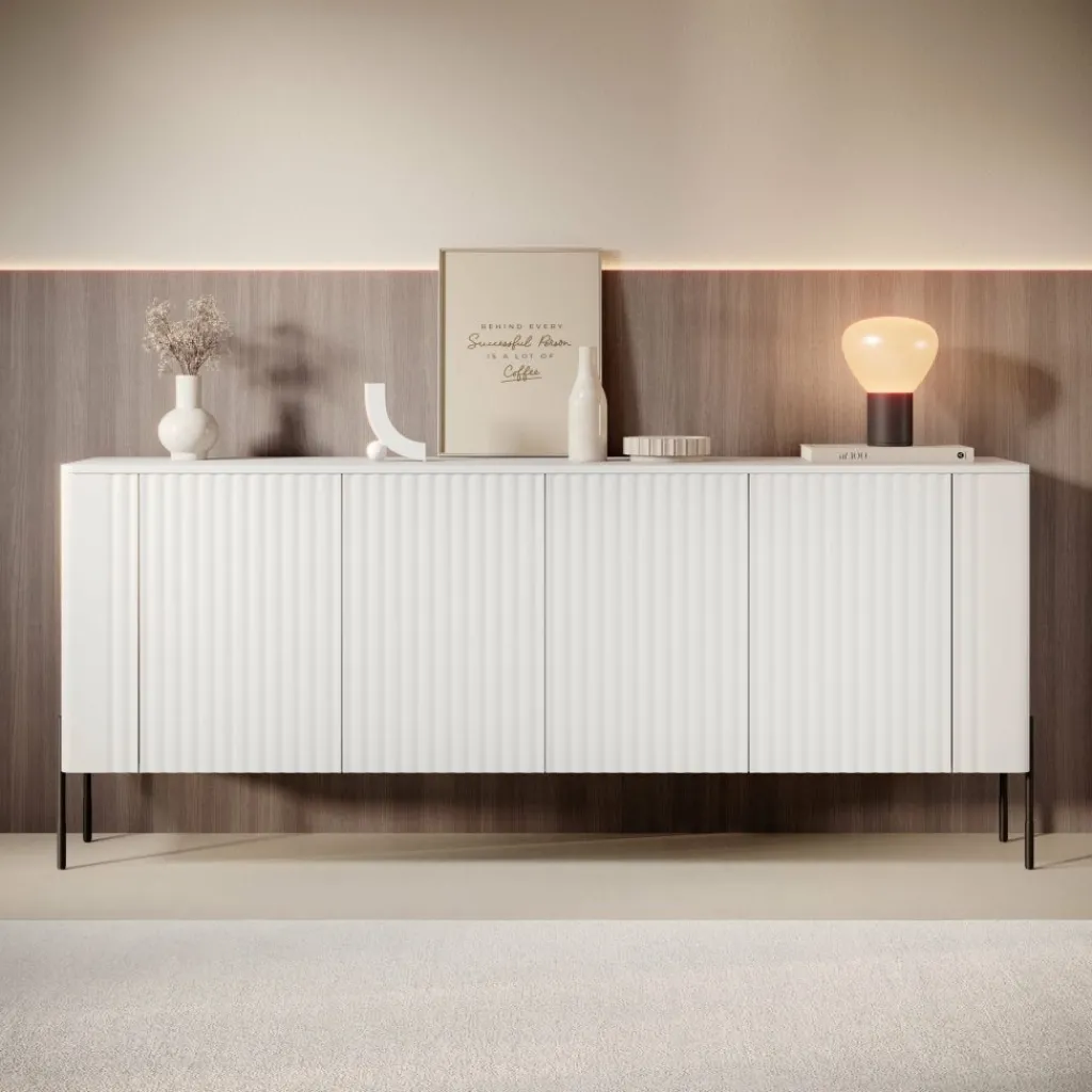 De hoge metalen poten geven het dressoir een lichte en elegante uitstraling. Door de frisse witte afwerking past dit meubel moeiteloos in uiteenlopende interieurstijlen — van modern en Scandinavisch tot minimalistisch. Een tijdloos meubel dat rust en balans brengt in elke woonruimte.