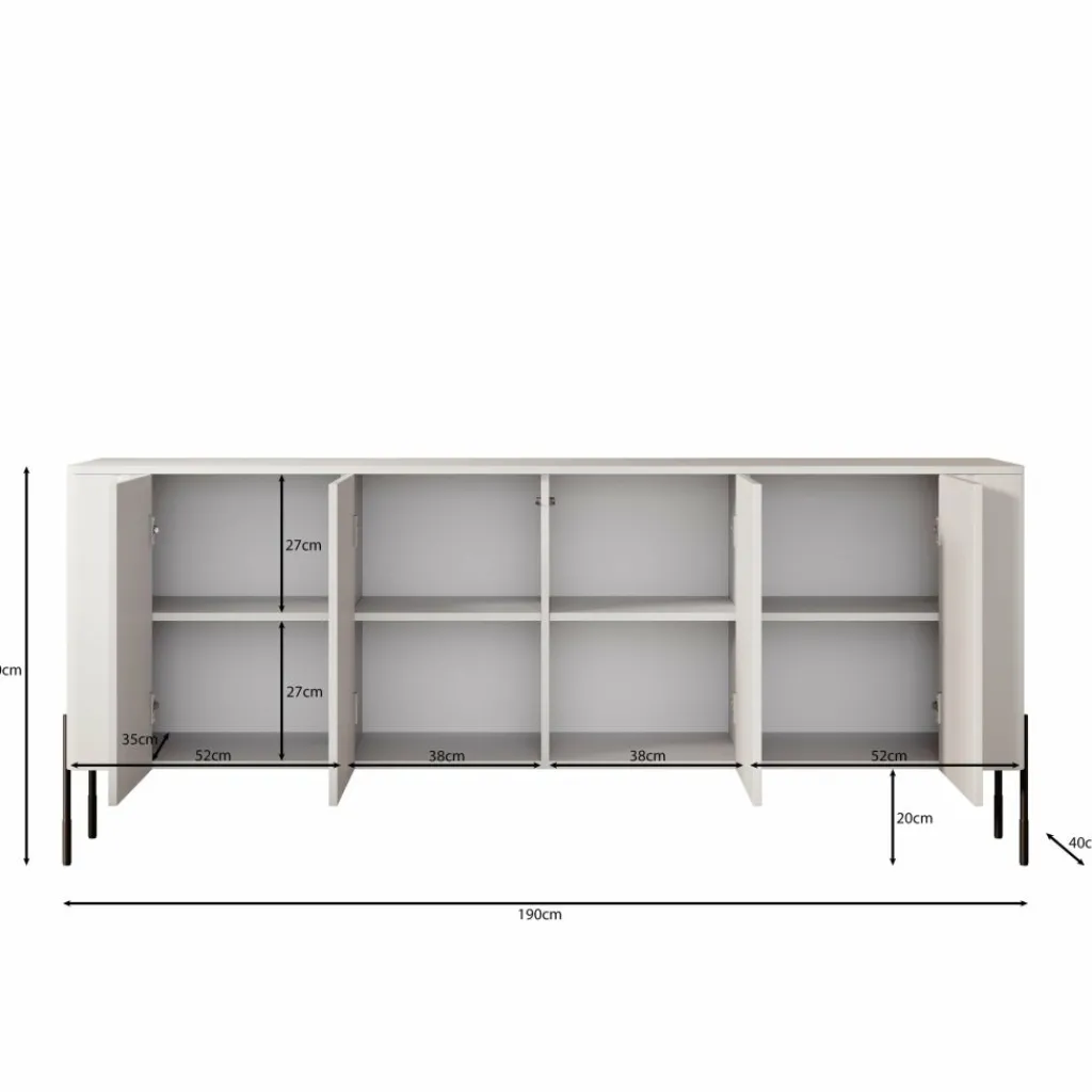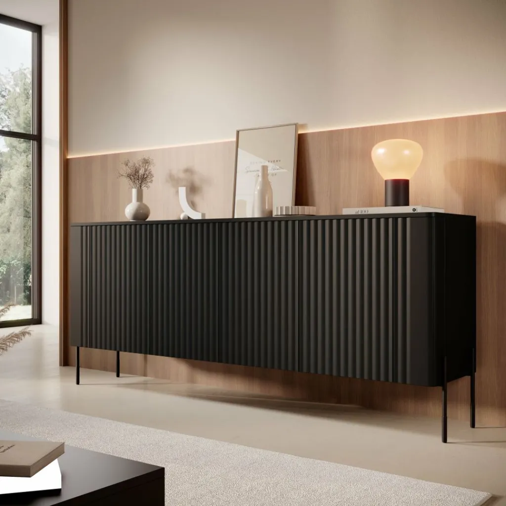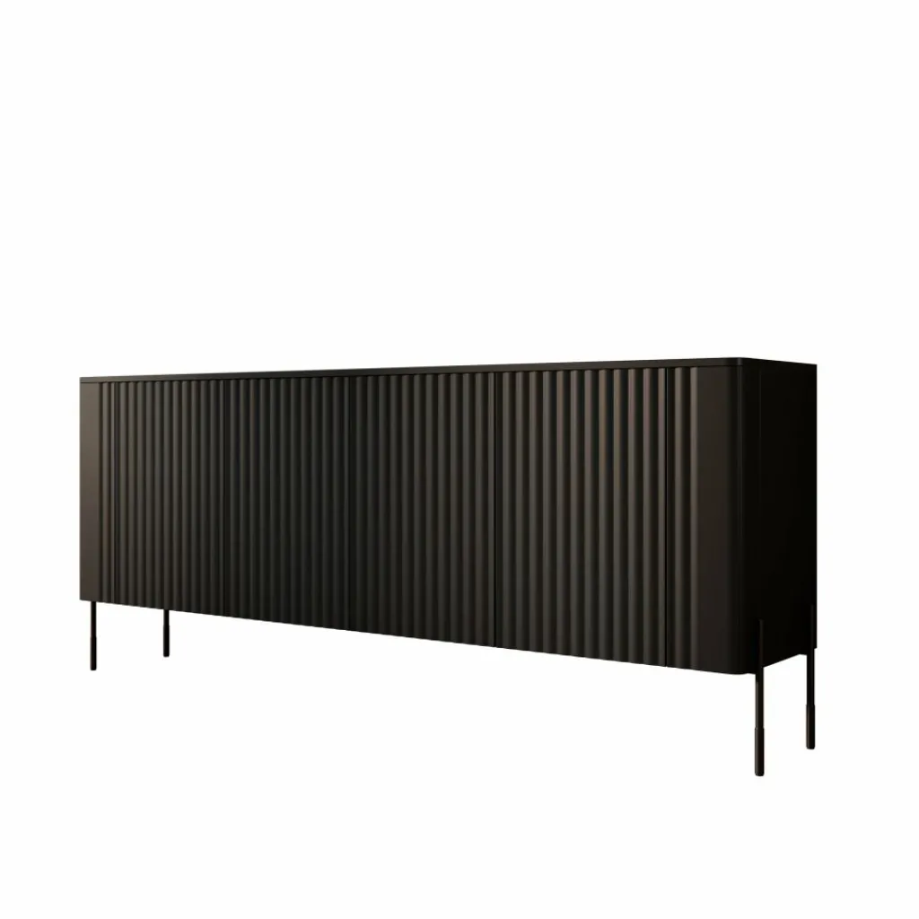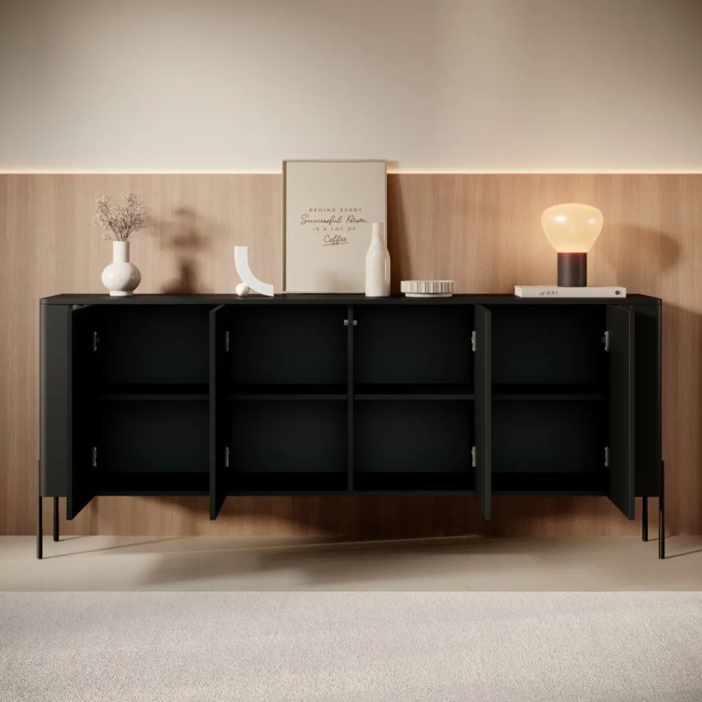 Het meubel staat op hoge, slanke poten van metaal die het ontwerp een luchtig karakter geven. De matzwarte kleur en strakke afwerking maken het dressoir geschikt voor moderne en minimalistische interieurs. Dankzij zijn lengte vormt het een elegante toevoeging aan de woonkamer of eetkamer.