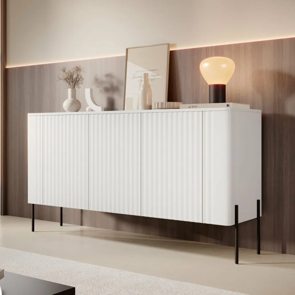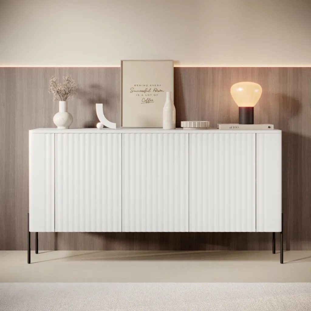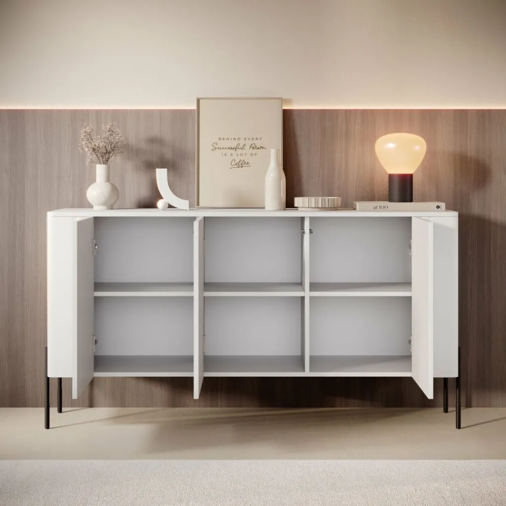 Het dressoir staat op slanke metalen poten, wat zorgt voor stabiliteit en een luchtige vorm. De witte kleur maakt het eenvoudig te combineren met verschillende materialen en stijlen, van modern tot Scandinavisch.