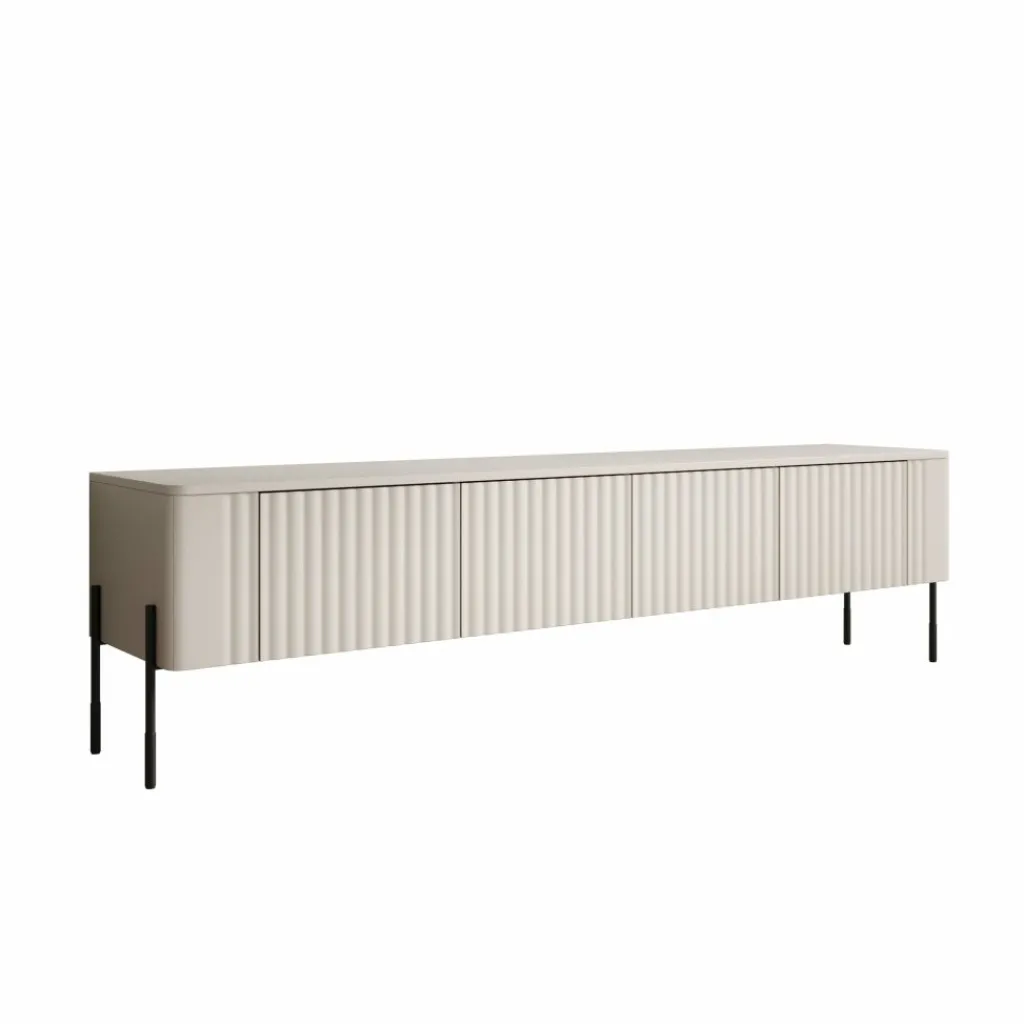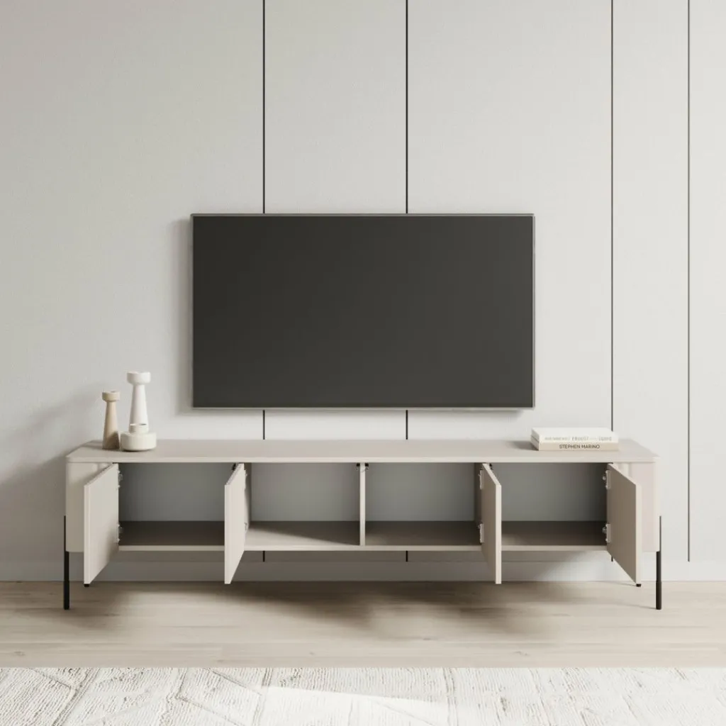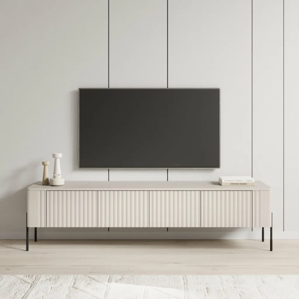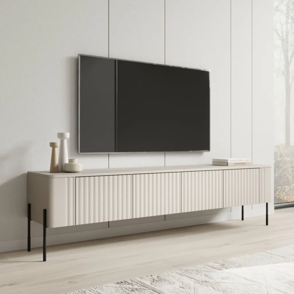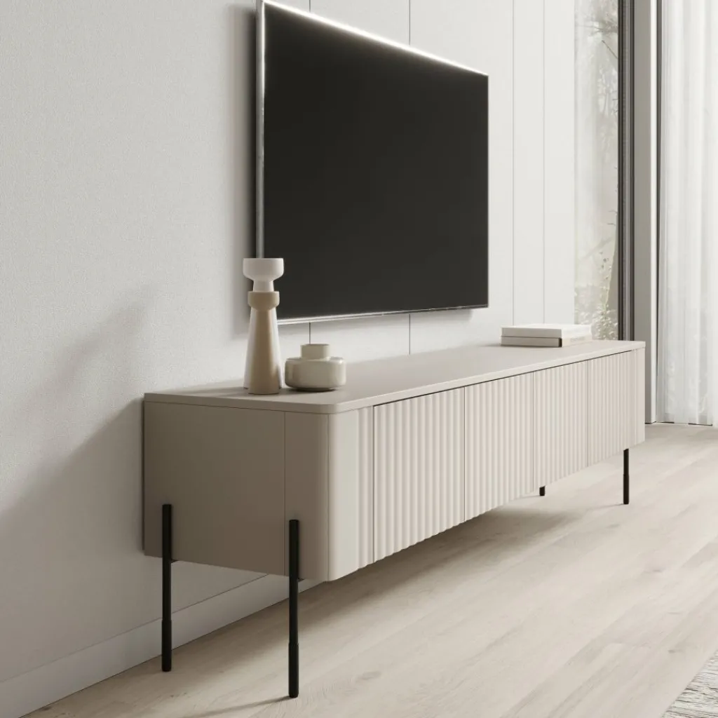 Het Vivi tv-meubel in beige combineert een moderne vormgeving met praktische opbergruimte. De verticale lijnen aan de voorzijde geven het meubel een strak en verzorgd uiterlijk. Achter de drie deuren kun je gemakkelijk apparatuur, kabels of andere items opbergen.