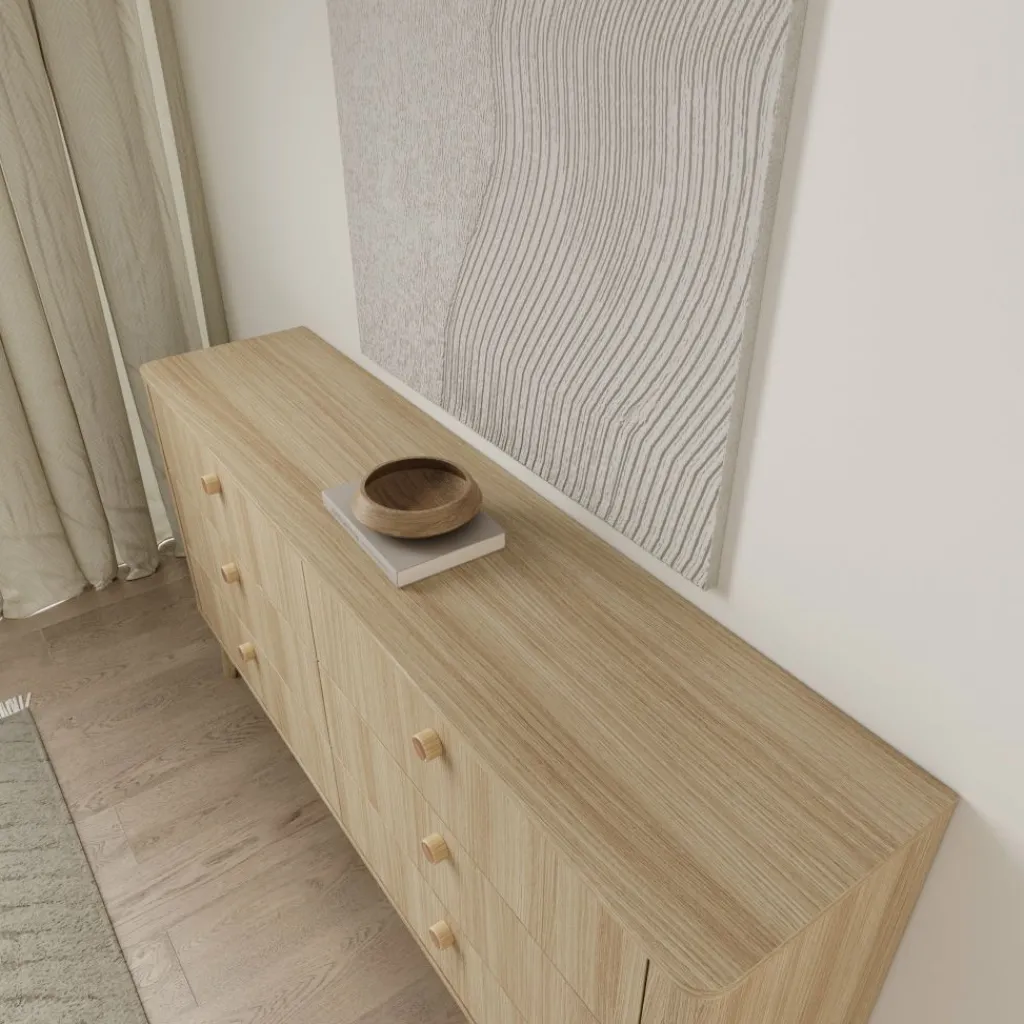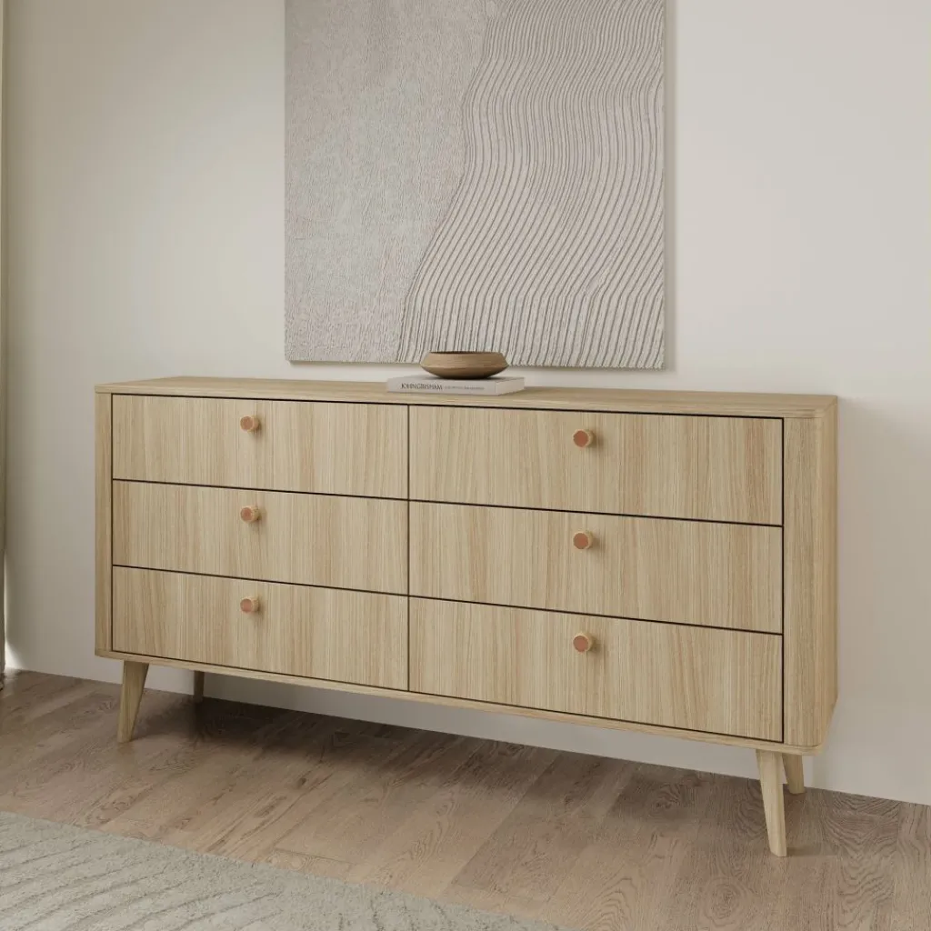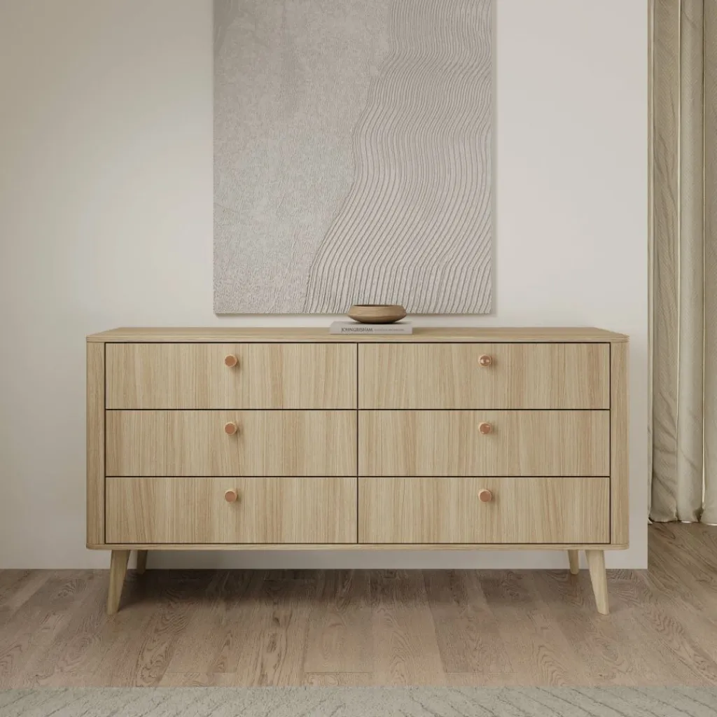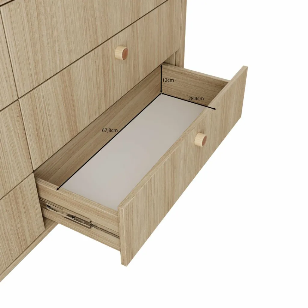 De afgeronde hoeken en taps toelopende poten geven het meubel een verfijnde, Scandinavische uitstraling. De ladegrepen in een warme houttint vormen een subtiel accent dat past binnen een licht en tijdloos interieur. Met zijn heldere eikenkleur en functionele indeling combineer je eenvoudig stijl met gebruiksgemak.