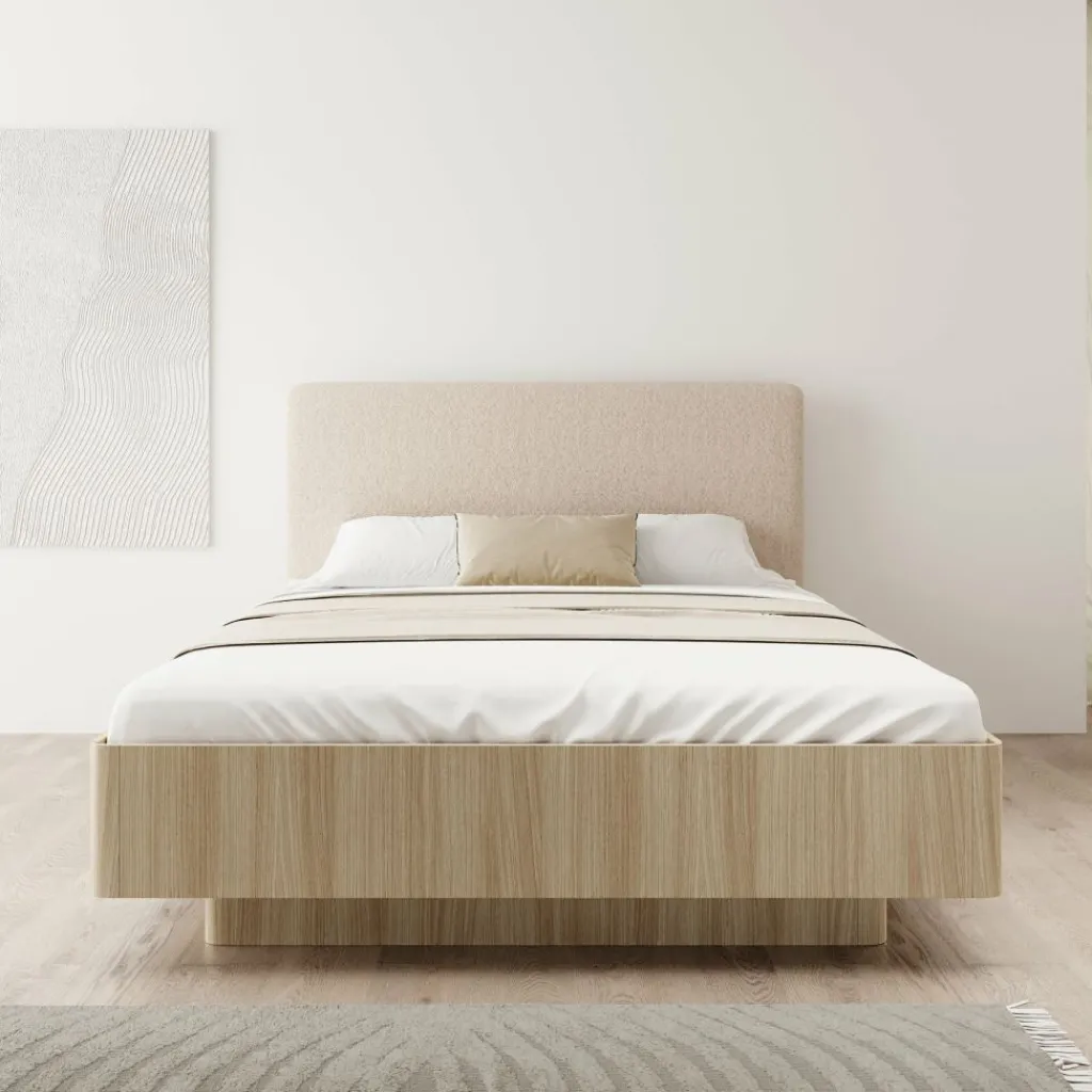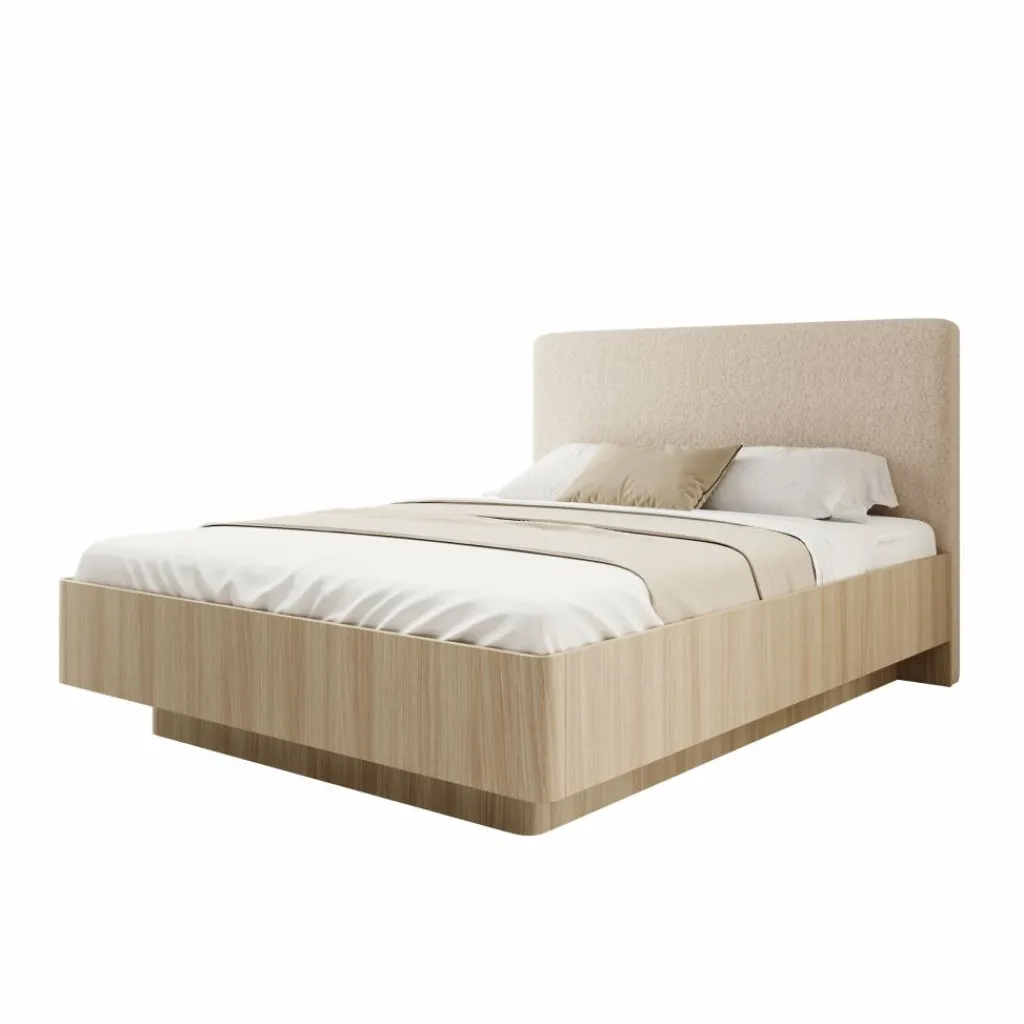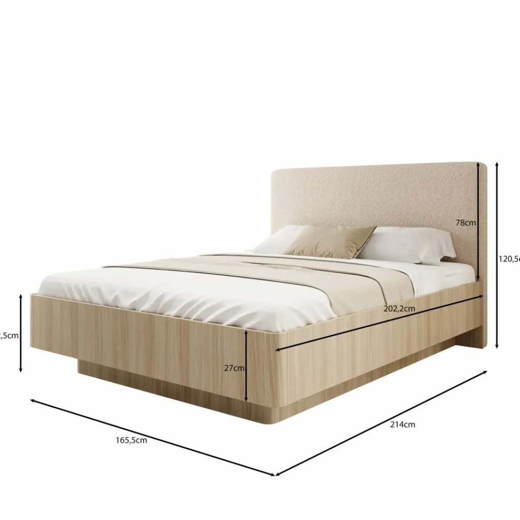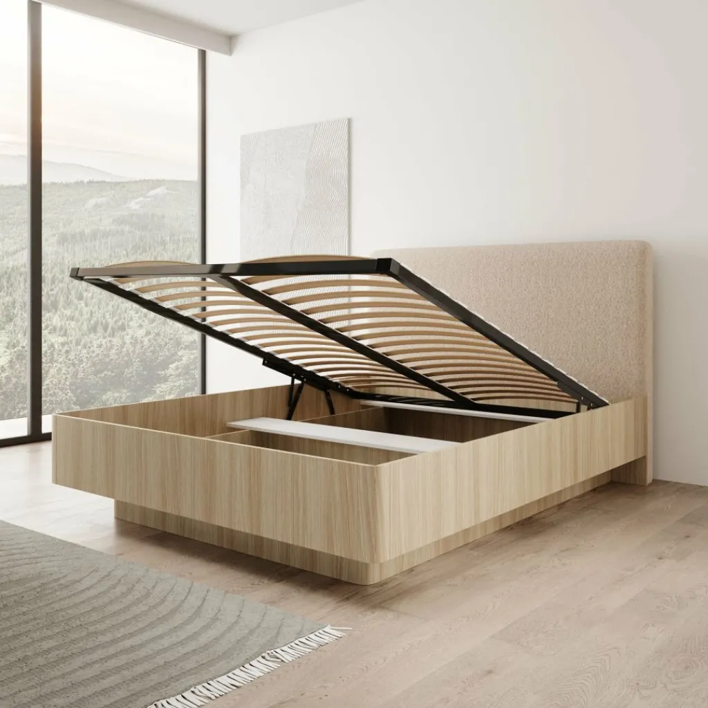 Onder het bed bevindt zich een ruime opbergruimte, handig voor het bewaren van beddengoed, kussens of seizoensartikelen. Het geïntegreerde liftmechanisme maakt het openen eenvoudig, zodat je snel toegang hebt tot de volledige ruimte zonder extra moeite. De beklede hoofdsteun biedt comfortabele ondersteuning als je graag leest of ontspant in bed.