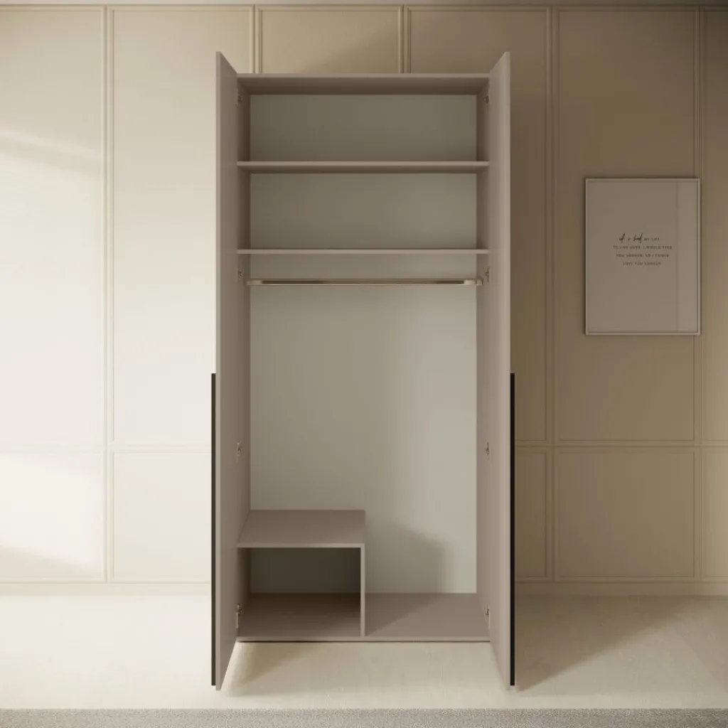 De Whenua kledingkast biedt praktische opbergruimte in een strak en tijdloos ontwerp. Achter de twee deuren vind je een overzichtelijke indeling met een kledingroede voor het ophangen van kleding, twee legplanken bovenin en extra vakken onderin voor bijvoorbeeld schoenen, tassen of opgevouwen items.