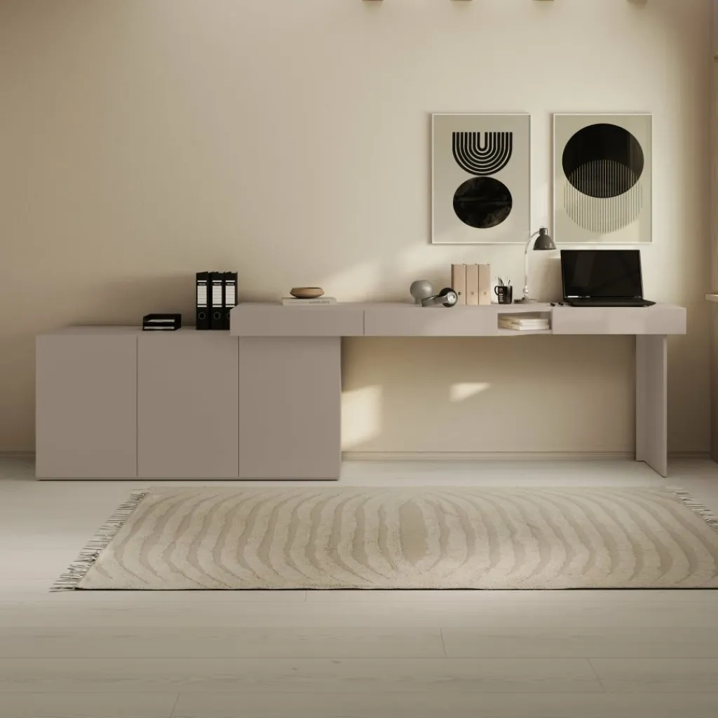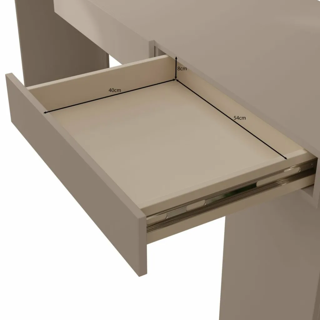 Het Whenua bureau heeft een ruim werkblad met ondersteuning aan de rechterkant. Voorzien van drie lades voor praktische opbergruimte, één deur met daarachter twee vakken en een open vak tussen de lades. De beige uitvoering is neutraal en eenvoudig te combineren met andere meubels. Geschikt voor thuiswerken en studie.