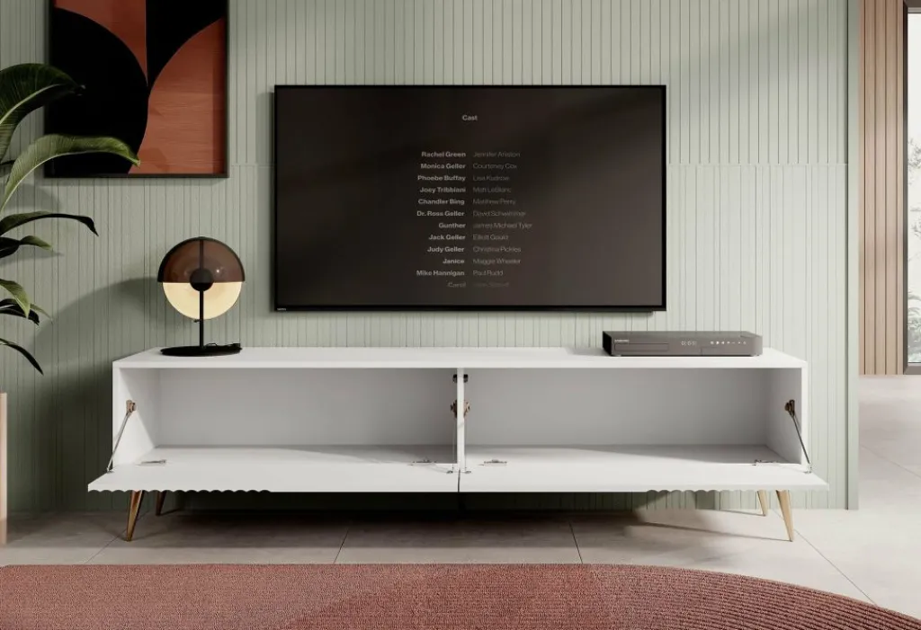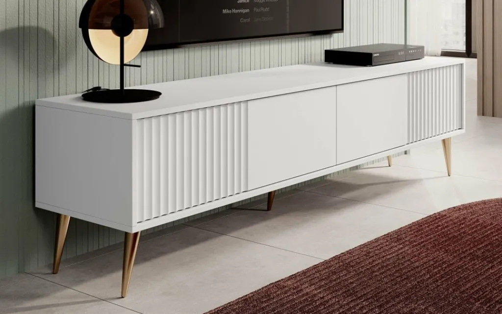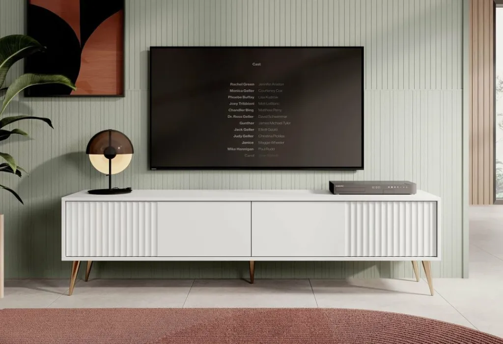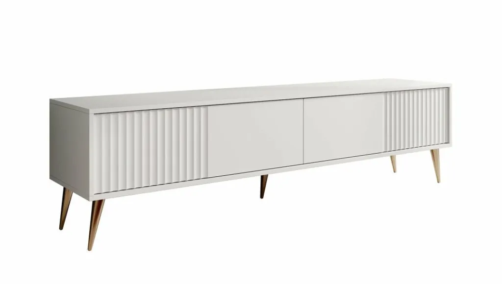 De kleppen zijn greeploos en hebben een latten patroon aan de voorzijde. Het tv-meubel staat op hoge, goudkleurige pootjes.