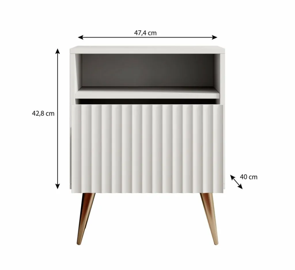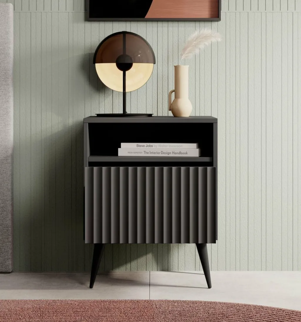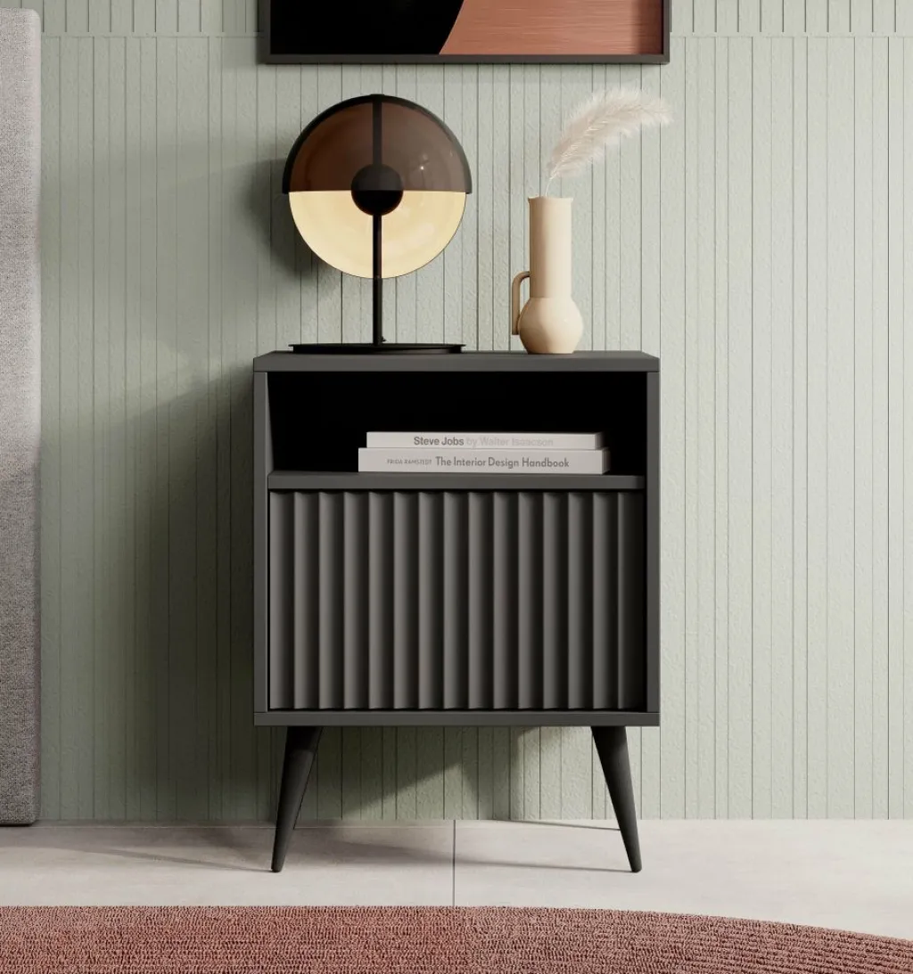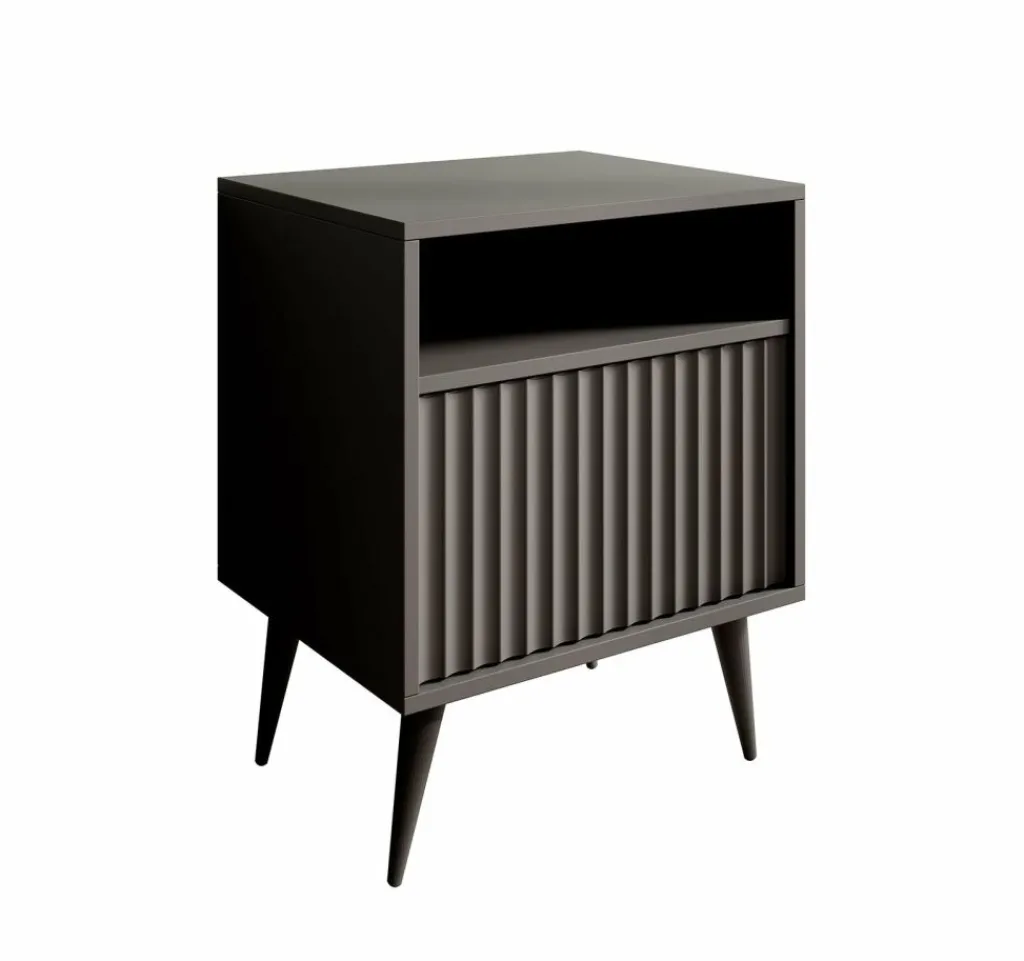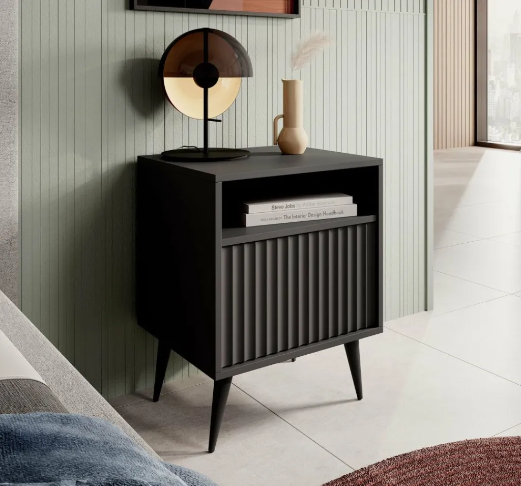 De Winq heeft 1 greeploze lade. Daarboven bevindt zich een open vak. Het nachtkastje staat op hoge, zwarte pootjes.
