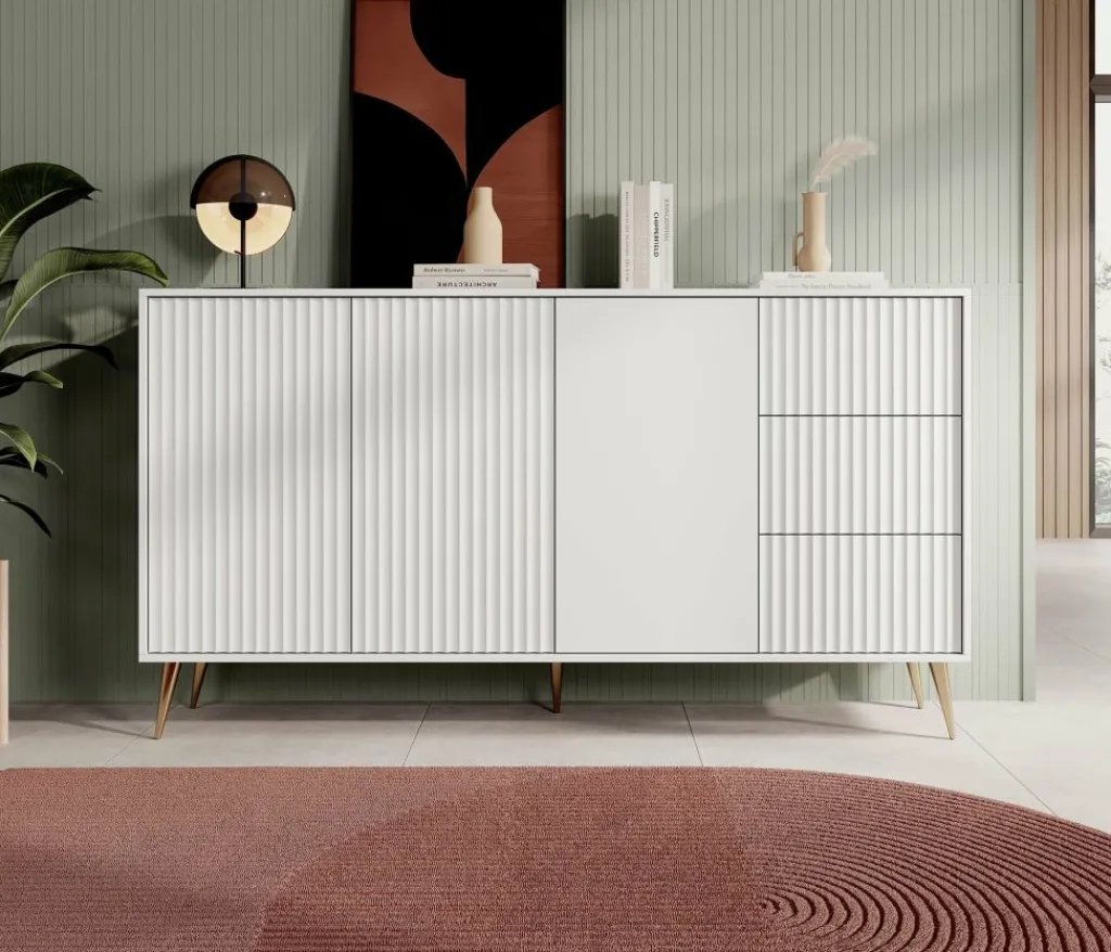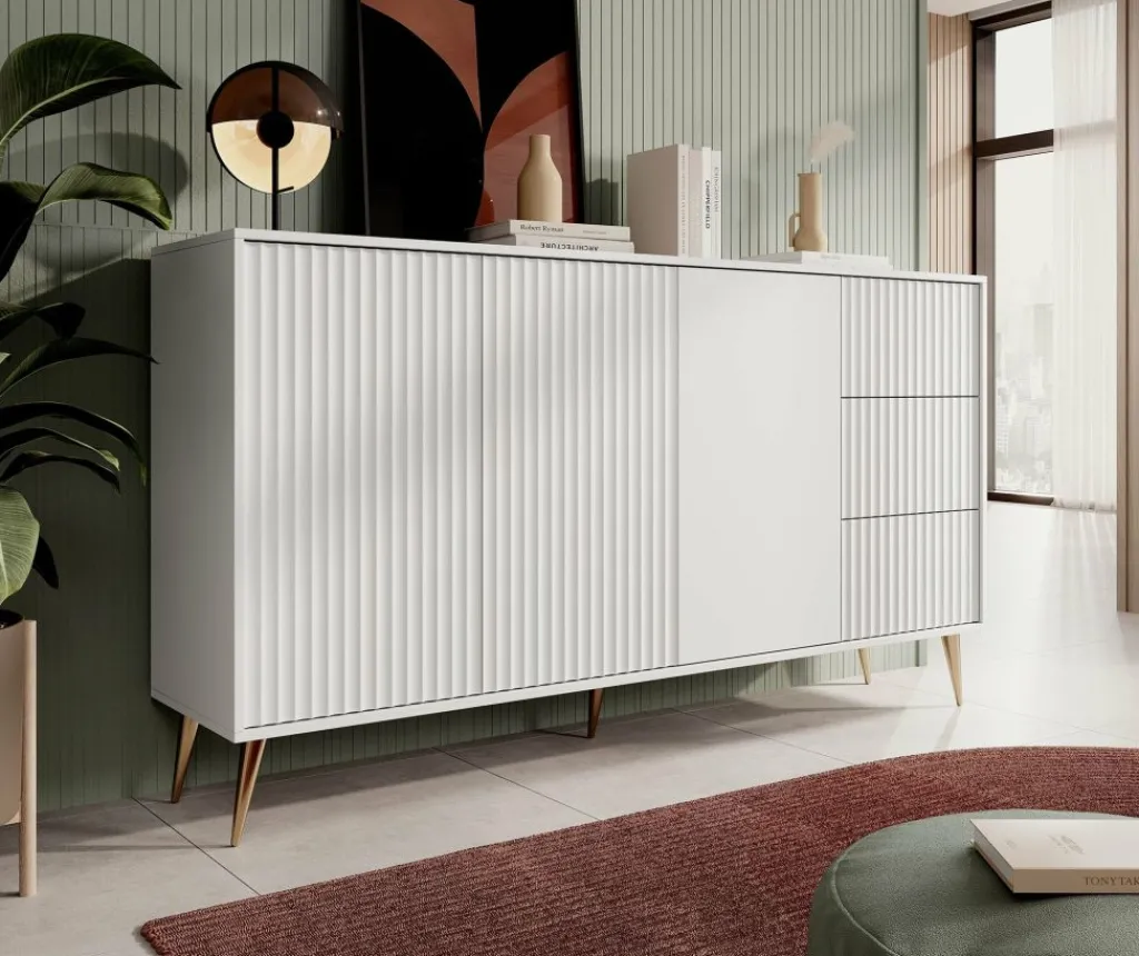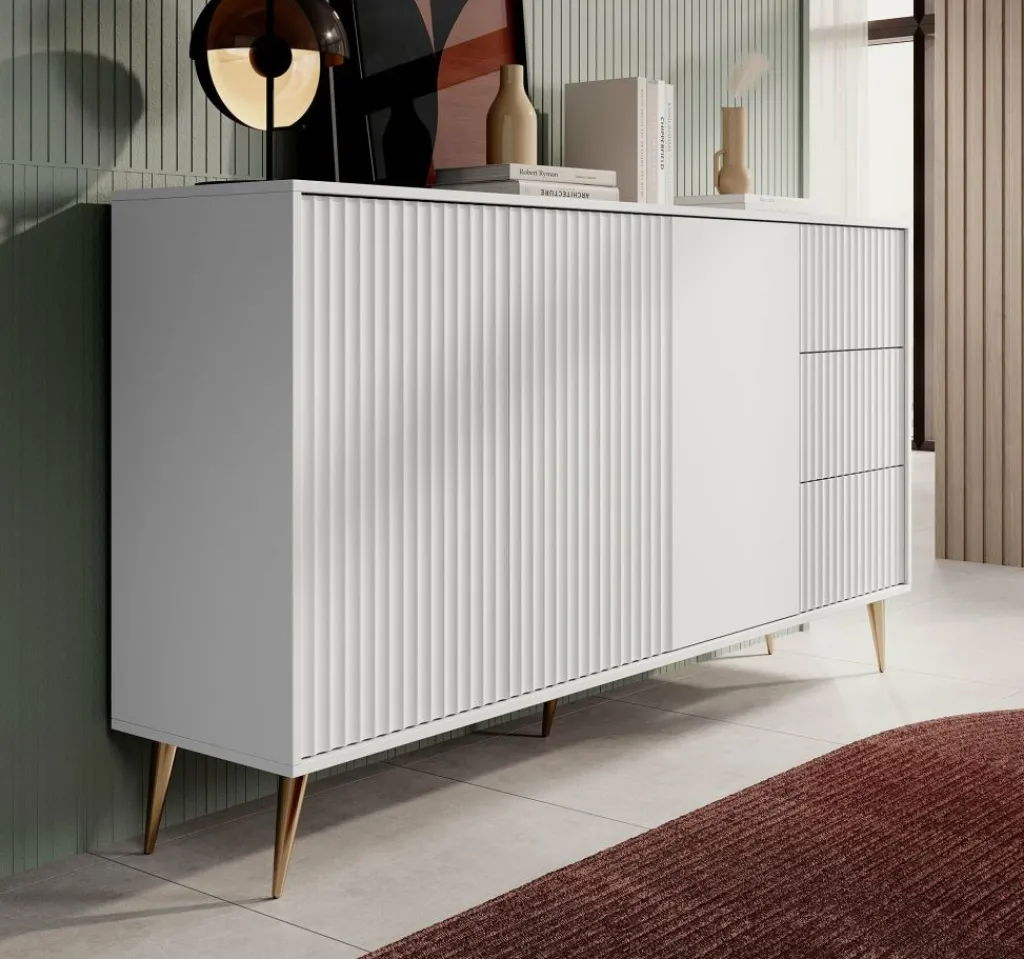 De kast heeft 3 deuren met daarachter vier opbergvakken. Daarnaast zitten 3 lades. De deuren en lades zijn greeploos.De voorkant van de deuren hebben een latten patroon.