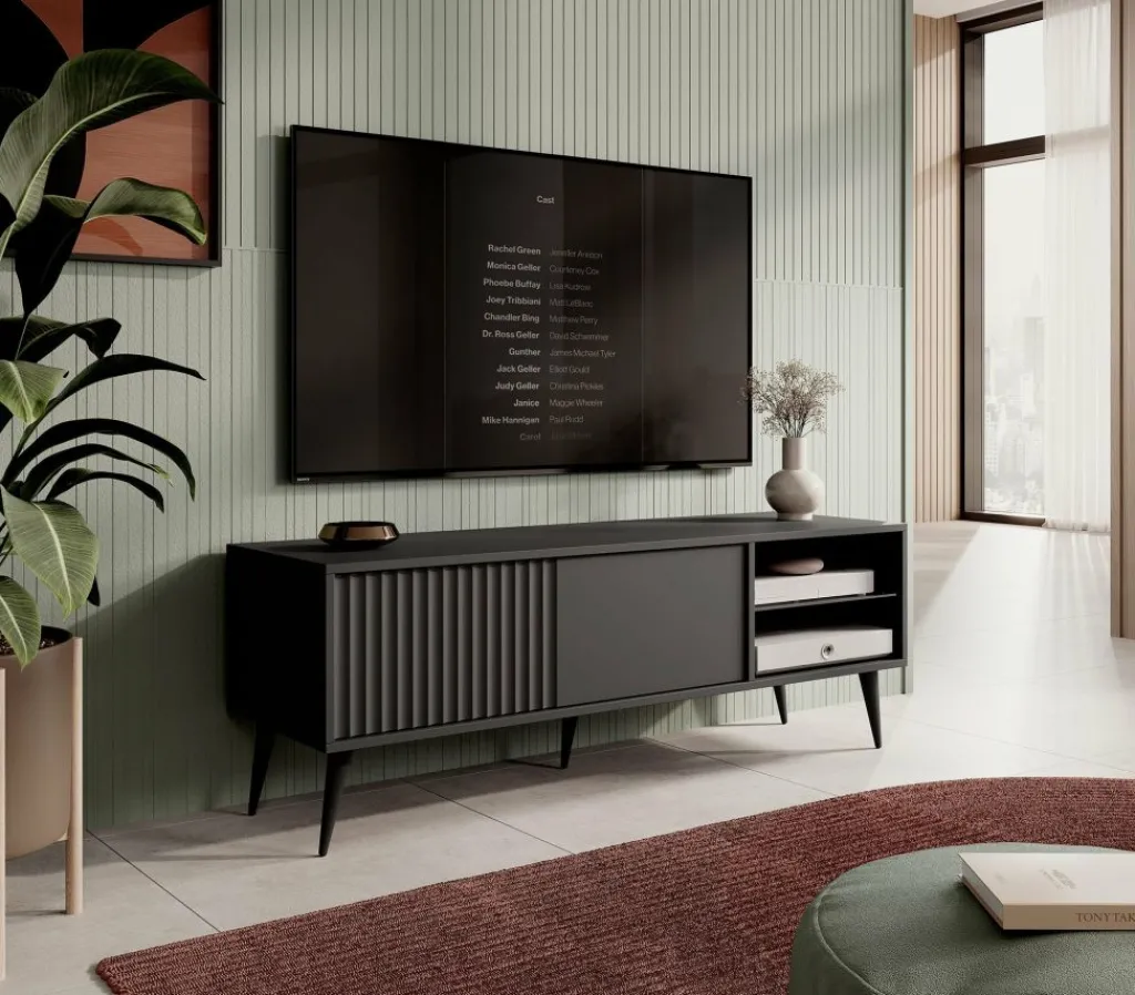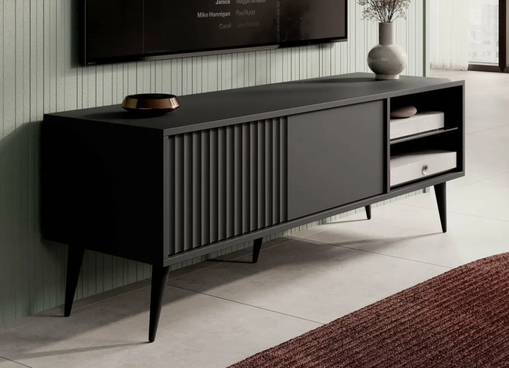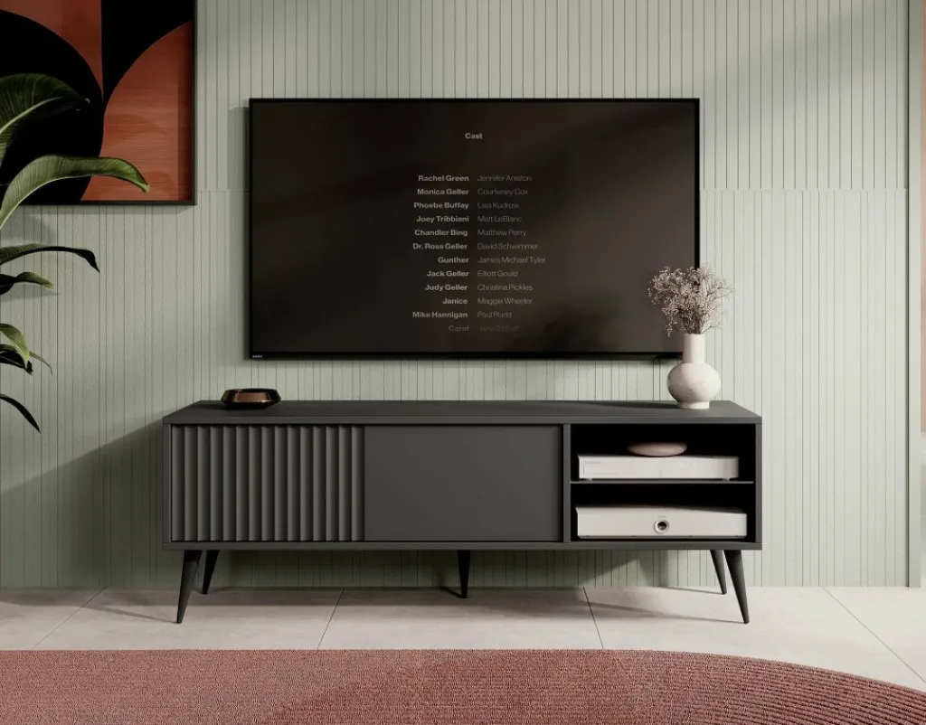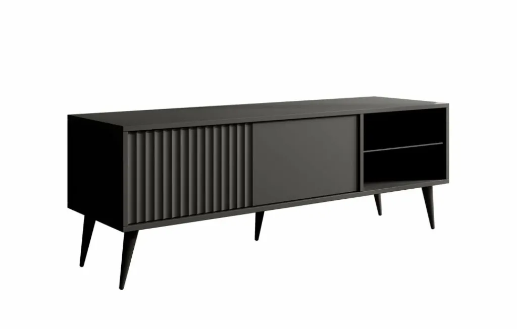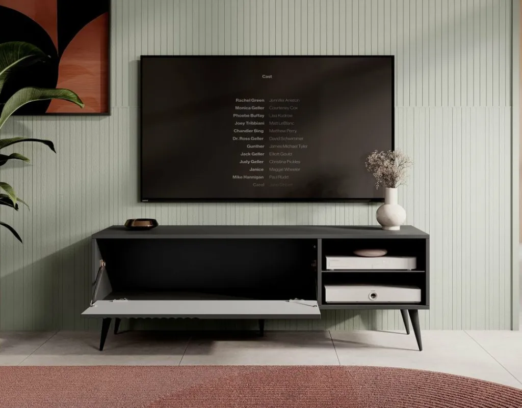 De klep is greeploos en heeft een latten patroon aan de voorzijde. Het tv-meubel staat op hoge, zwarte pootjes.