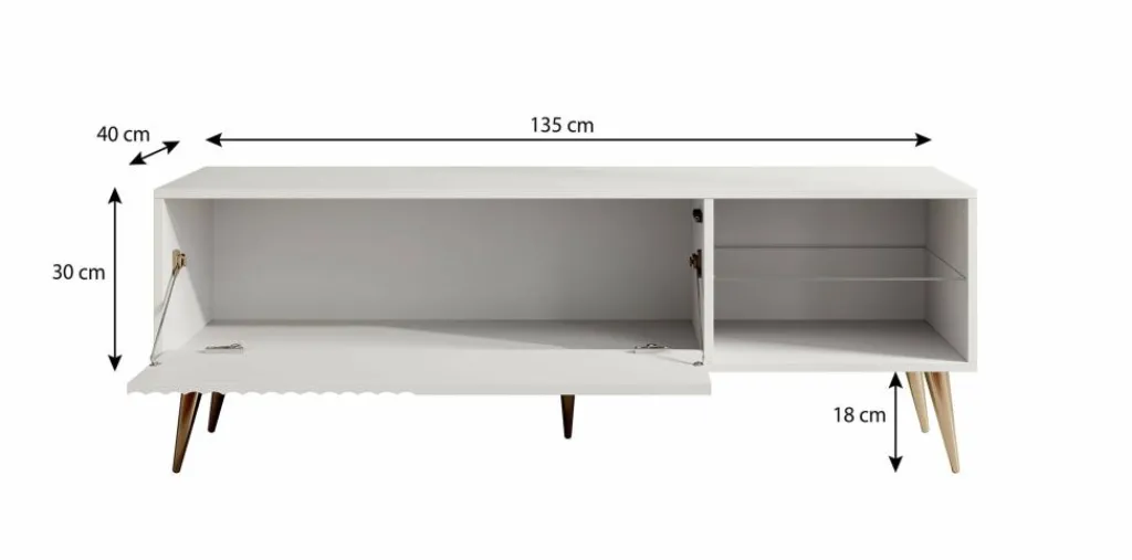 TV-Meubel Winq heeft 1 klep met daarachter een groot opbergvak. Daarnaast zitten 2 open vakken met een glasplaat.
