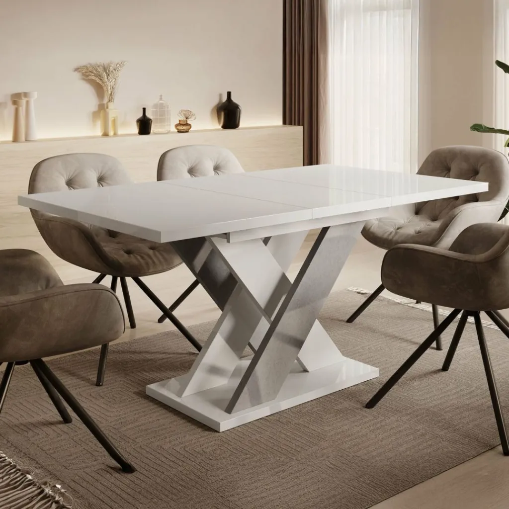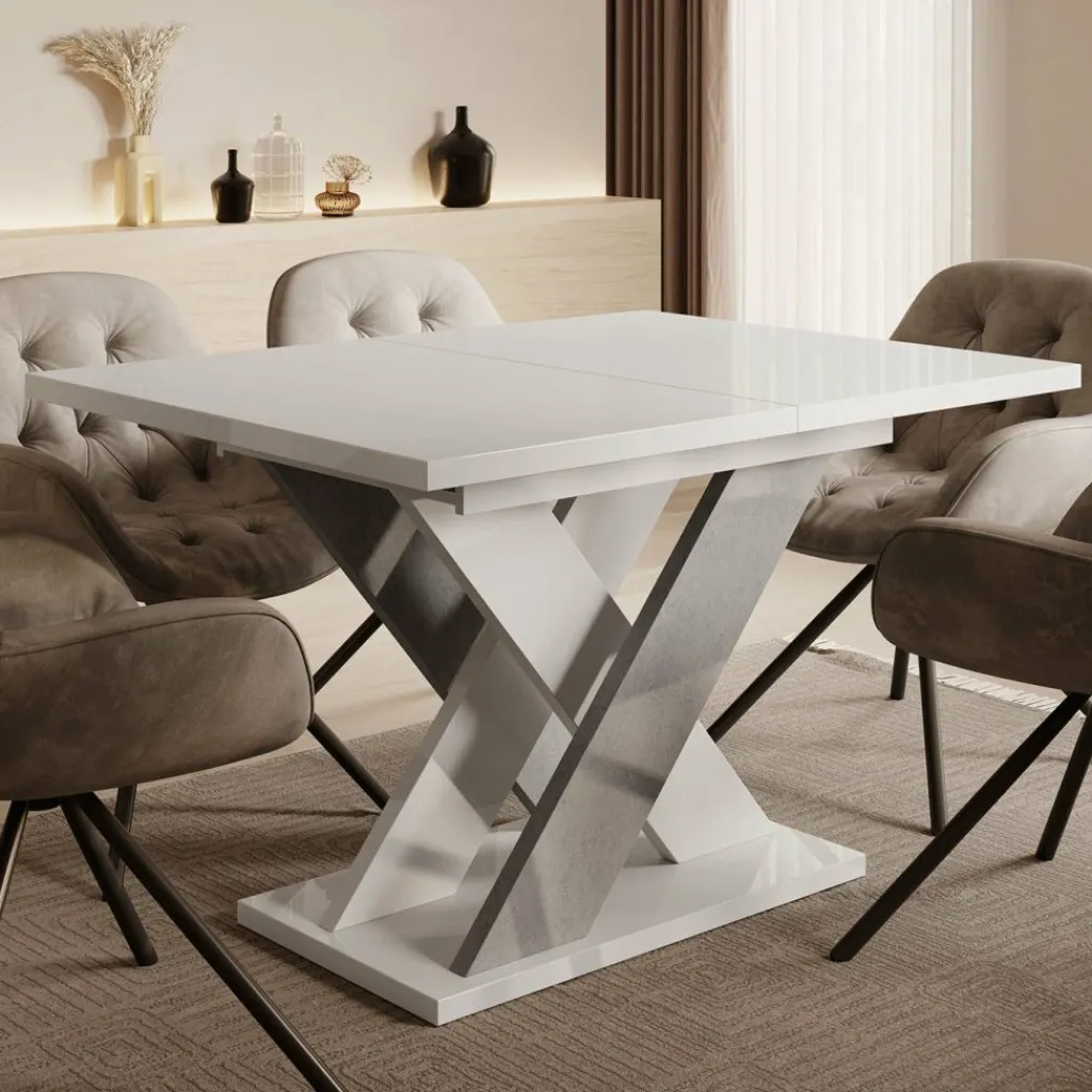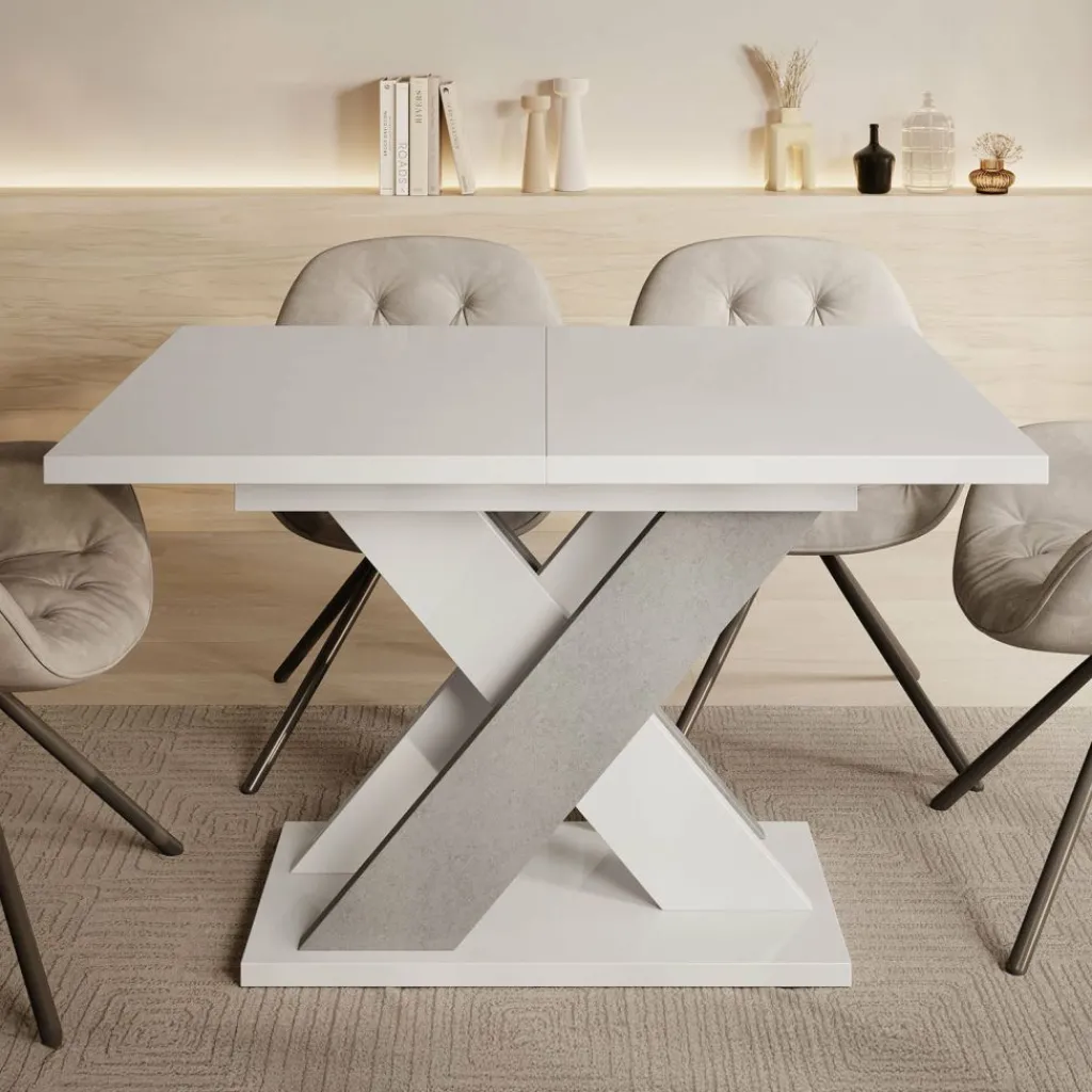 Het uitschuiven van de tafel werkt als volgt: in het frame zit een rails waaraan de twee uiteinden van de tafel zijn bevestigd. Je trekt beide uiteinden een beetje naar buiten en haalt het middenstuk ertussenuit. Dit deel kan je opbergen in de ruimte onder het tafelblad. Vervolgens duw je de twee uiteinden weer naar het midden en bevestigt deze aan elkaar d.m.v. de haakjes onder het tafelblad.