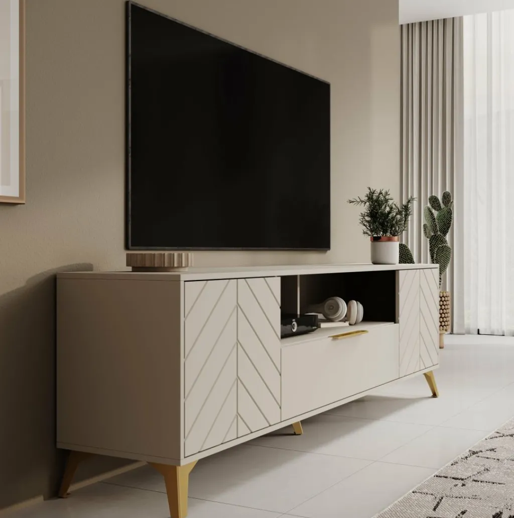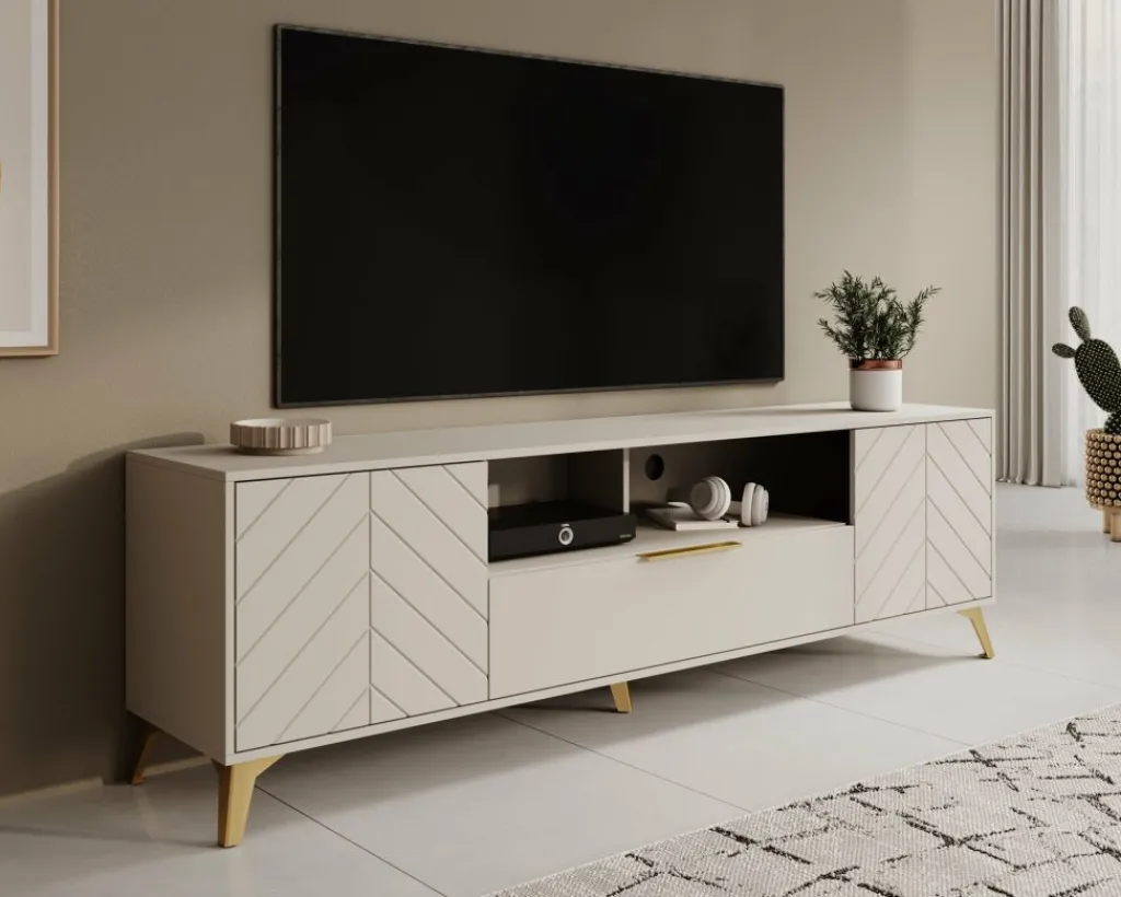 TV-Meubel Xiano is een moderne tv-kast uitgevoerd in beige. De poten zijn gemaakt van metaal in de kleur goud. Het meubel beschikt over 2 deuren en 1 lade. De deuren hebben op de voorkant een visgraat patroon en openen met het push to open systeem. De lade opent met een goudkleurige handgreep en heeft 2 vakken. Boven de lade zijn nog 2 open vakken te vinden. In de achterwand zitten 2 uitsparingen om eventuele bedrading te kunnen wegwerken.