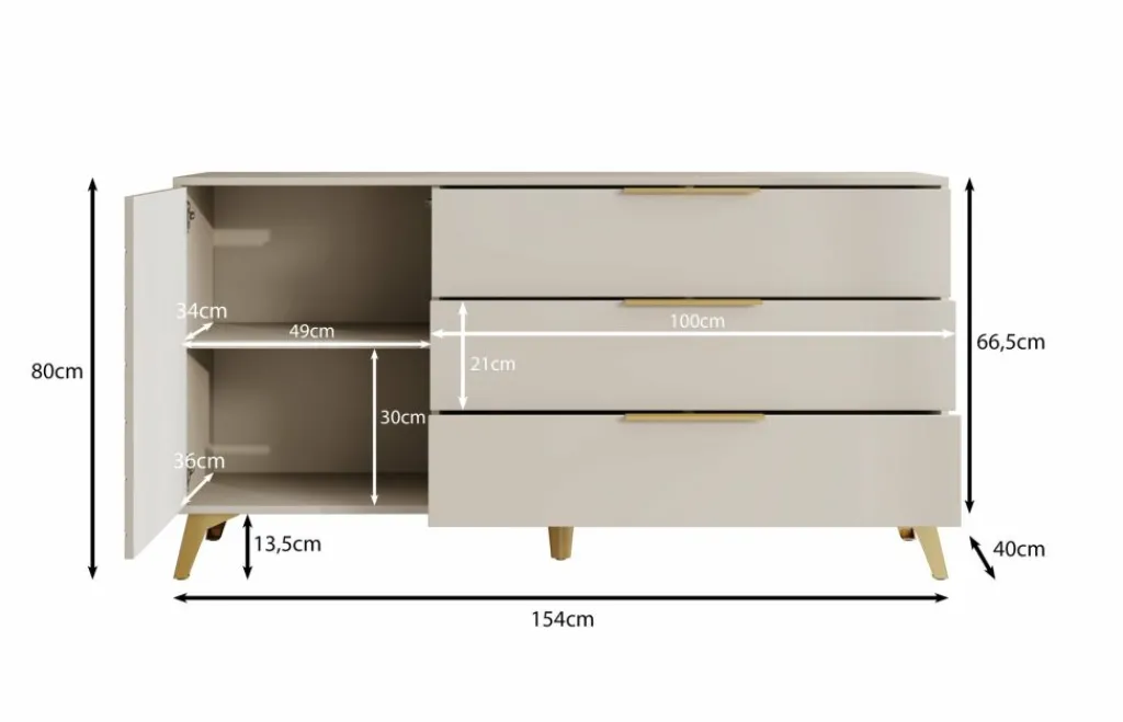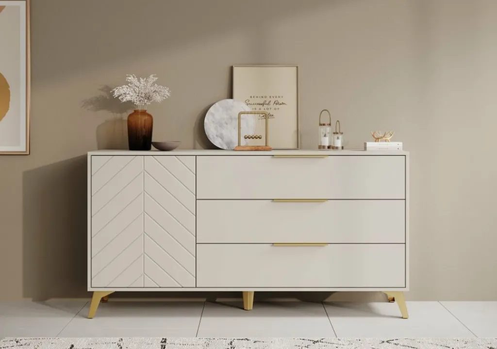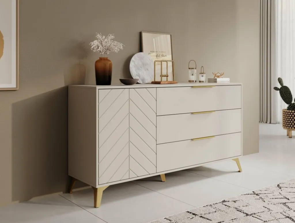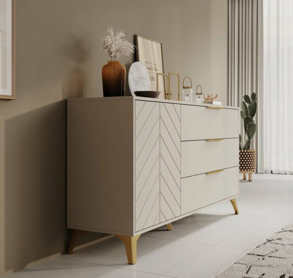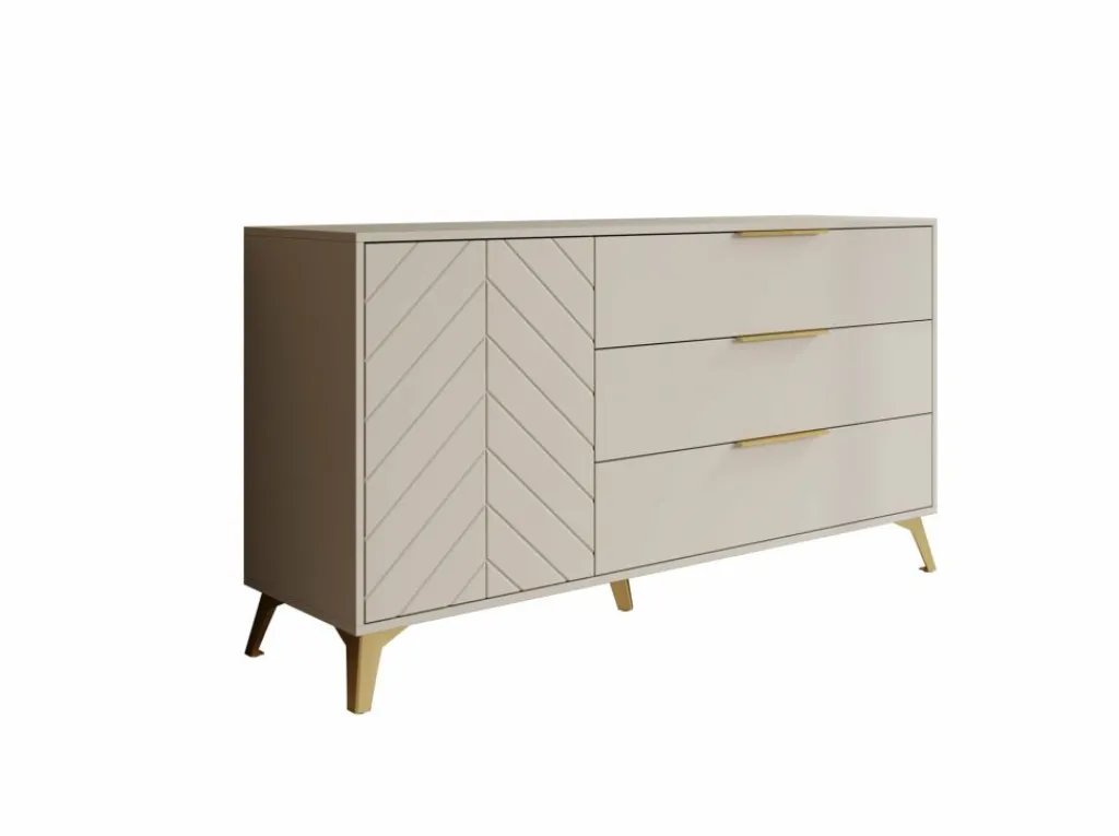 Dressoir Xiano is een opbergkast in een moderne stijl. De kast beschikt over 1 deur en 3 lades. De deur opent met het push to open systeem en de lades met goudkleurige handgrepen. De deur heeft op de voorkant een visgraat patroon en hierachter zitten nog 2 opbergvakken. De kast is uitgevoerd in een beige kleur met goudkleurige poten. Deze poten zijn gemaakt van metaal.