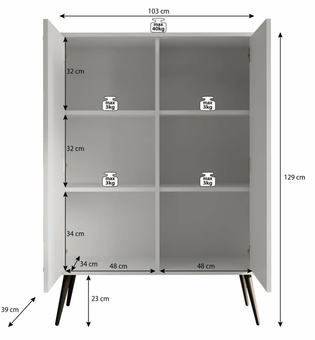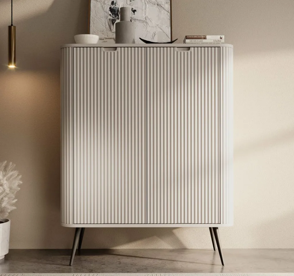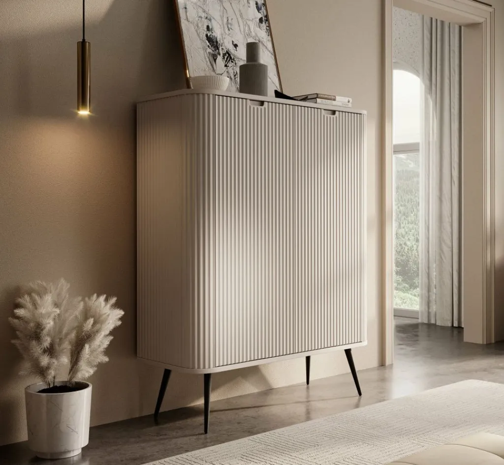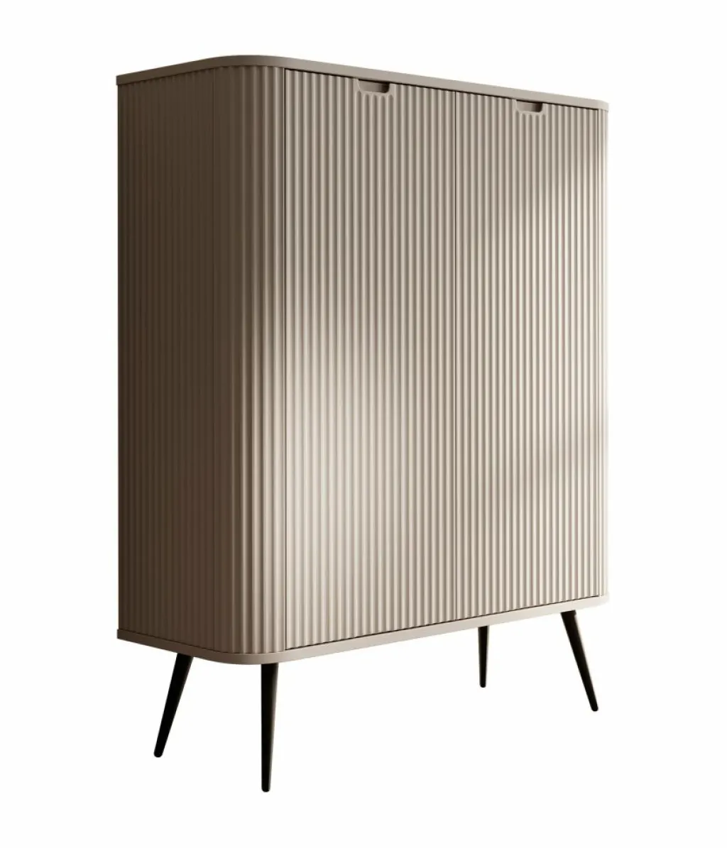 Dressoir Zakari is een moderne designkast, uitgevoerd in een beige kleur. De kast beschikt over twee deuren met daarachter 6 opbergvakken. De deuren openen door middel van inkepingen aan de bovenkant. De kast staat op hoge zwarte pootjes, gemaakt van metaal. Door het strakke en eenvoudige design is dit meubel vooral passend binnen een industriële en hotelchique woonstijl.
