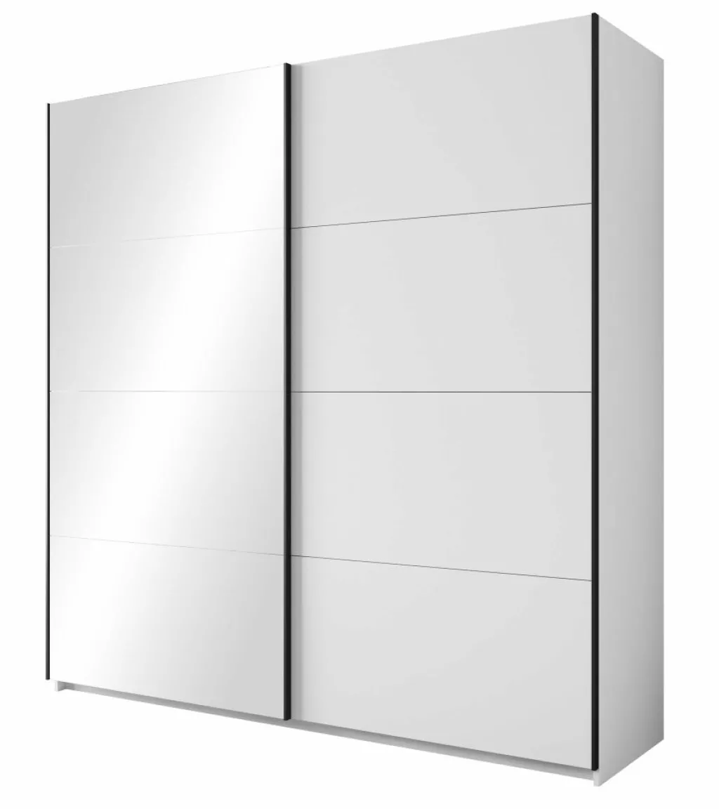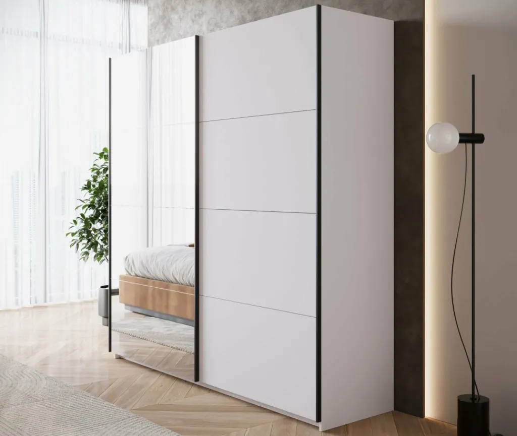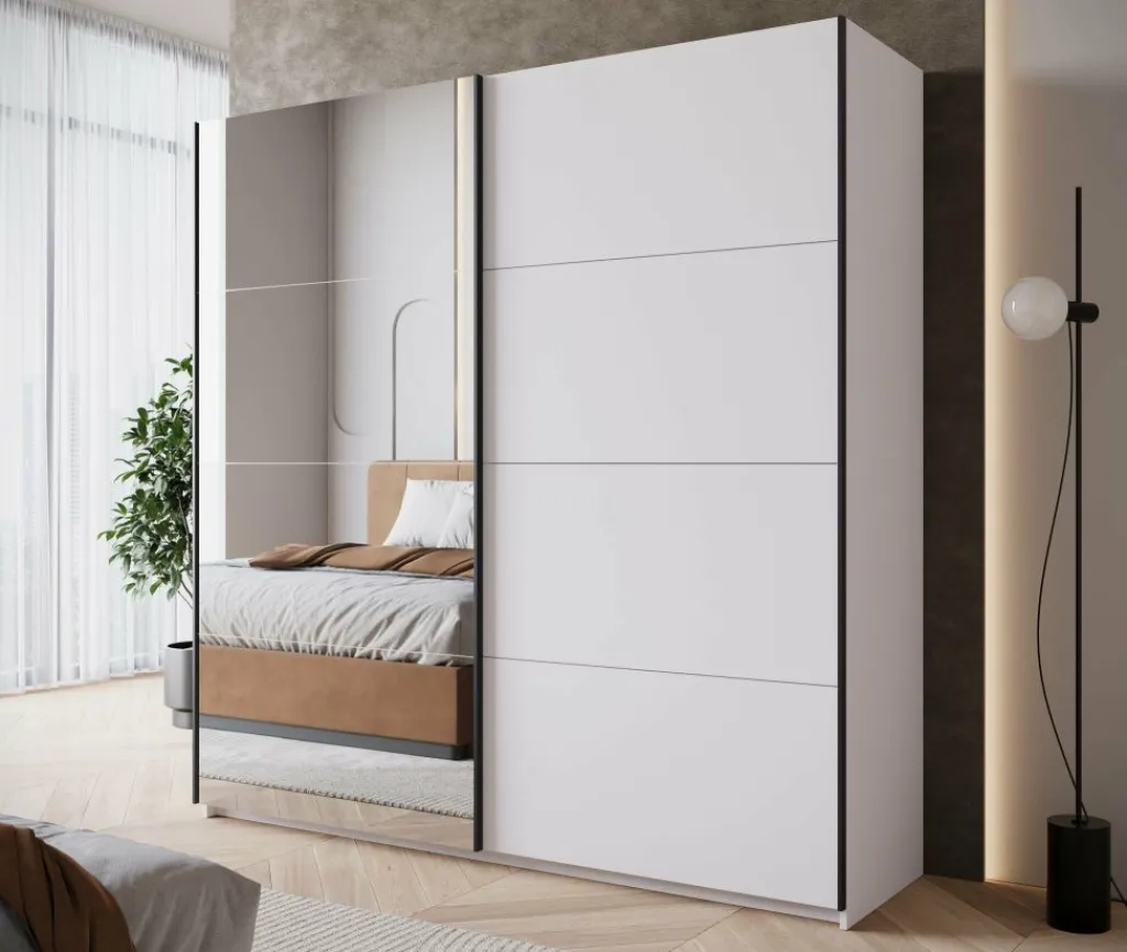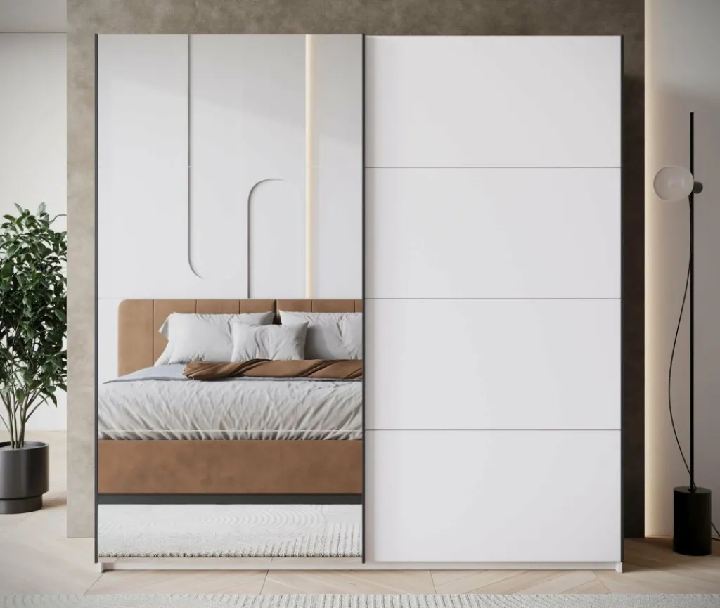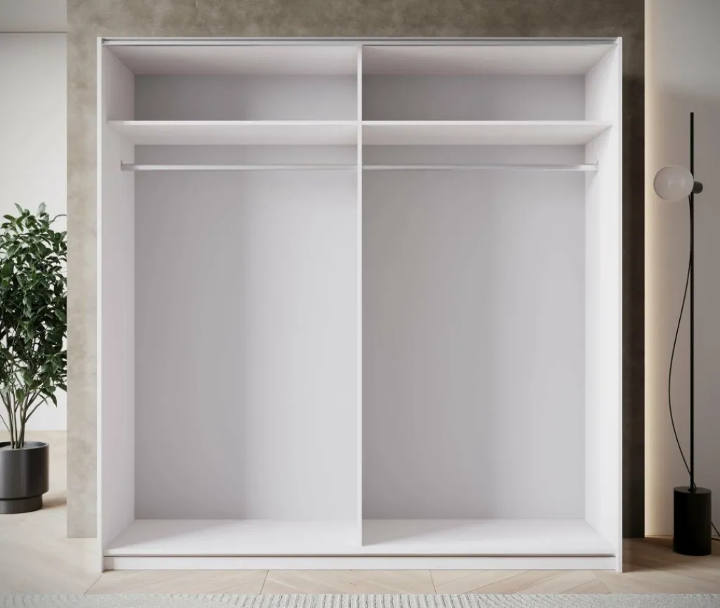 De kledingkast Zapata combineert moderne vormgeving met slimme indeling. Deze witte garderobekast van 200 cm breed heeft twee schuifdeuren zonder grepen, wat zorgt voor een rustige uitstraling in de slaapkamer. Eén van de deuren is uitgerust met een grote spiegel – handig bij het aankleden én optisch vergrotend voor de ruimte.