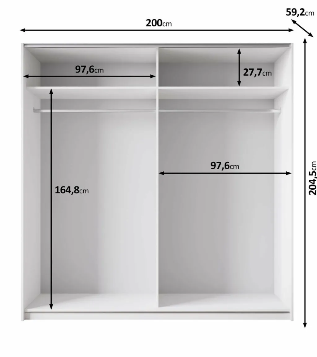 Achter de deuren vind je twee royale hanggedeeltes met kledingroedes en daarboven twee ruime legplanken. Ideaal om kleding, beddengoed of dozen overzichtelijk op te bergen. Dankzij de schuifdeuren blijft de kast ook in kleinere kamers praktisch in gebruik.