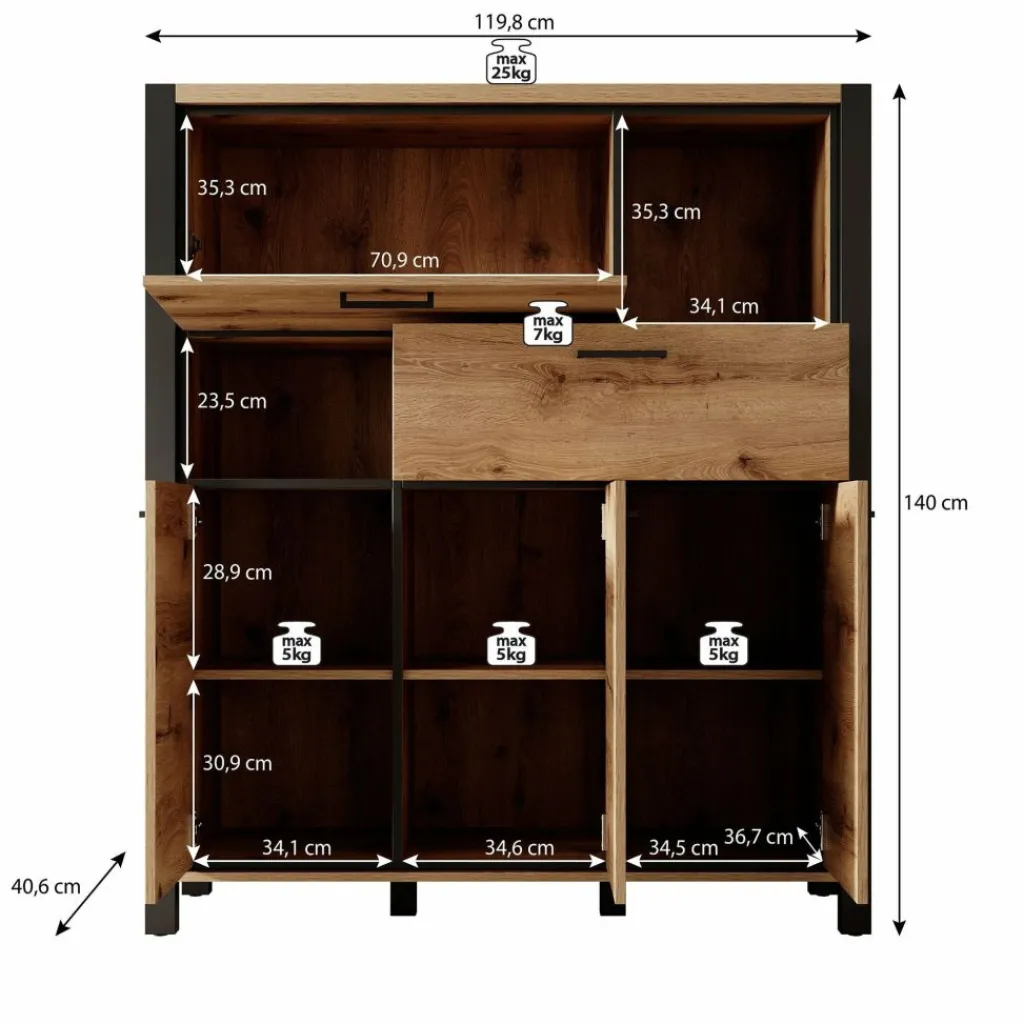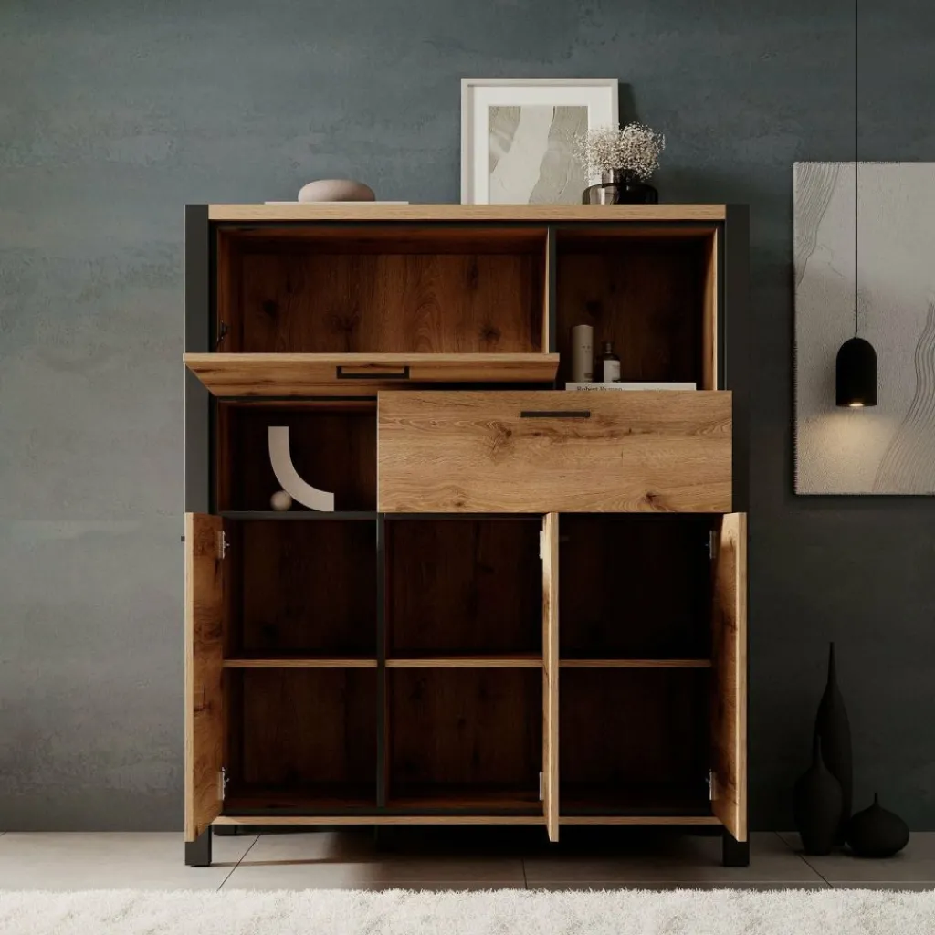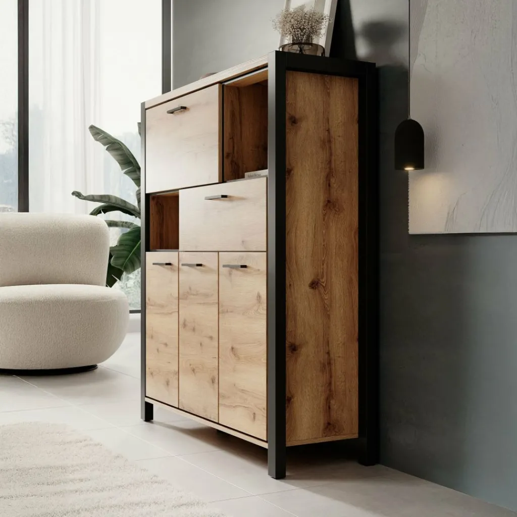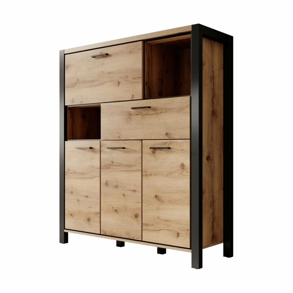 Kast Acapulco is een opbergkast, in industriële stijl. Het betreft een deels dichte opbergkast. De kast beschikt over 3 klepdeuren, een lade en een klapdeur.