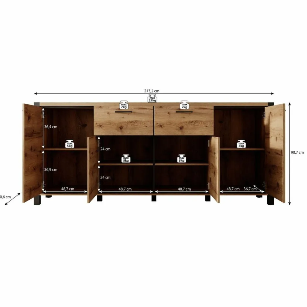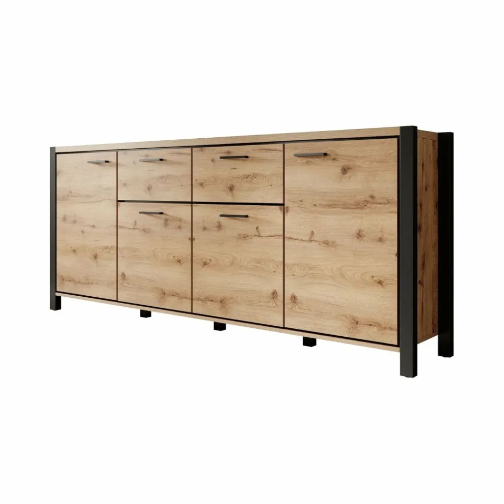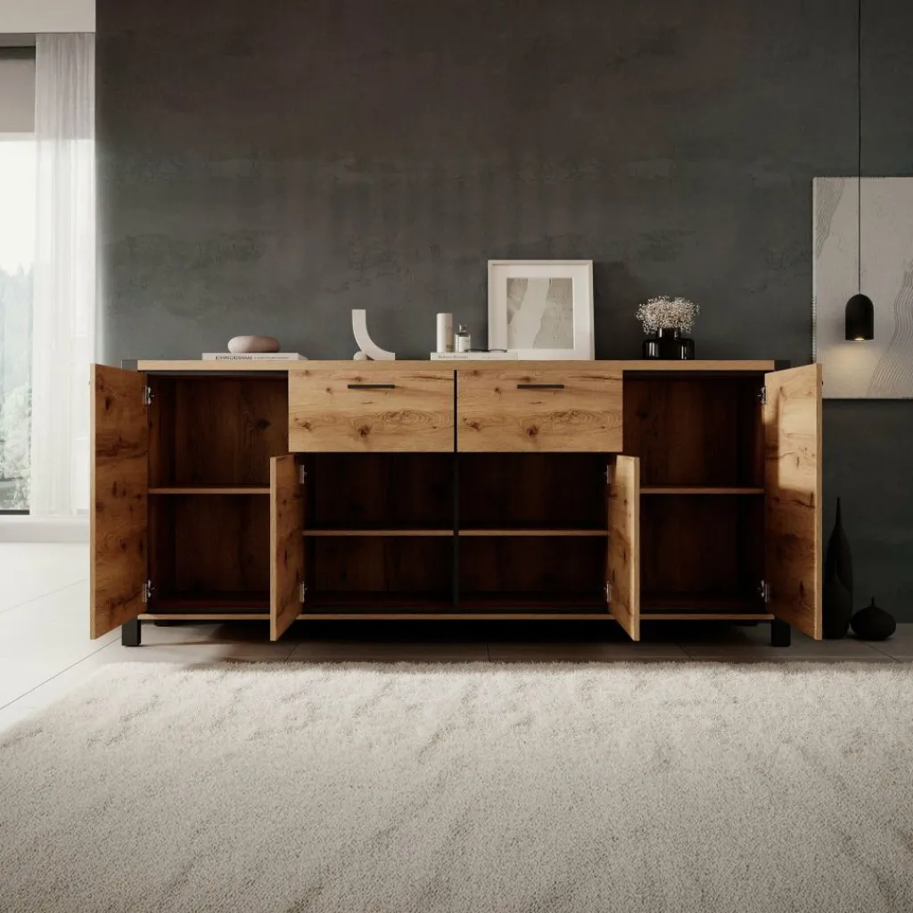 Dressoir Acapulco is een moderne opbergkast, uitgevoerd in een eiken kleur met zwart. De kast beschikt over vier openslaande deuren. In het midden bevinden zich 2 opberglades. De kast staat op zwarte pootjes.