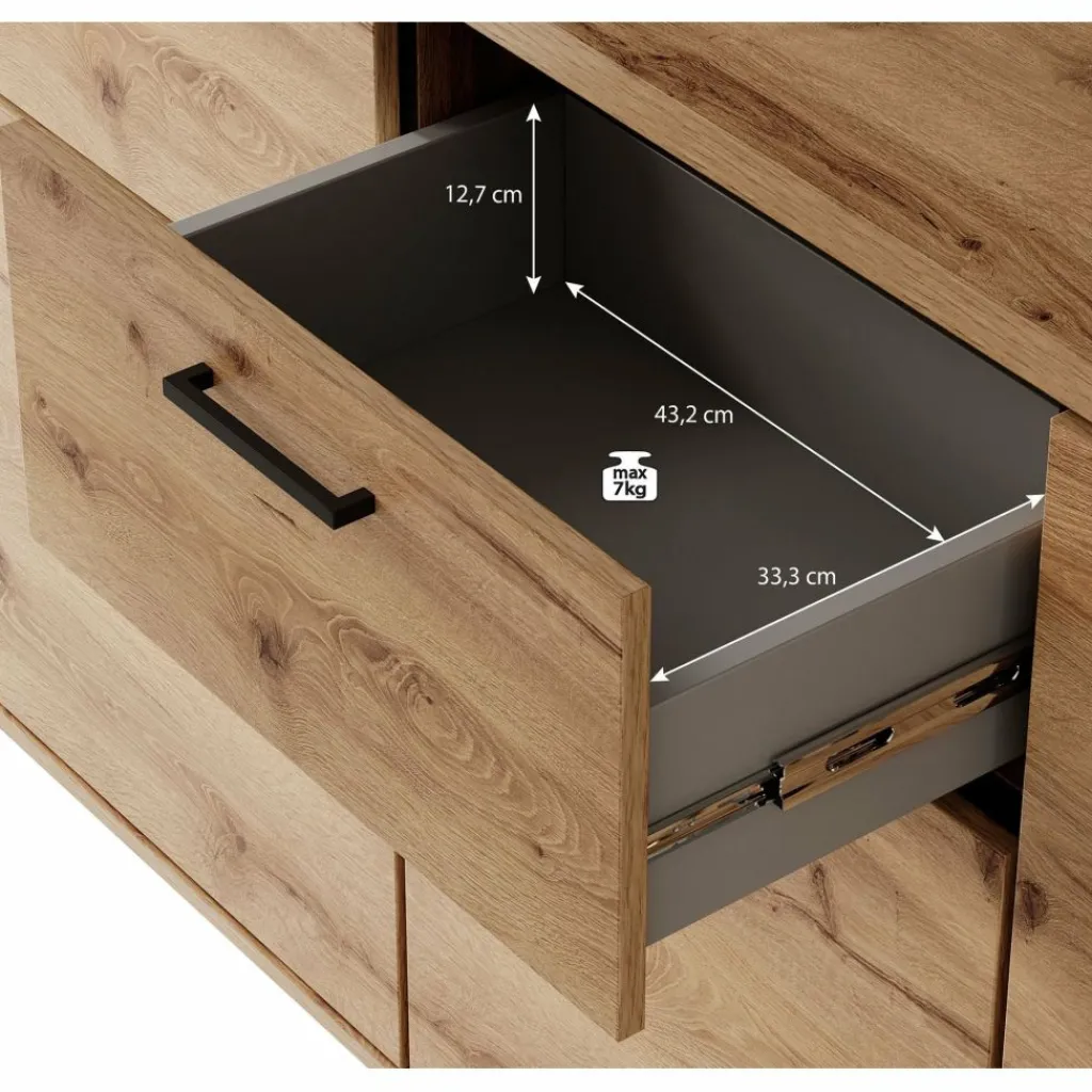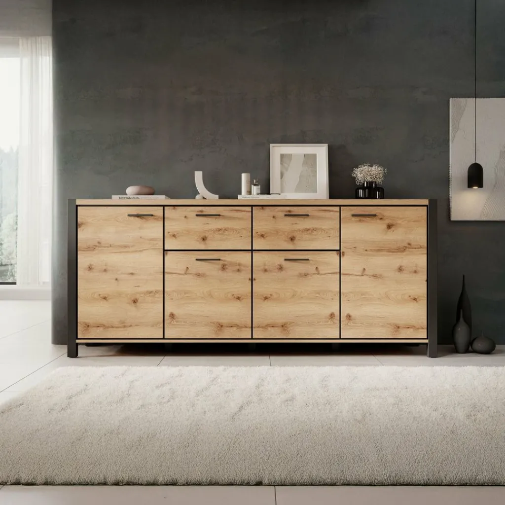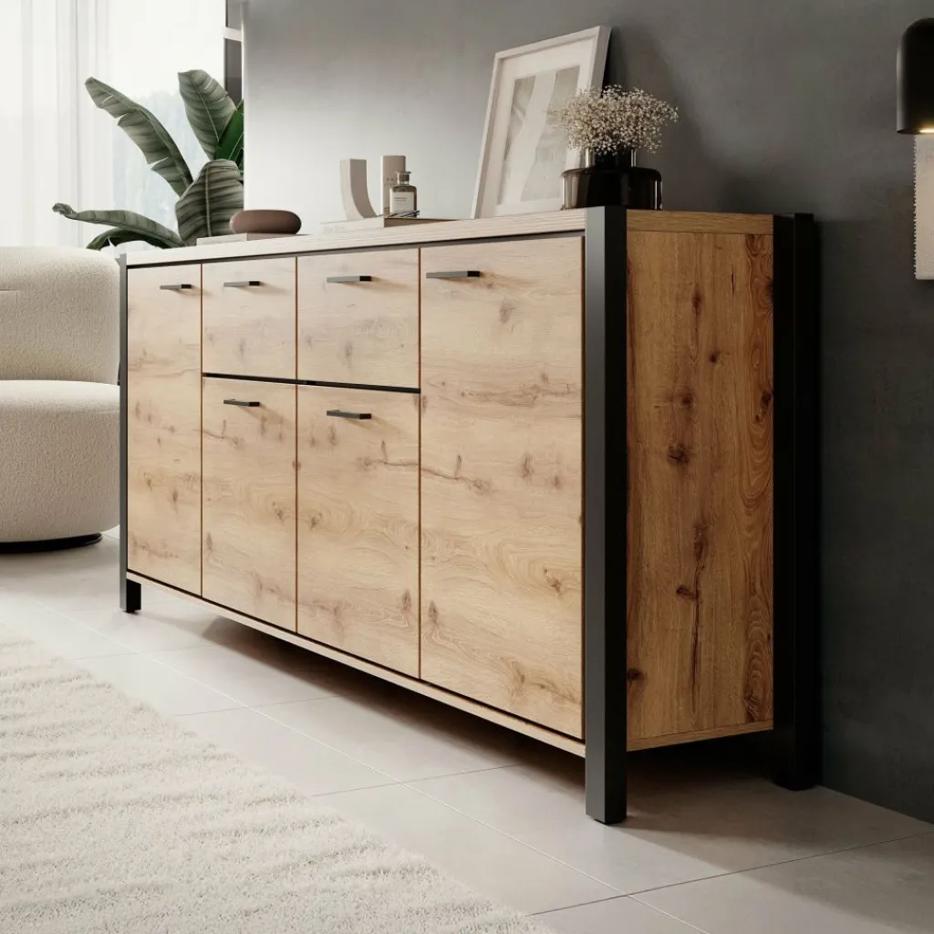 Dressoir Acapulco is een moderne opbergkast, uitgevoerd in een eiken kleur met zwart. De kast beschikt over vier openslaande deuren. In het midden bevinden zich 2 opberglades. De kast staat op zwarte pootjes.
