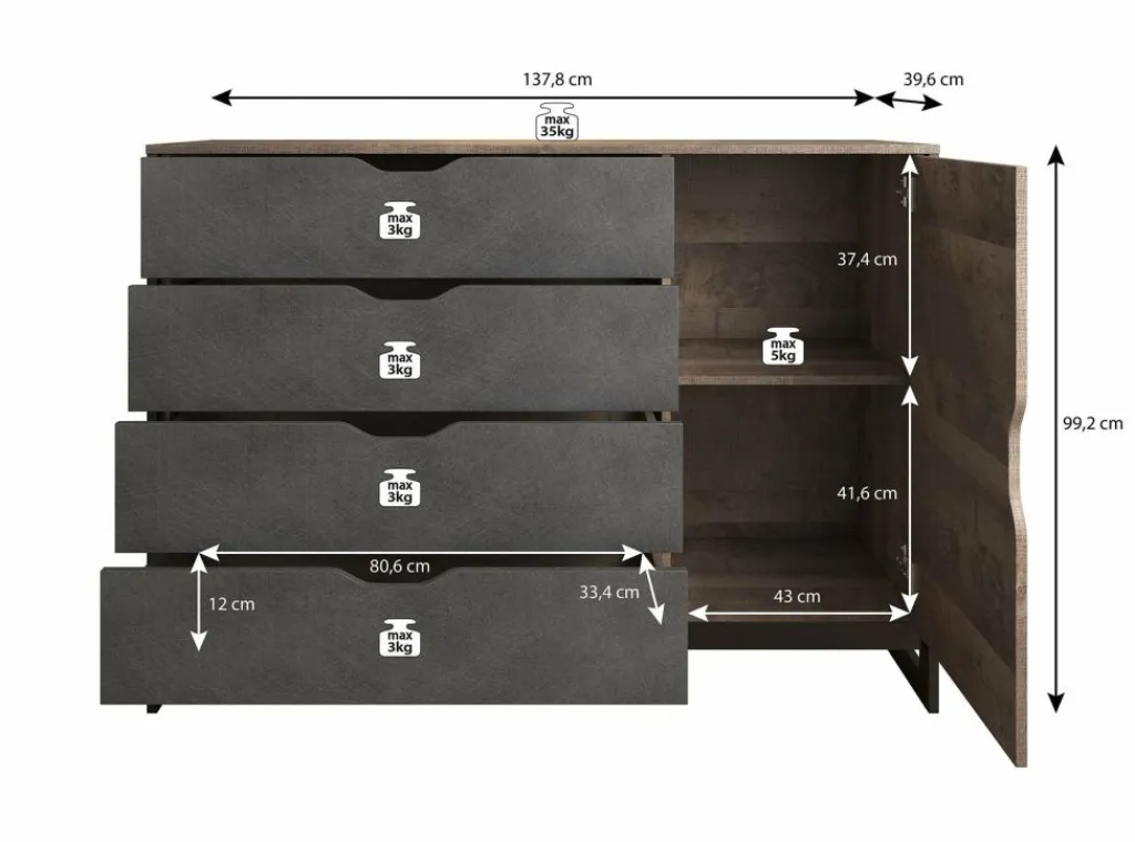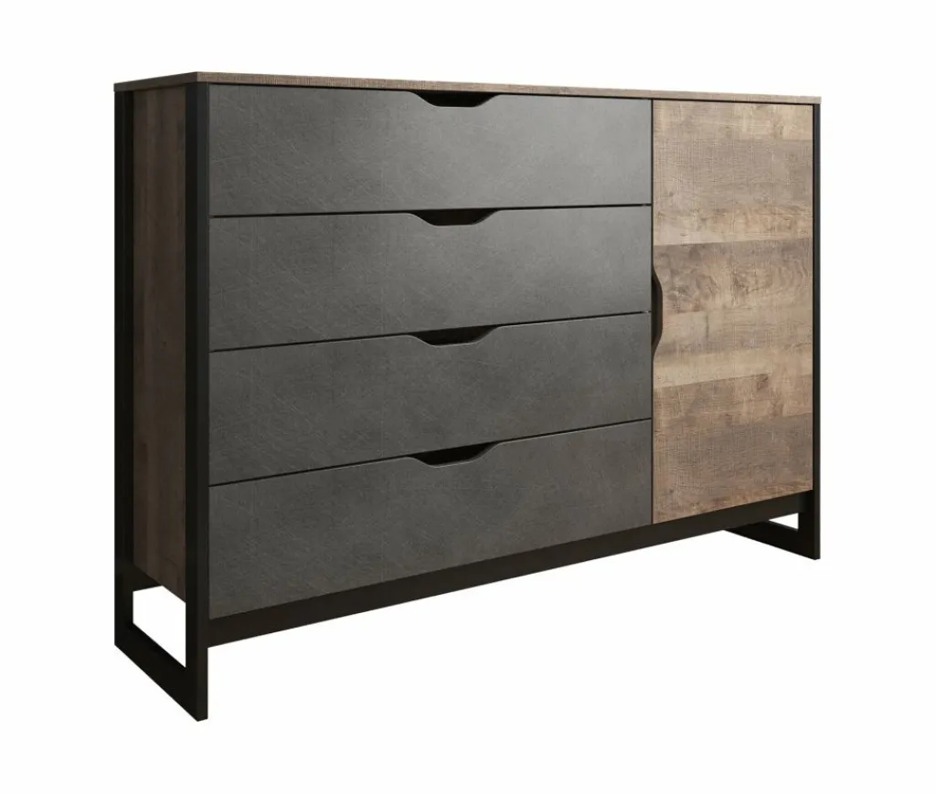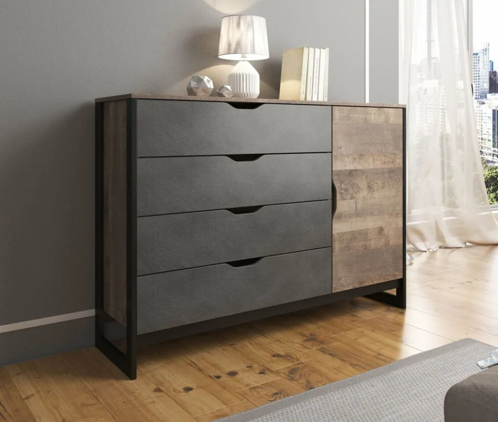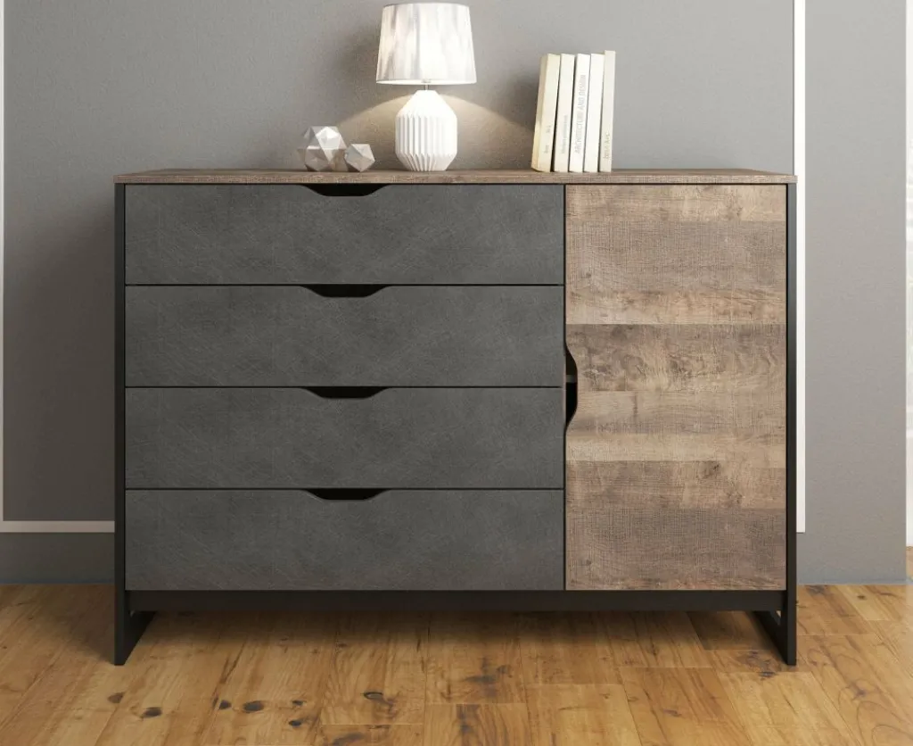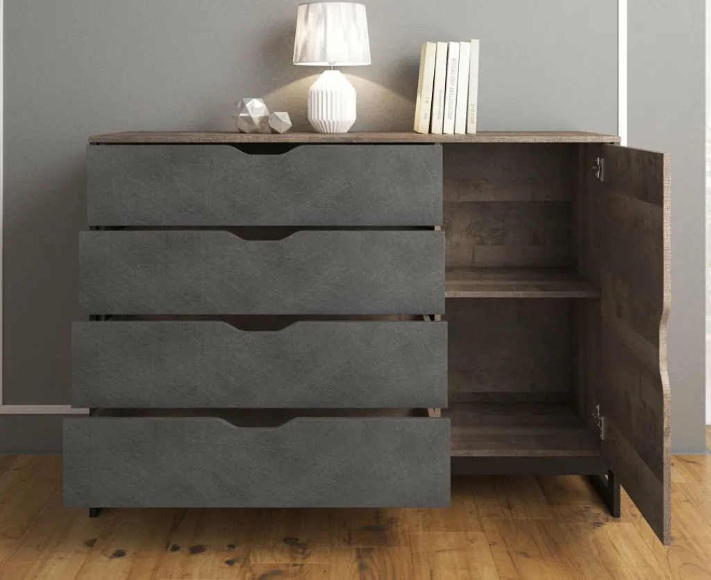 Commode Acasia is voorzien van een deur en vier lades, waarachter genoeg opbergruimte zit. De kast is afgewerkt in een eiken kleur met mat grijze lades.