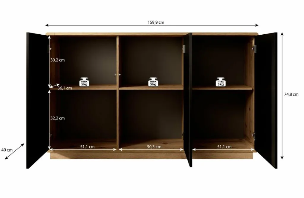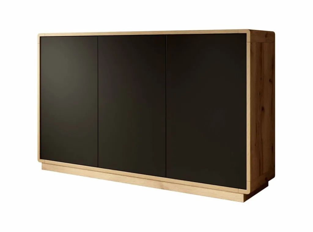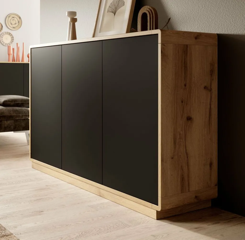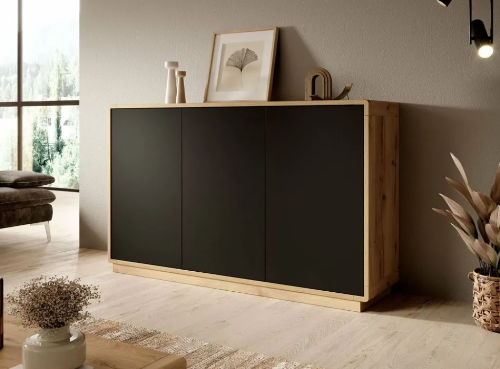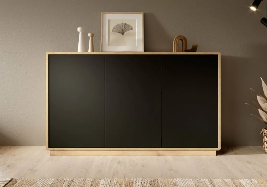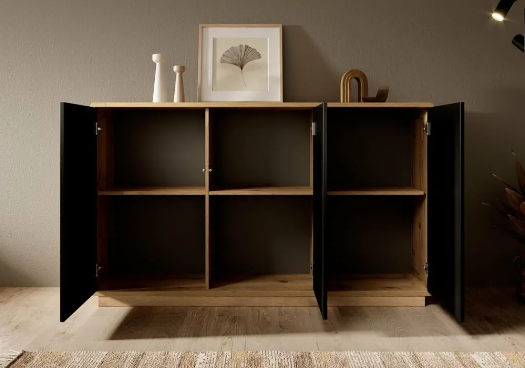Dressoir Acuna is een moderne opbergkast, uitgevoerd in een eiken kleur met mat zwart. De kast beschikt over drie openslaande deuren. Daarachter bevinden zich 6 opbergvakken.