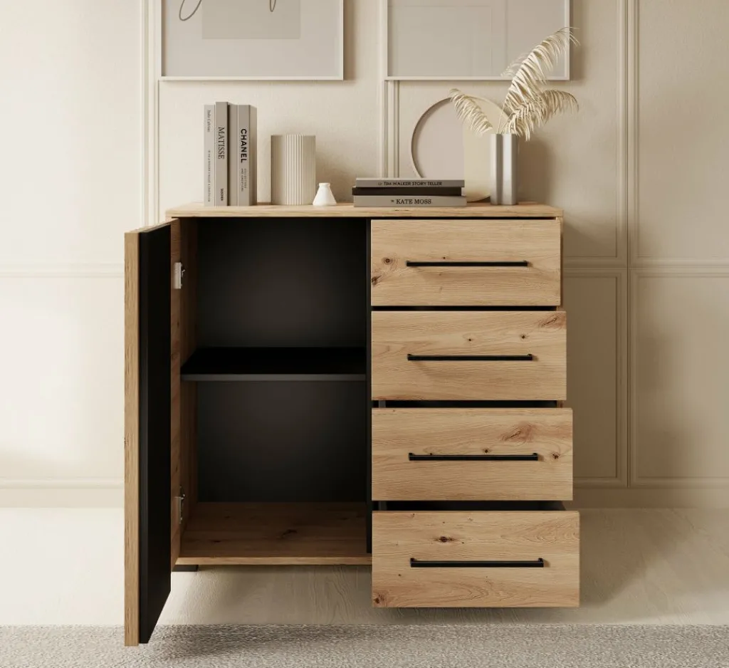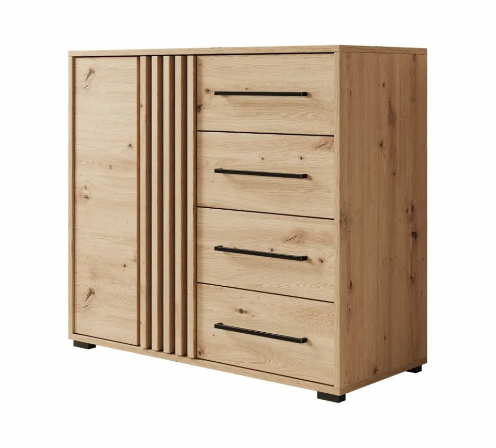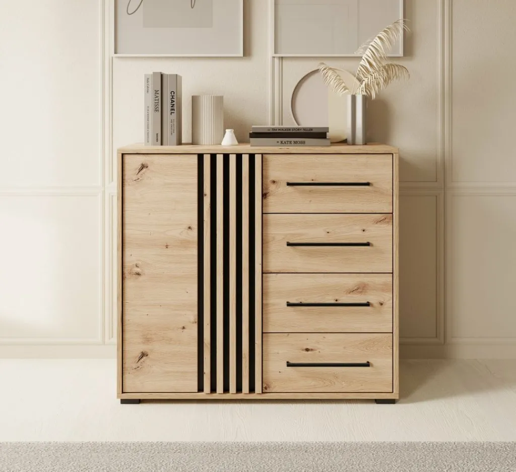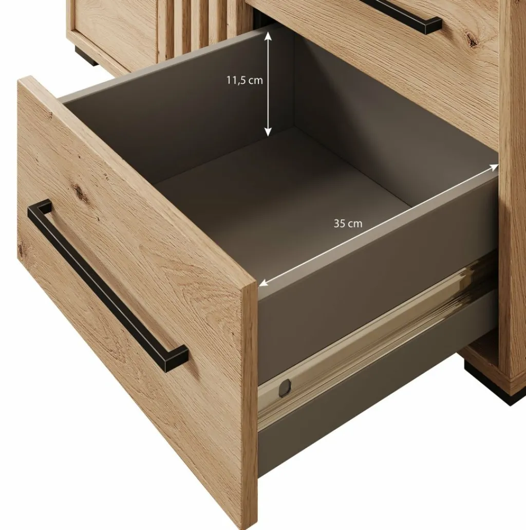De kast heeft 1 deur met latjes en 4 lades die openen met zwarte handgrepen. Achter de deur bevinden zich nog 2 opbergvakken.