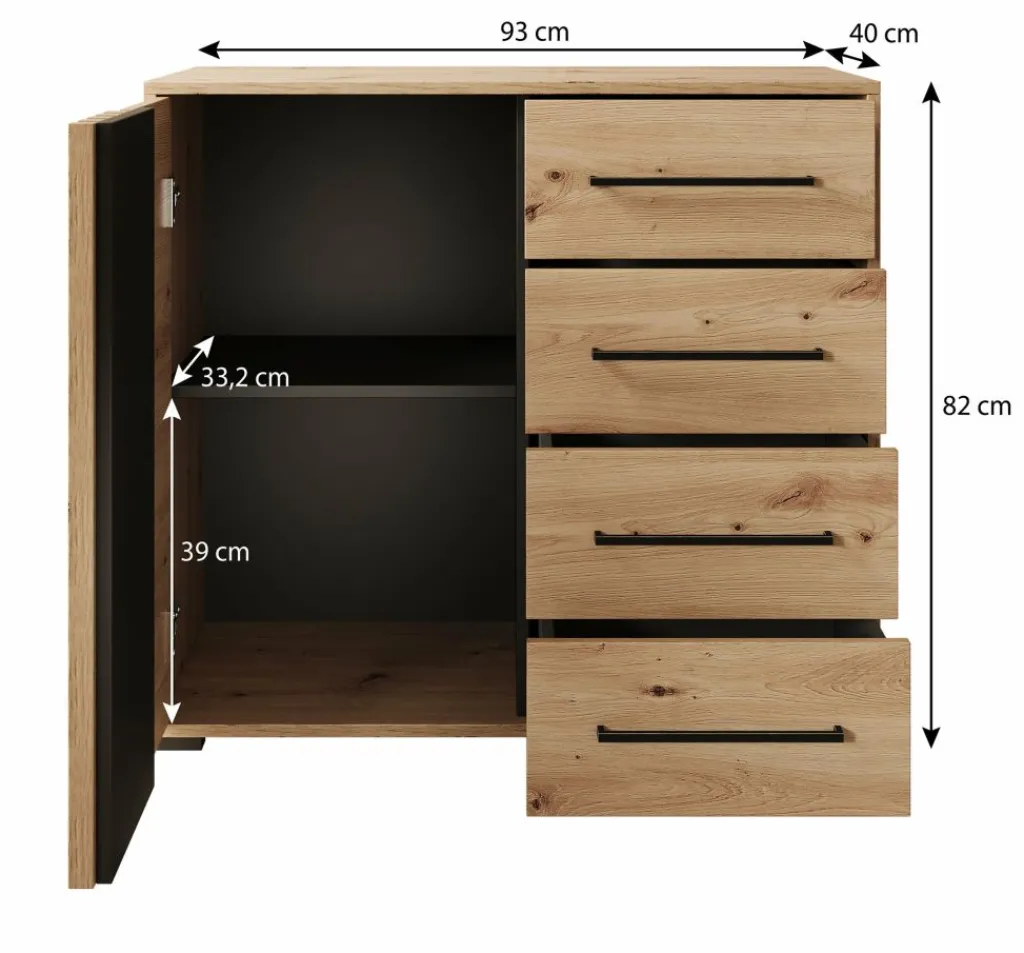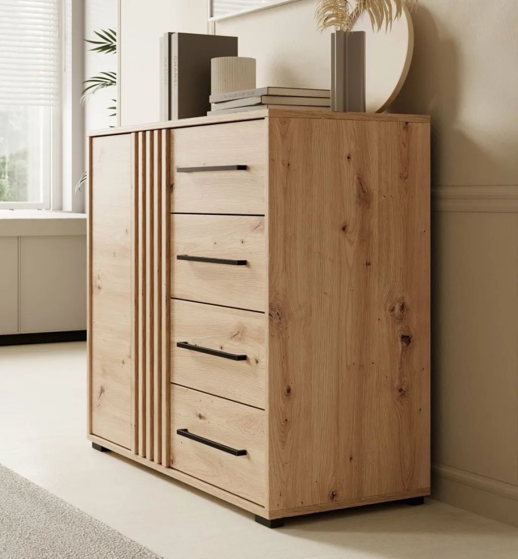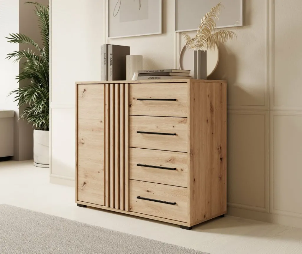 De kast heeft 1 deur met latjes en 4 lades die openen met zwarte handgrepen. Achter de deur bevinden zich nog 2 opbergvakken.
