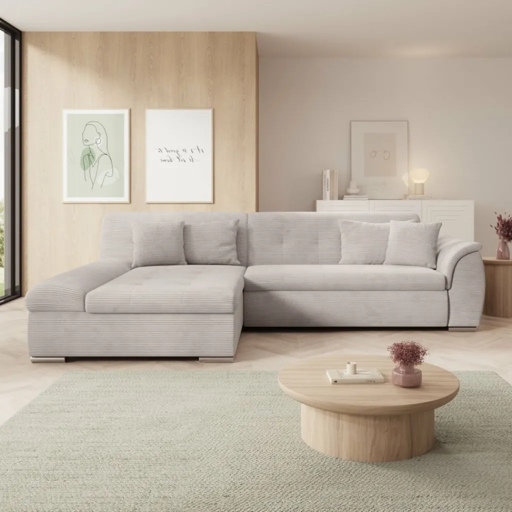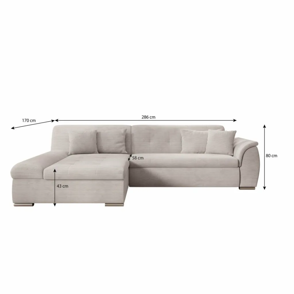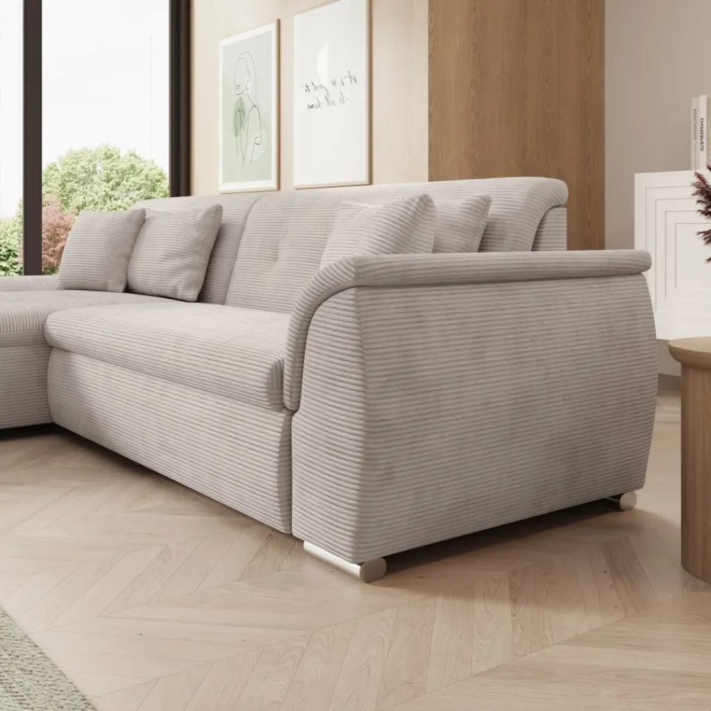 Hoekbank Alberta is een strakke bank in L-vorm, gemaakt van ribstof met een moderne uitstraling. Dit model is voorzien van een 2-zitter en een ruim loungegedeelte. Deze hoekbank beschikt over vaste zit- en rugkussens zonder ritsen. Ook de 4 sierkussens, zonder ritsen, worden gratis meegeleverd. De bank is bekleed met een zachte ribstof die aangenaam aanvoelt en zeer duurzaam is. Ten slotte staat de Alberta op kunststoffen pootjes.