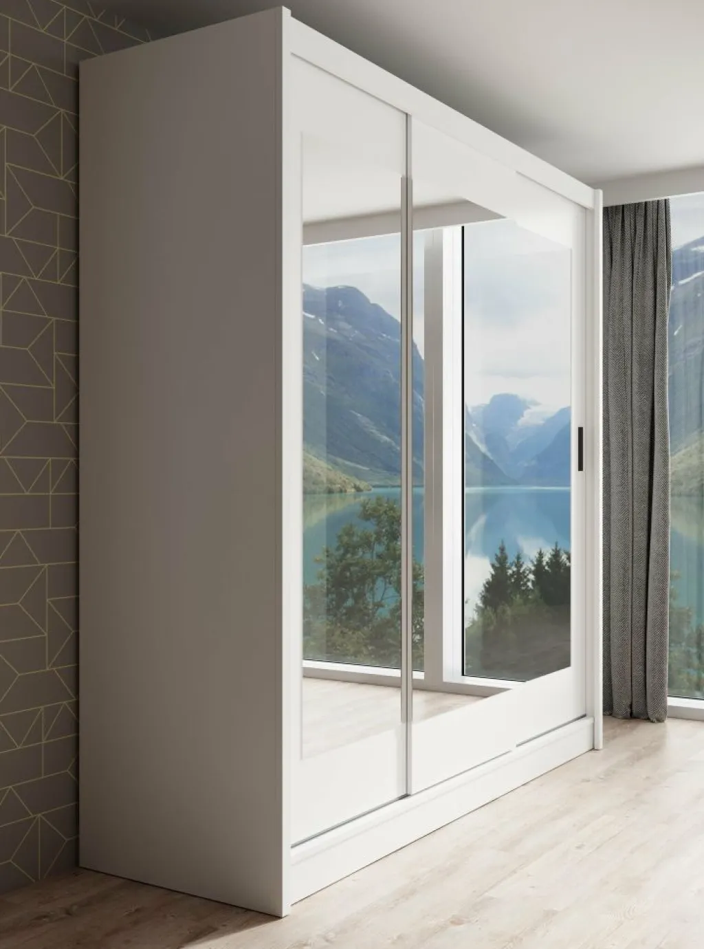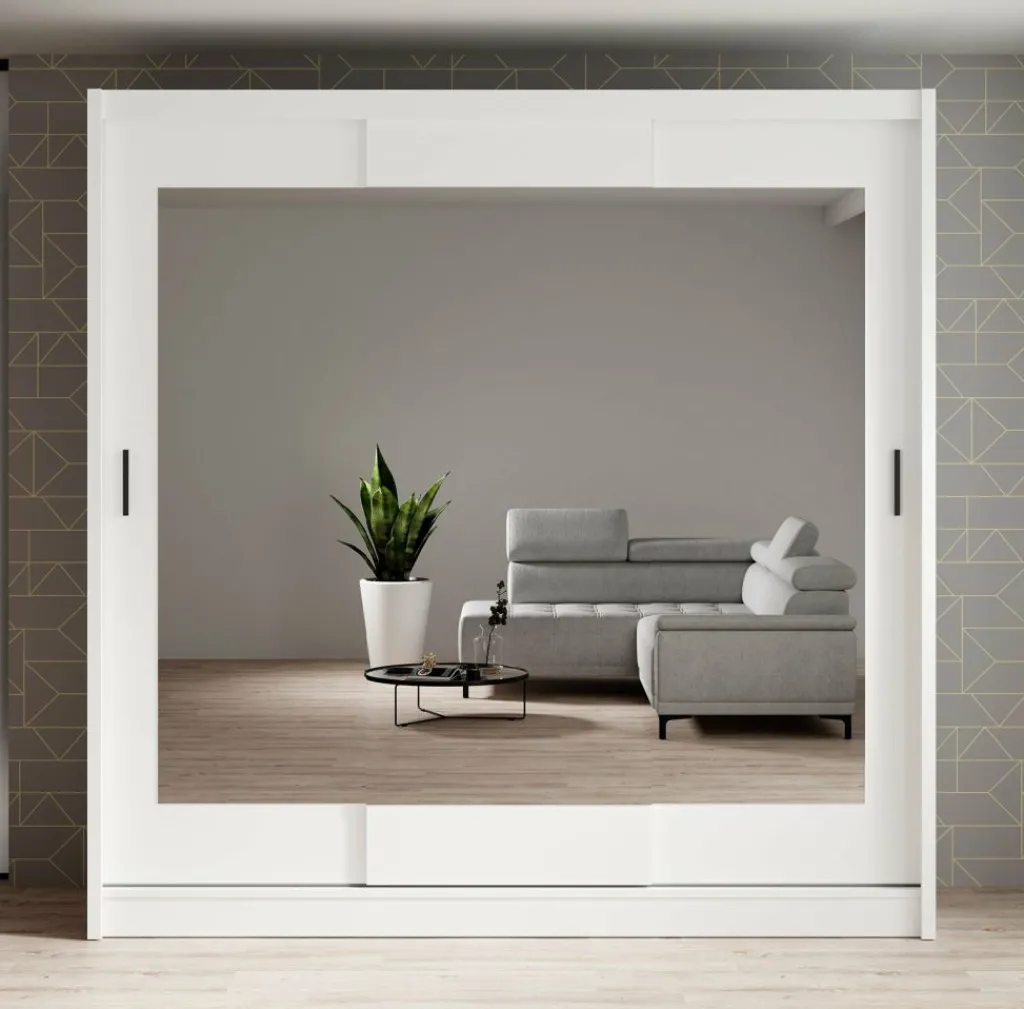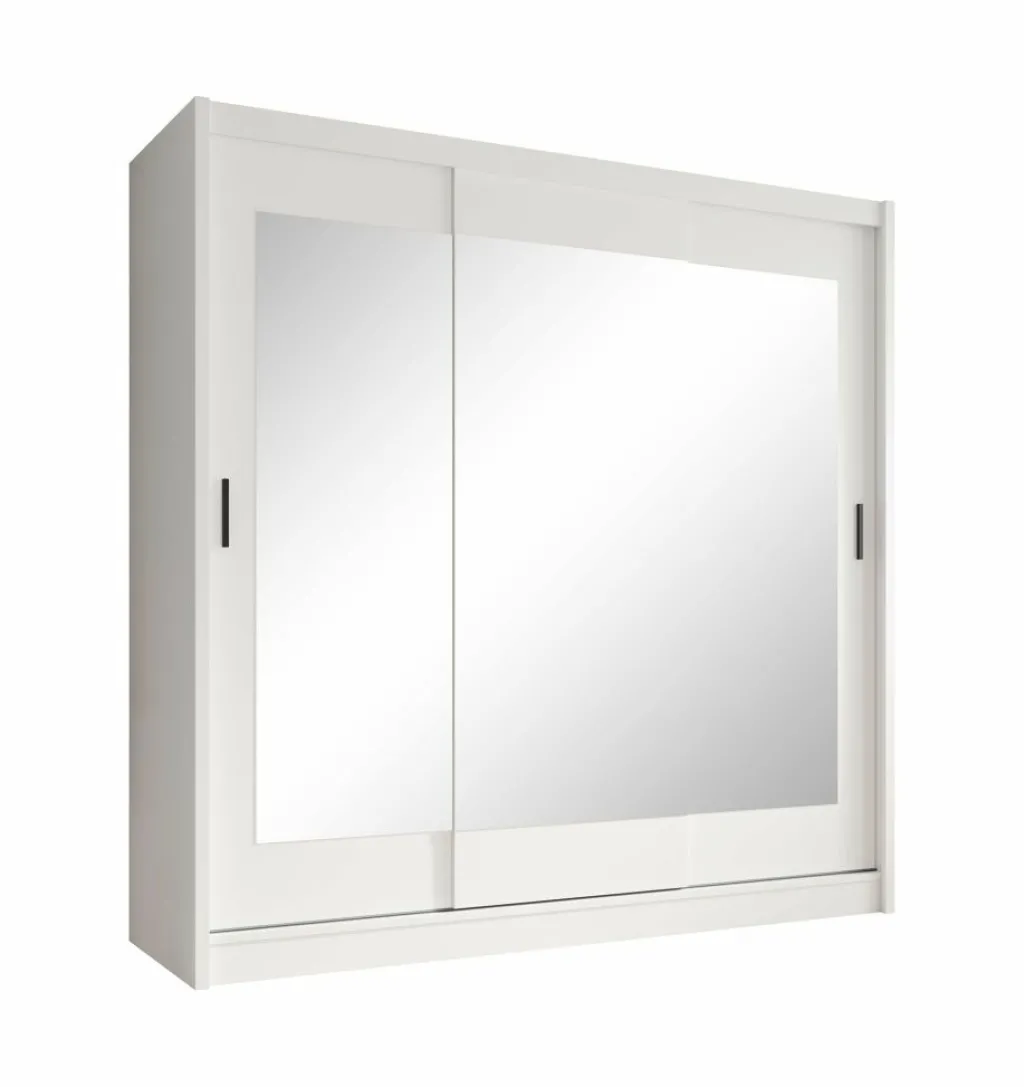 Garderobekast Alcamo 2 is een praktische kast uitgevoerd in mat witte kleur. De kledingkast beschikt over drie grote schuifdeuren waardoor ruimte wordt bespaard. Over de drie deuren lopen 3 spiegels in elkaar door. Het binnenwerk bestaat uit drie aparte delen. Aan de linkerzijde bevinden zich 4 legplanken. Rechts bevindt zich bovenin een groot open schap, met daaronder 2 delen met metalen stang om kleding aan op te hangen.