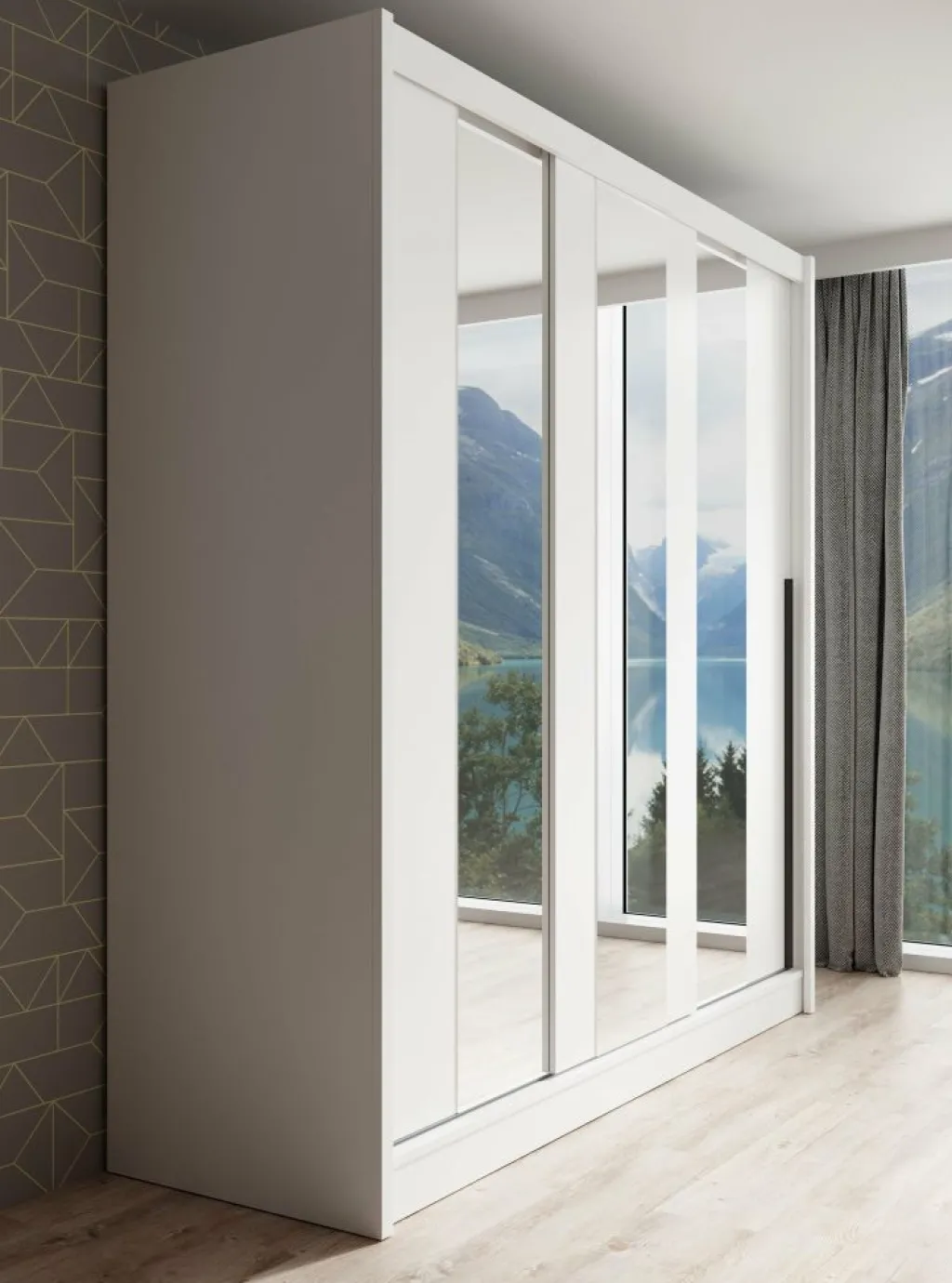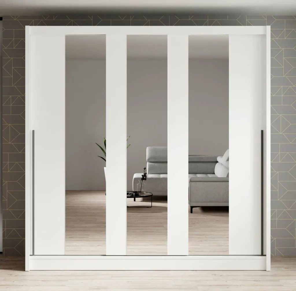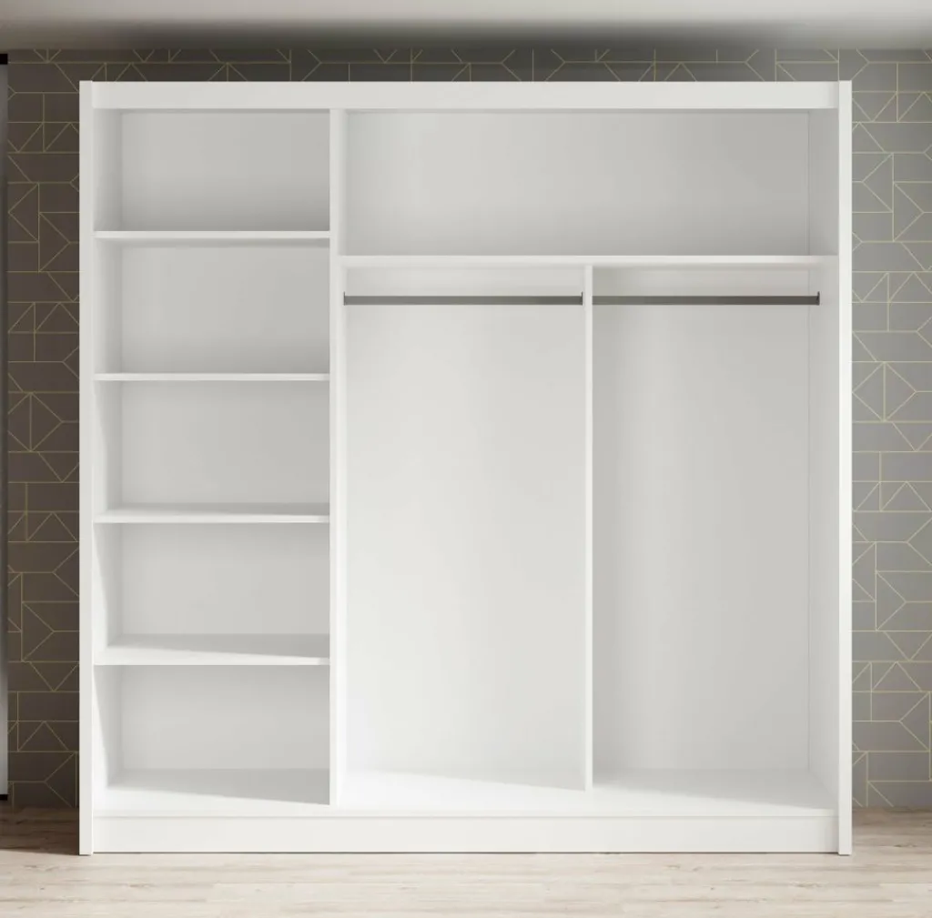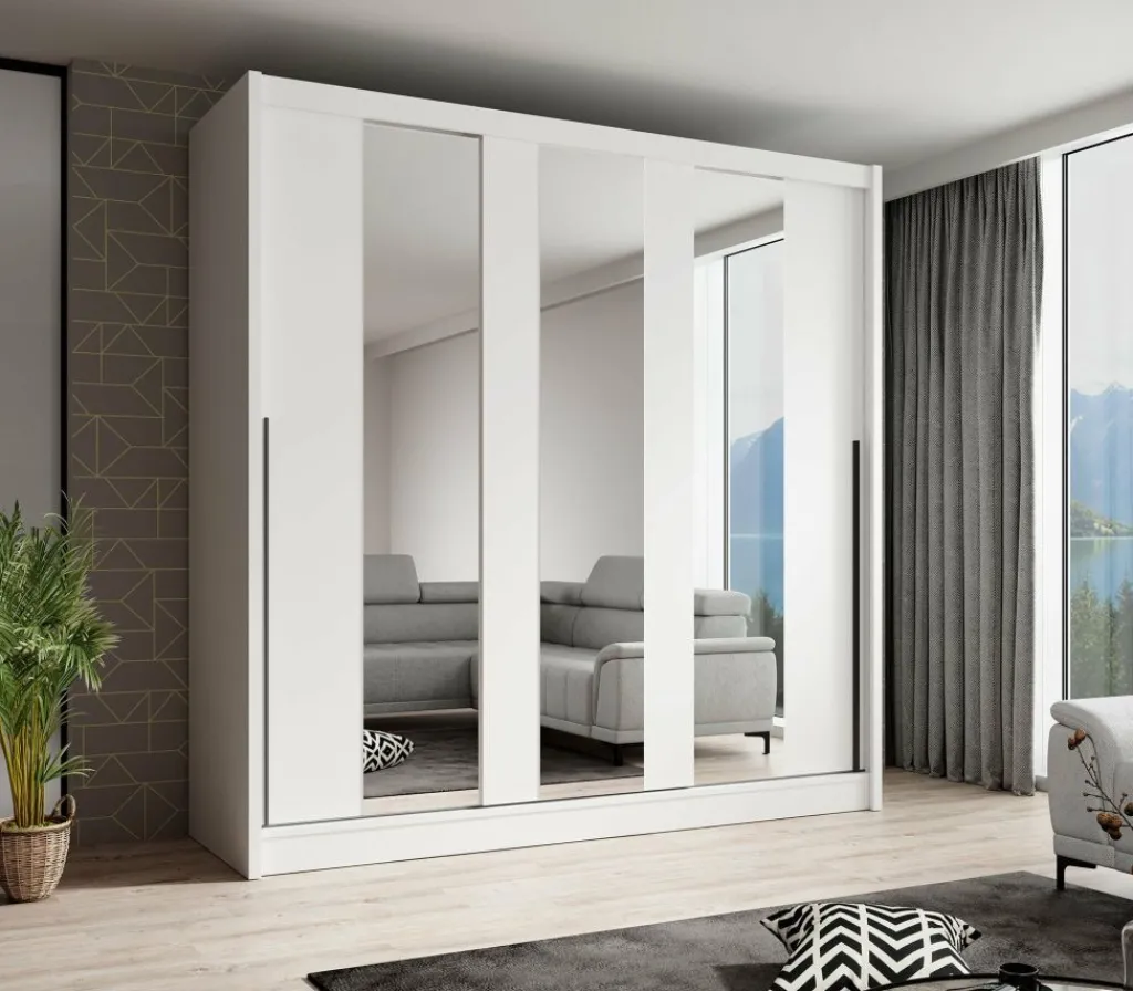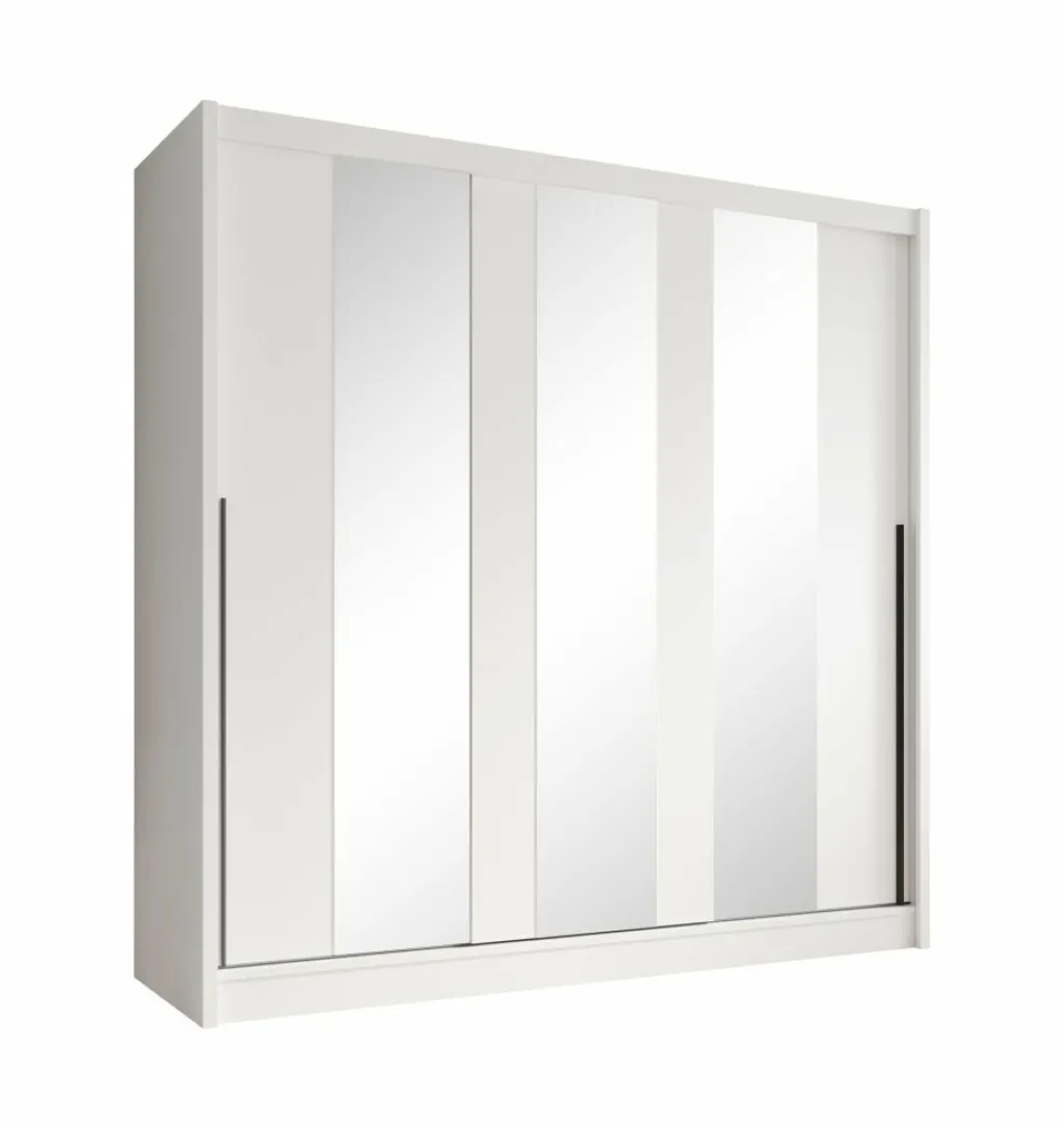Garderobekast Alcamo 3 is een praktische kast uitgevoerd in mat witte kleur. De kledingkast beschikt over drie grote schuifdeuren waardoor ruimte wordt bespaard. Op elke deur zit een lange spiegel. Het binnenwerk bestaat uit drie aparte delen. Aan de linkerzijde bevinden zich 4 legplanken. Rechts bevindt zich bovenin een groot open schap, met daaronder 2 delen met metalen stang om kleding aan op te hangen.