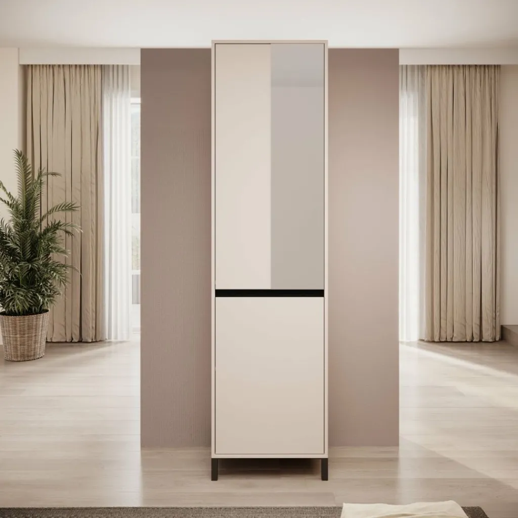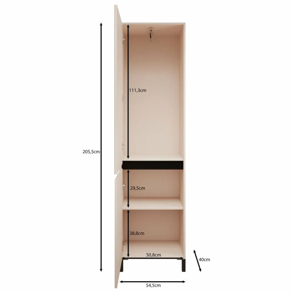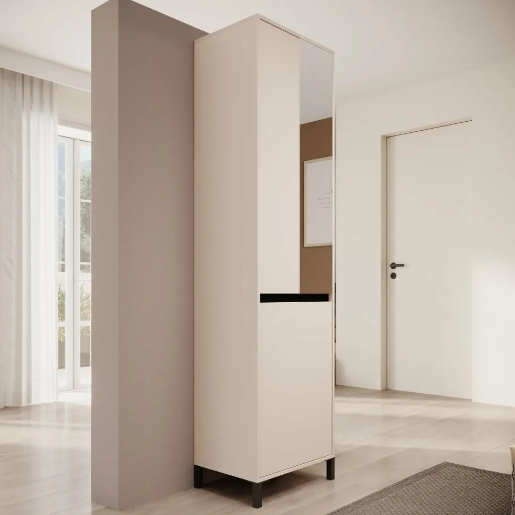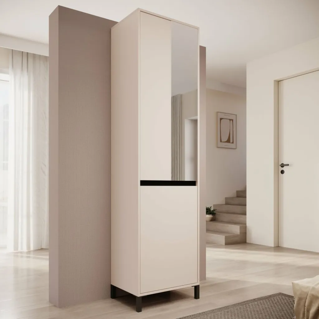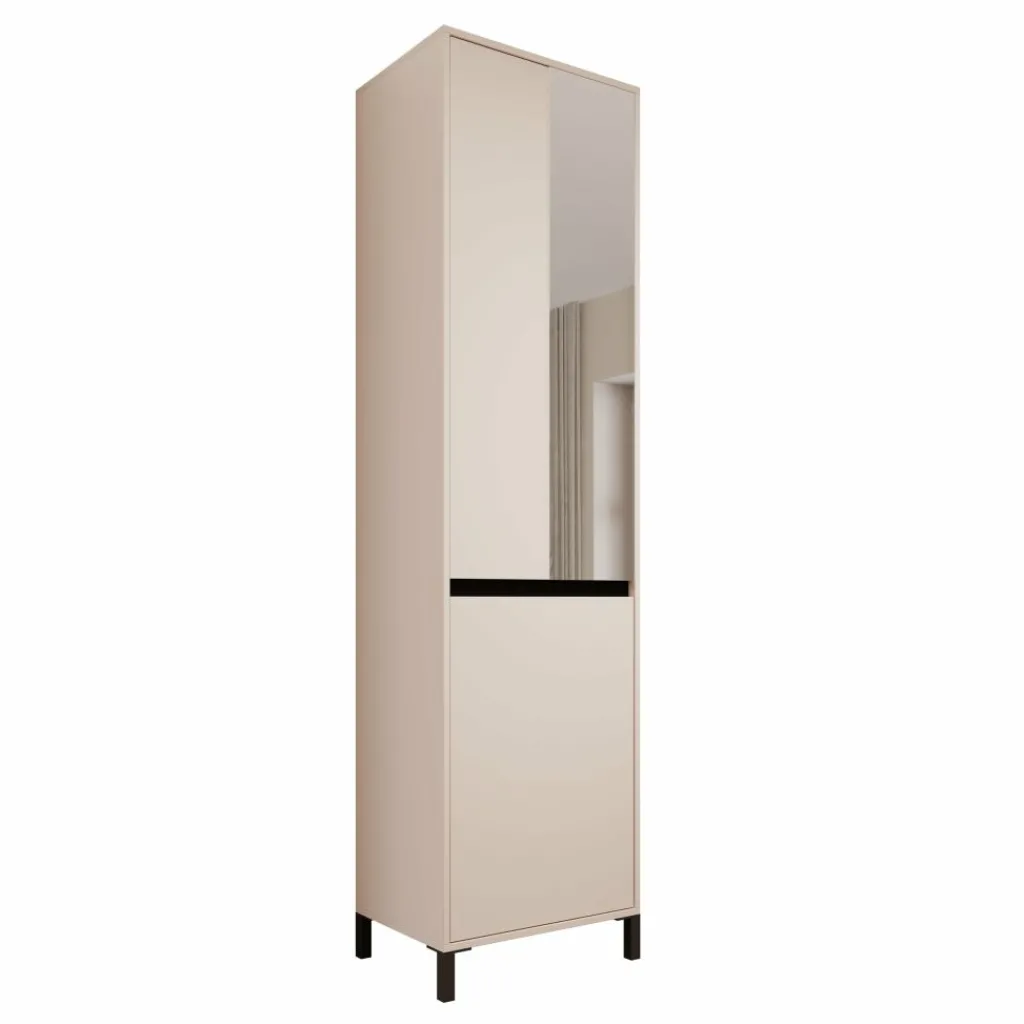 Halkast Alessa is een smalle en functionele opbergkast voor de hal of entree. Met een breedte van 55 cm en een hoogte van 206 cm biedt dit model veel opbergruimte zonder veel vloeroppervlak in te nemen. De beige afwerking geeft de kast een rustige, neutrale uitstraling die goed past in moderne interieurs.