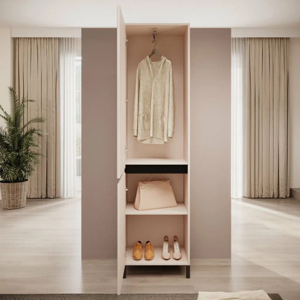 Achter de twee greeploze deuren bevindt zich een praktische indeling met ruimte om jassen op te hangen en extra vakken voor schoenen, tassen of accessoires. Door de verticale opbouw blijft alles overzichtelijk opgeborgen. De kast staat op zwarte poten, waardoor de vloer zichtbaar blijft en schoonmaken eenvoudig is. De constructie is stabiel en bedoeld voor dagelijks gebruik.
