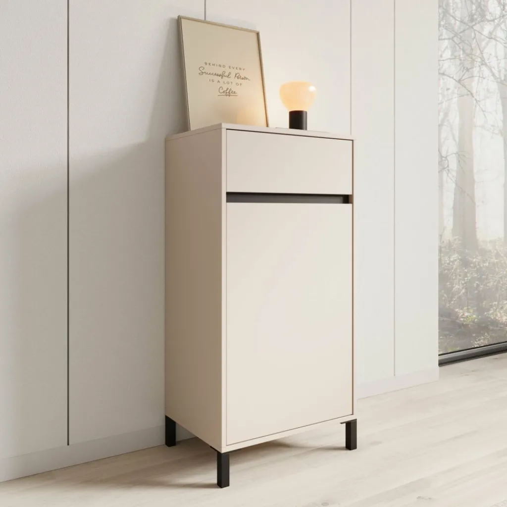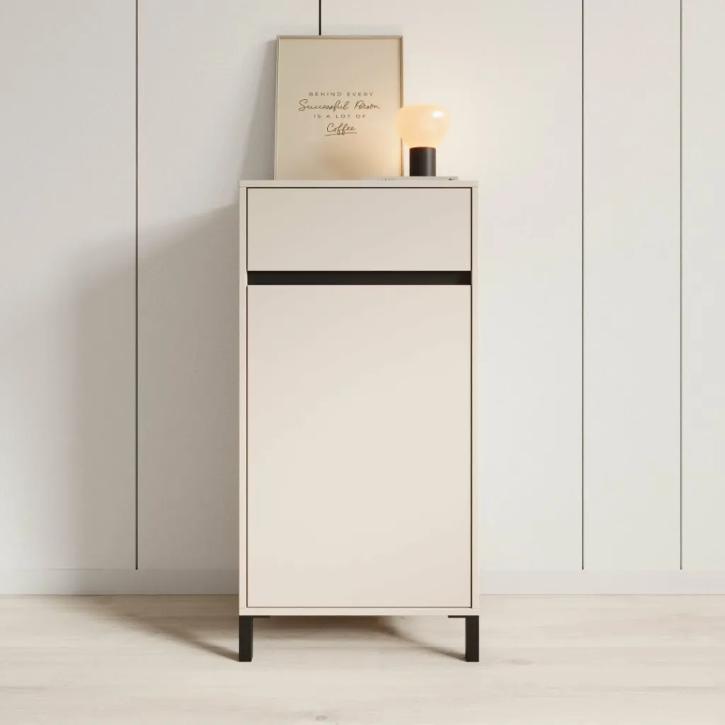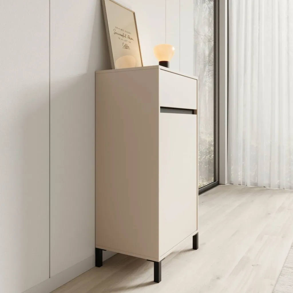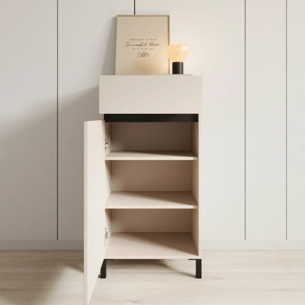 Achter de deur bevinden zich meerdere legplanken waarop schoenen netjes kunnen worden geplaatst. De indeling is geschikt voor zowel lage als hogere schoenen. De kast staat op slanke zwarte poten, waardoor de vloer zichtbaar blijft en het meubel gemakkelijk te onderhouden is. De constructie is stabiel en bedoeld voor dagelijks gebruik.