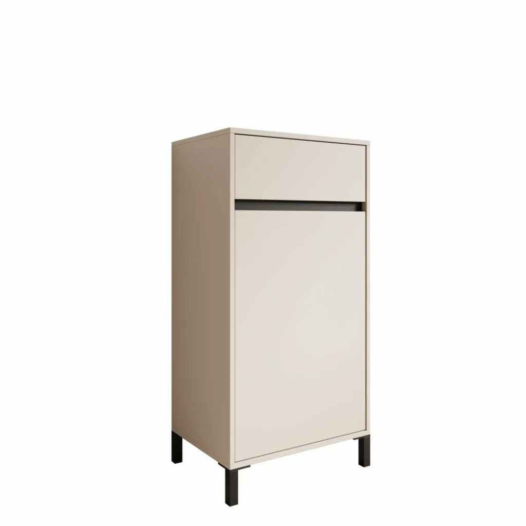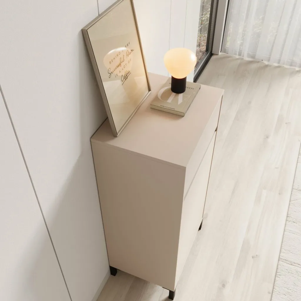 Schoenenkast Alessa is een praktische opbergoplossing voor de hal of slaapkamer. Dankzij de compacte afmetingen van 55 cm breed en 110 cm hoog neemt de kast weinig ruimte in, terwijl er toch voldoende plaats is om schoenen overzichtelijk op te bergen. De beige afwerking zorgt voor een rustige, neutrale uitstraling die eenvoudig te combineren is met verschillende interieurstijlen.