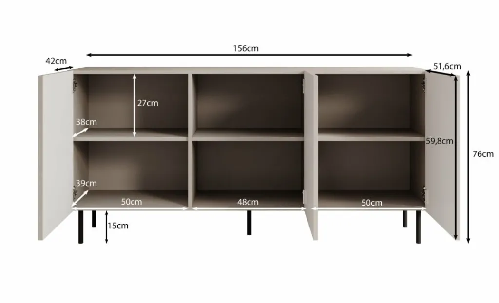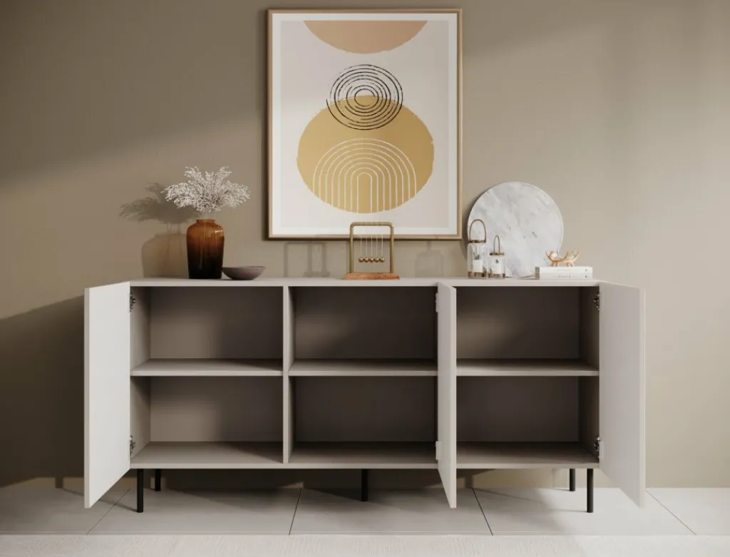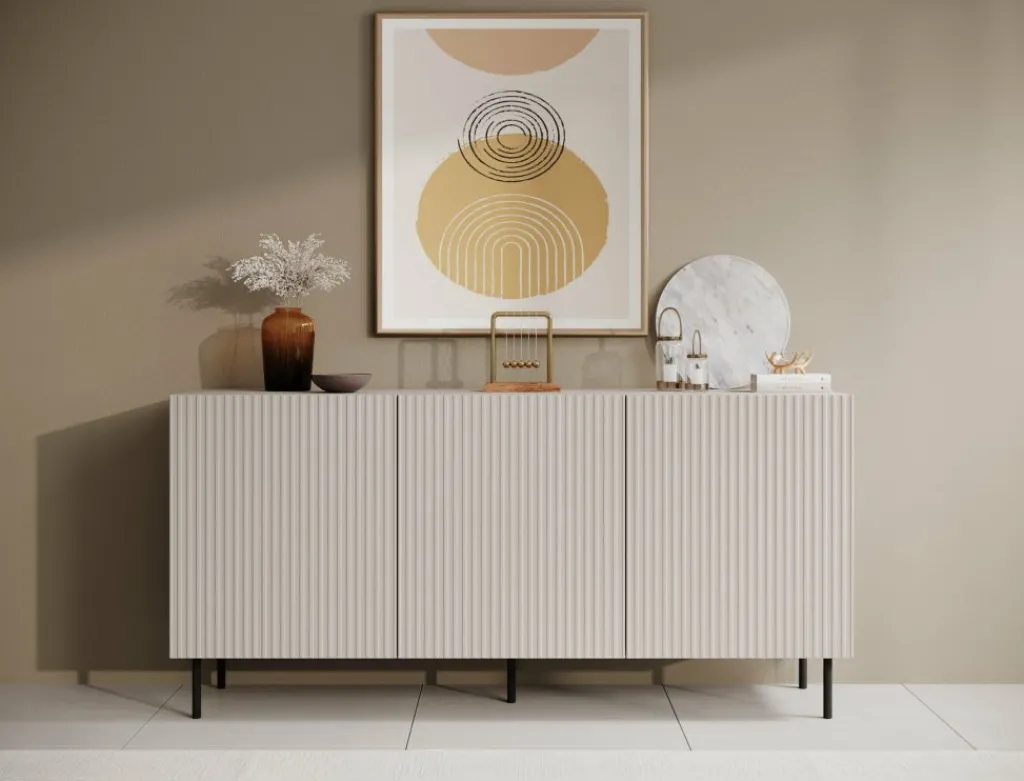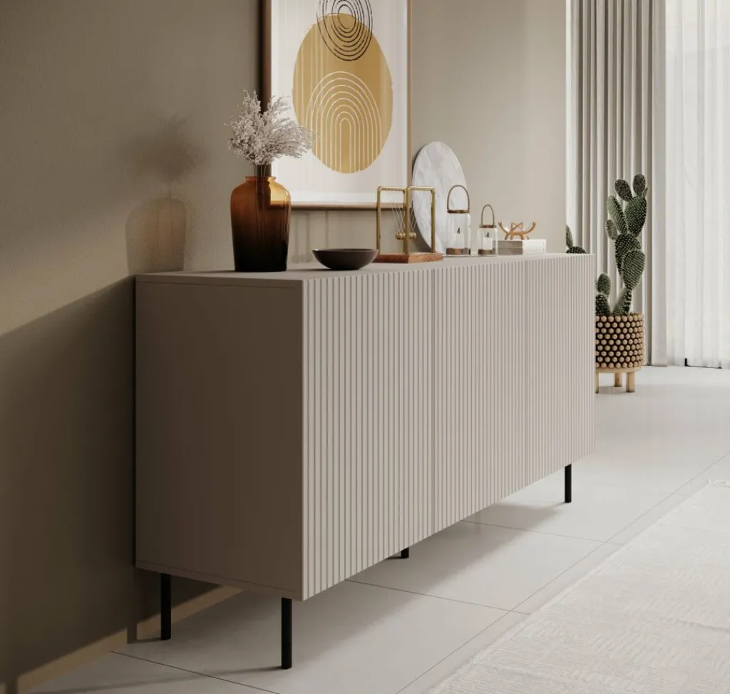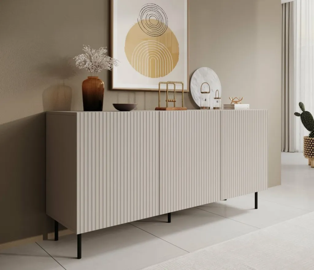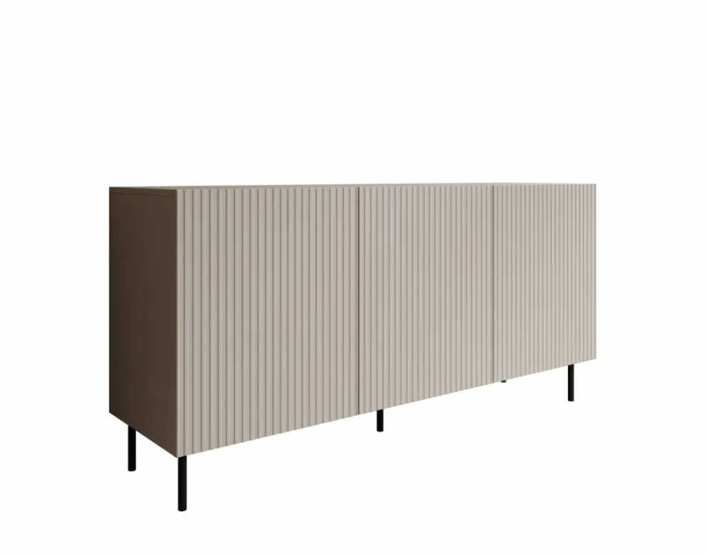 Dressoir Alex is een opbergkast in een moderne stijl. De kast beschikt over 3 deuren die openen met het push to open systeem. Hierachter zitten 6 opbergvakken. De voorkant van deze deuren hebben een latten patroon. De Alex staat op metalen pootjes in de kleur zwart. Verder is het meubel volledig uitgevoerd in beige.