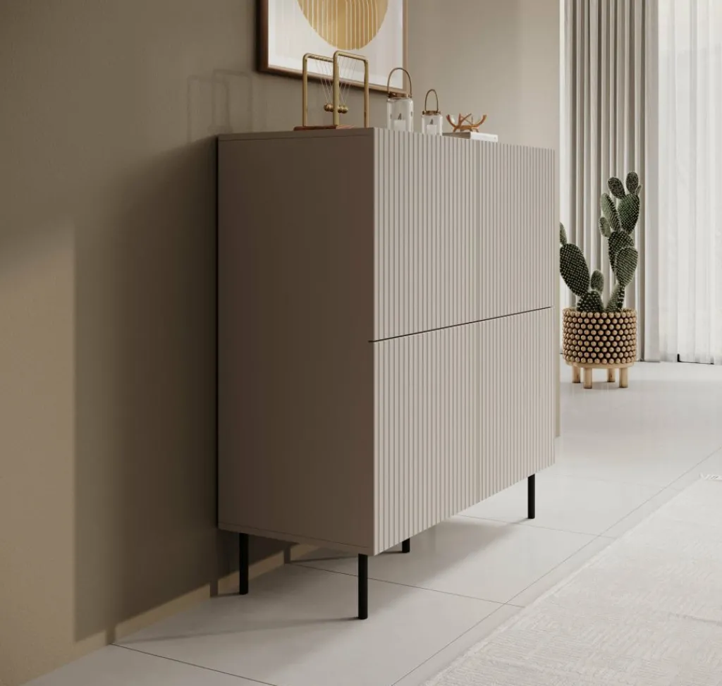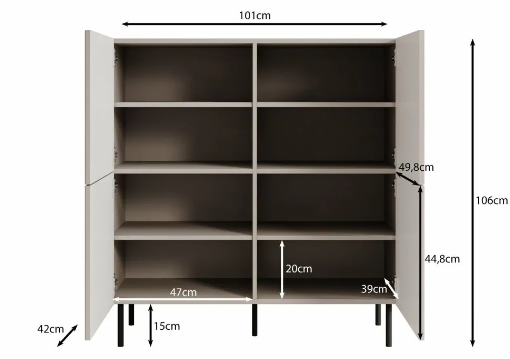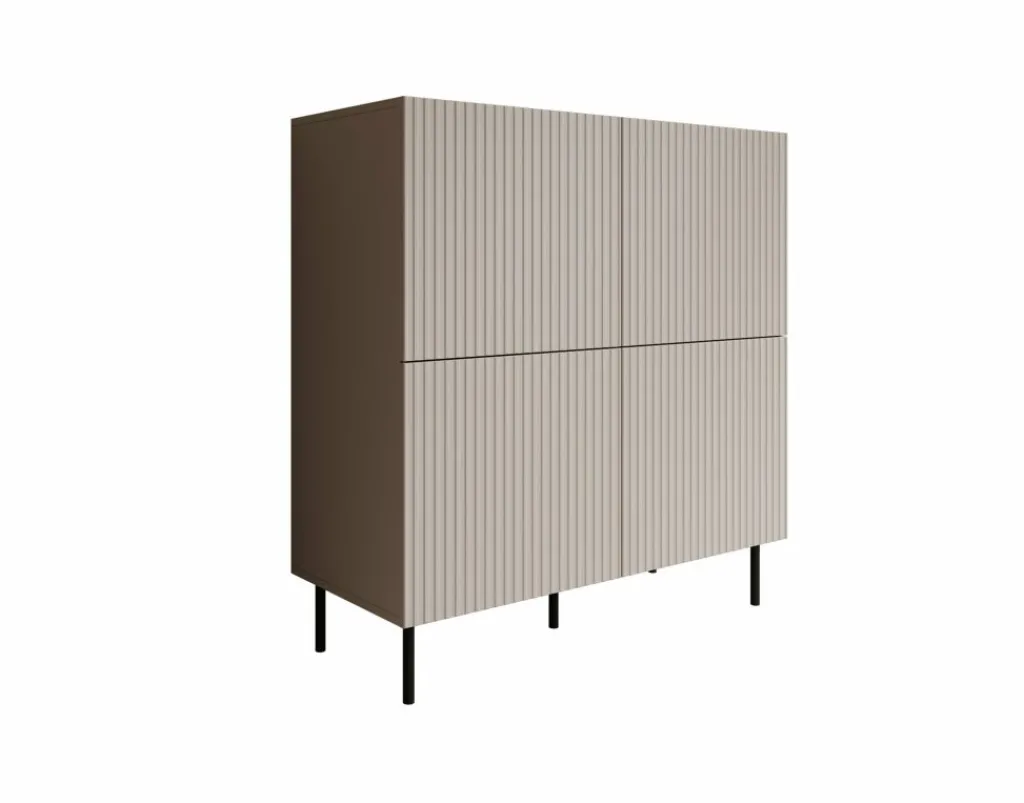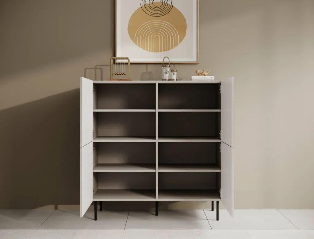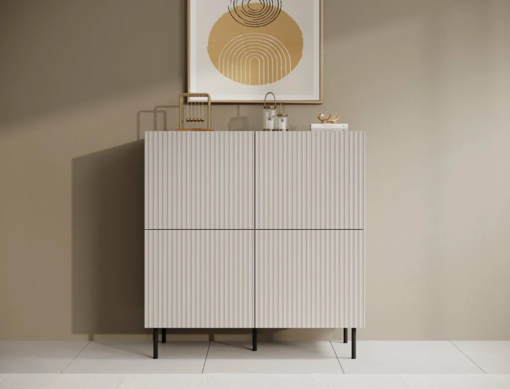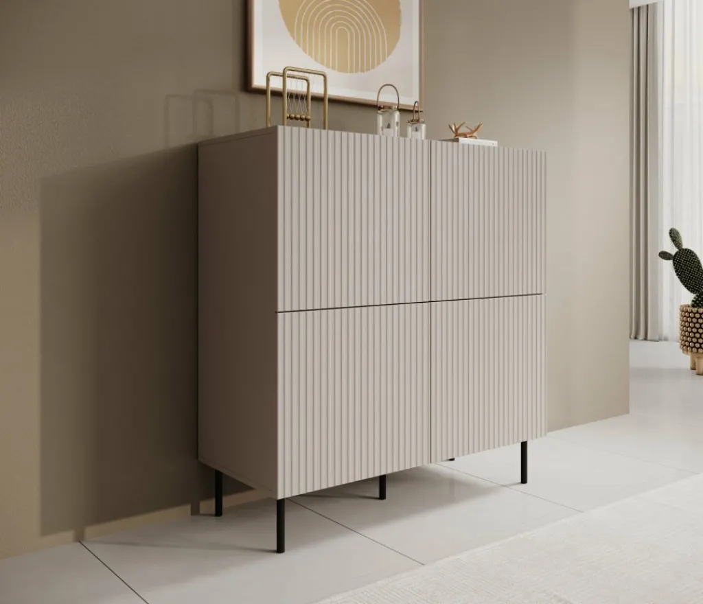 Dressoir Alex is een opbergkast in een moderne stijl. De kast beschikt over 4 deuren die openen met het push to open systeem. Hierachter zitten 8 opbergvakken. De voorkant van deze deuren hebben een latten patroon. De Alex staat op metalen pootjes in de kleur zwart. Verder is het meubel volledig uitgevoerd in beige.