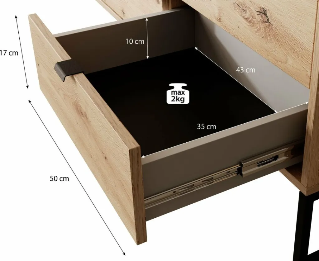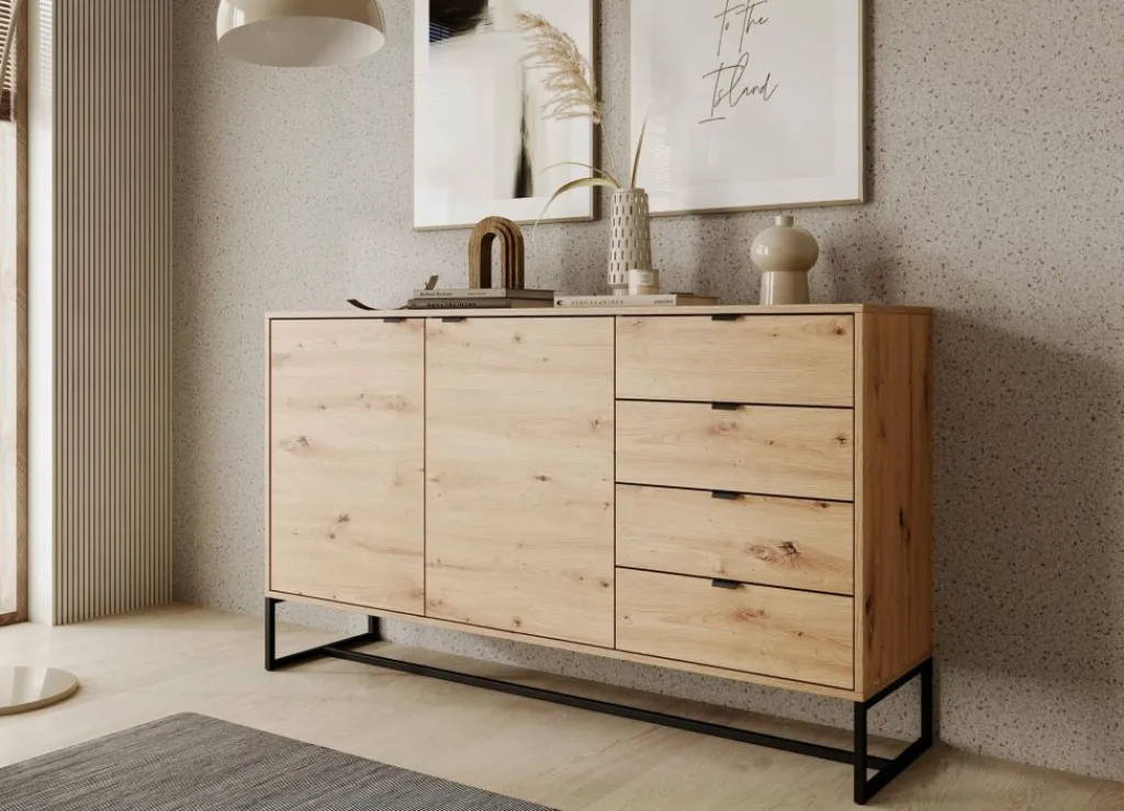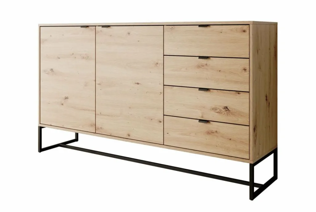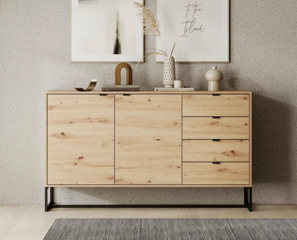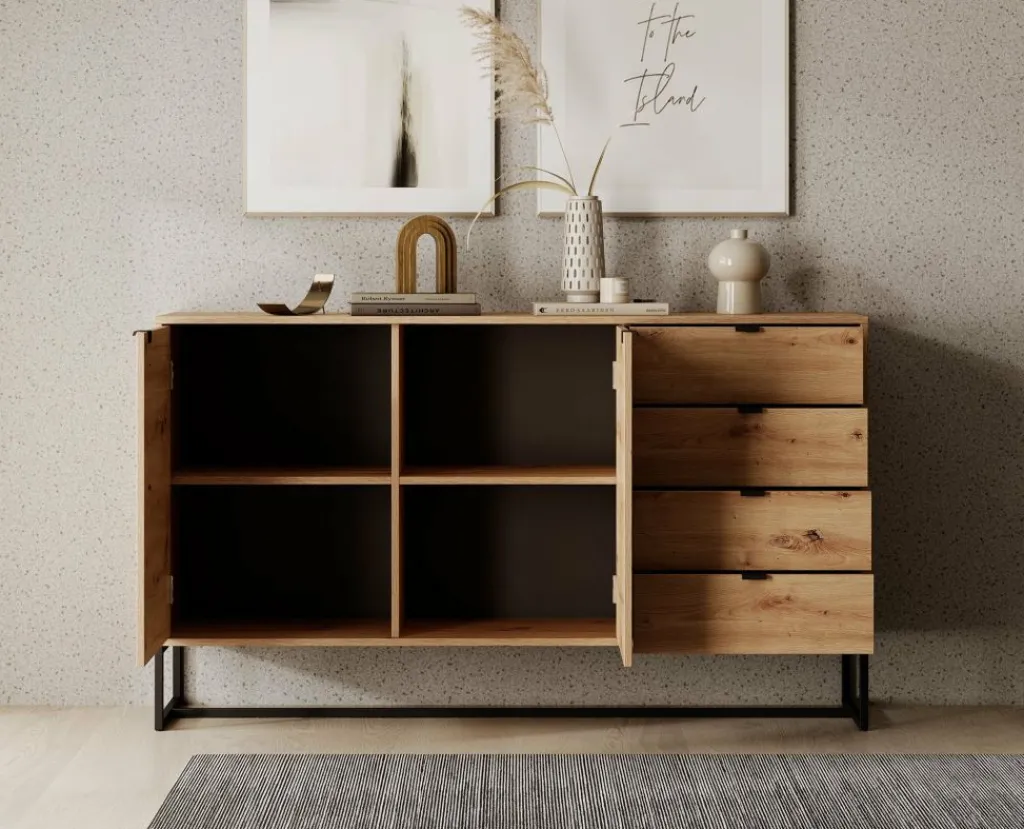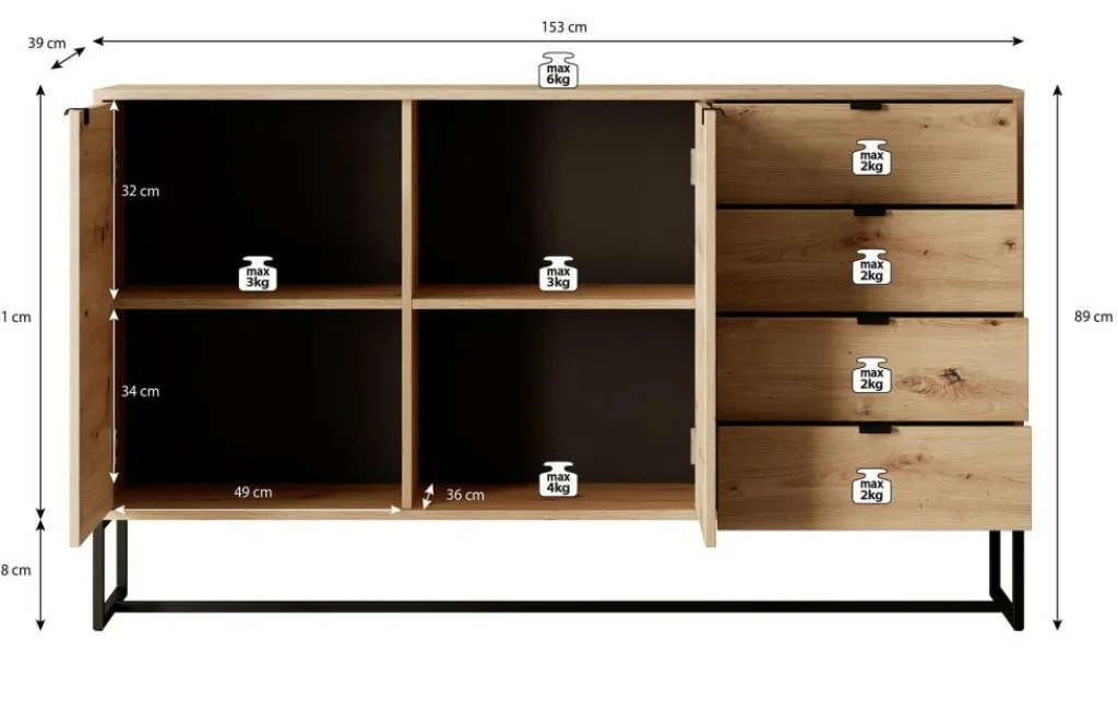 De kast heeft 2 deuren met daarachter 4 opbergvakken. Daarnaast bevinden zich 4 opberglades. De deuren en lades openen met zwarte handgrepen.