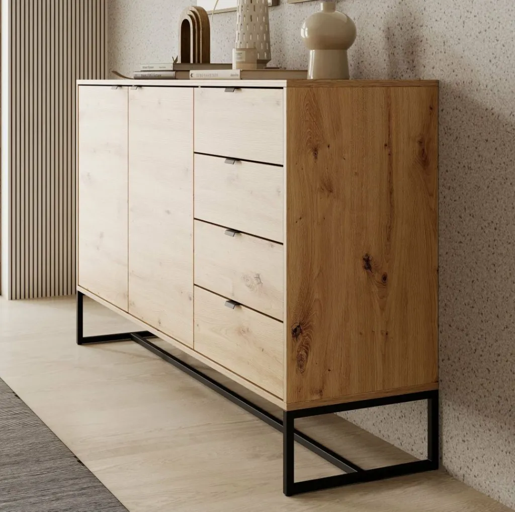 De kast staat op een zwart frame.