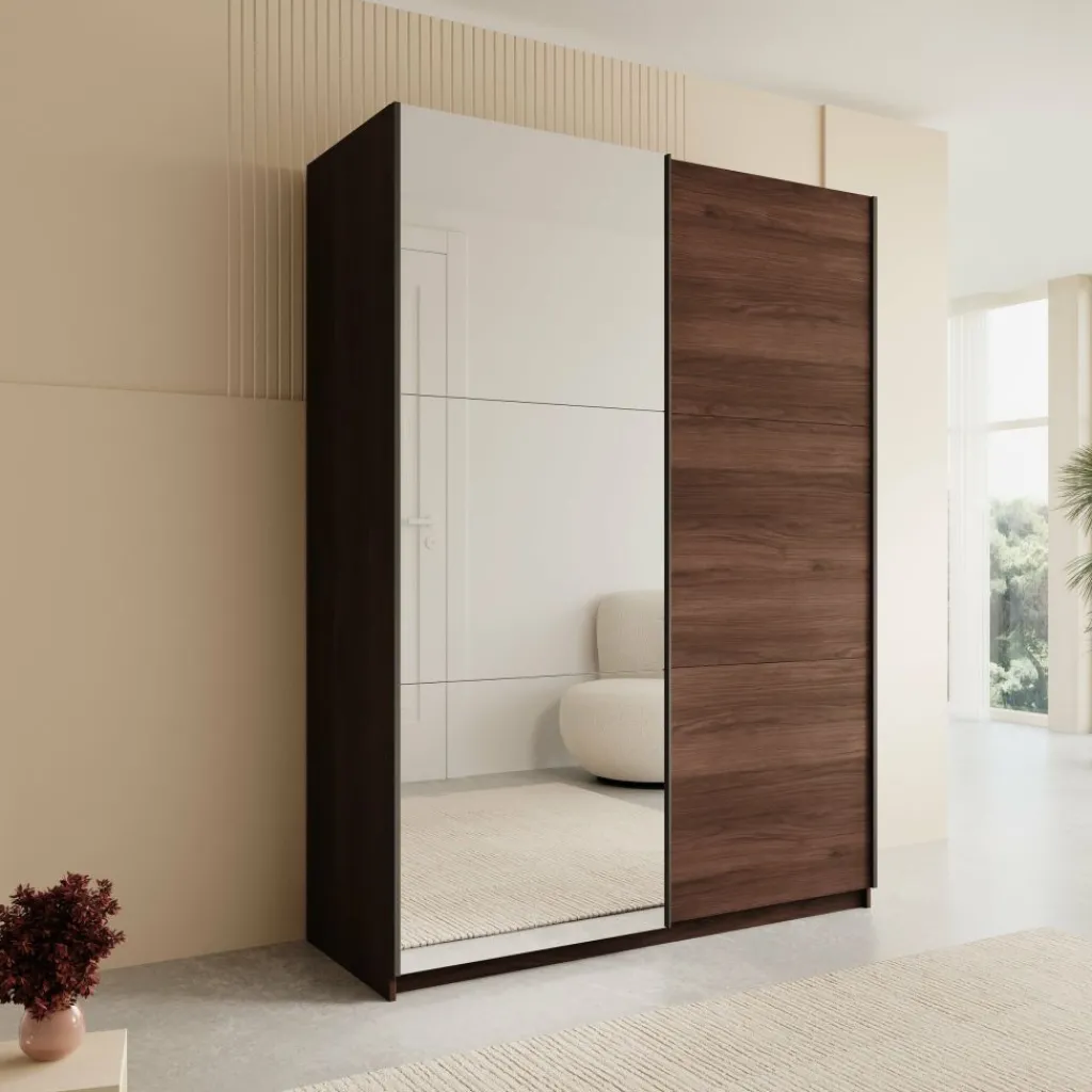 Andros kledingkast is een staande kast met twee schuifdeuren, uitgevoerd in een donker eiken afwerking. Eén van de schuifdeuren is voorzien van een spiegel over de volledige hoogte. Met een afmeting van 150x62x207 cm biedt deze kast een praktische indeling voor het opbergen van kleding en accessoires, terwijl de schuifdeuren weinig ruimte innemen bij het openen.