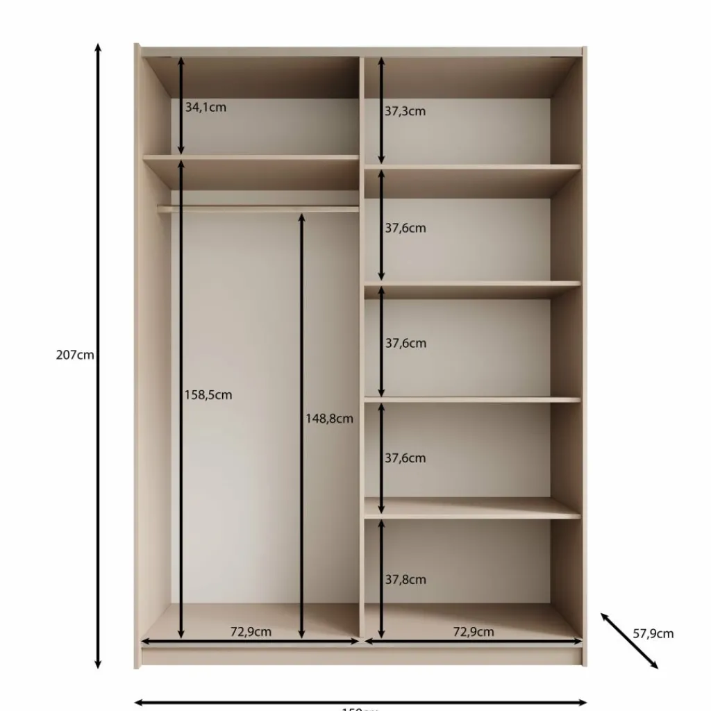 Achter de schuifdeuren is de kast verdeeld in twee compartimenten. Het linkergedeelte beschikt over een hangroede met daarboven een legplank, geschikt voor het ophangen van jassen, jurken en overhemden. Het rechtergedeelte is ingericht met meerdere vaste legplanken voor opgevouwen kleding, beddengoed of opbergdozen. Deze indeling zorgt voor een duidelijke scheiding tussen hang- en leggedeelte.