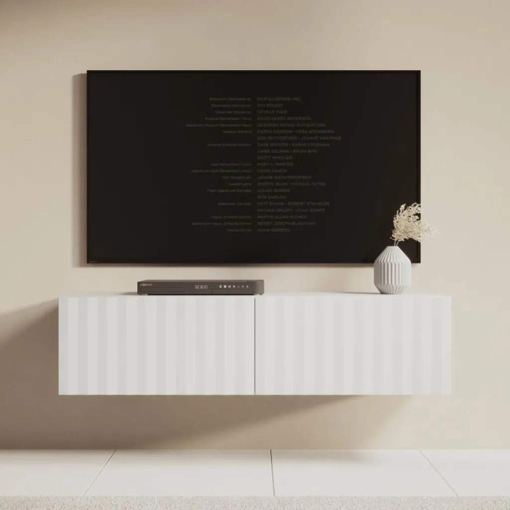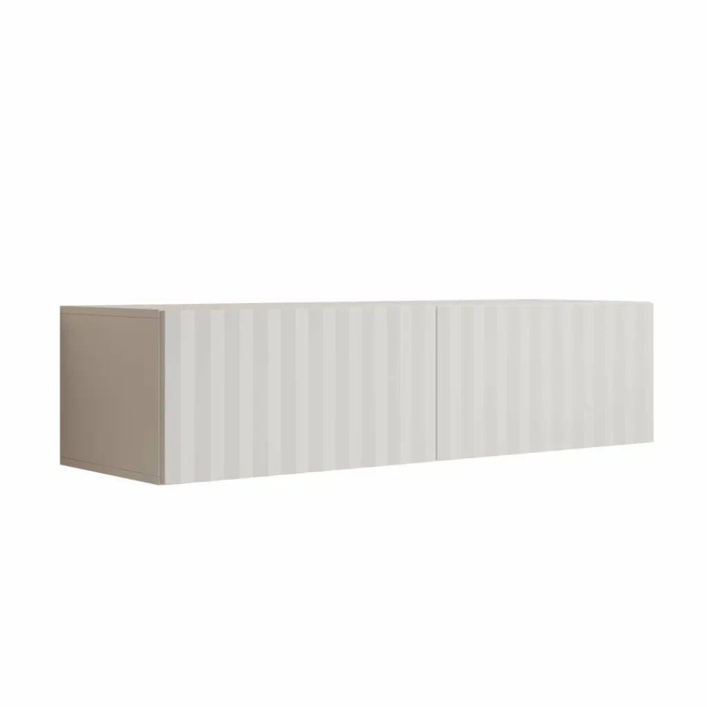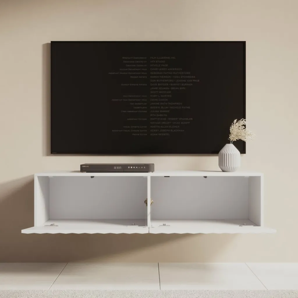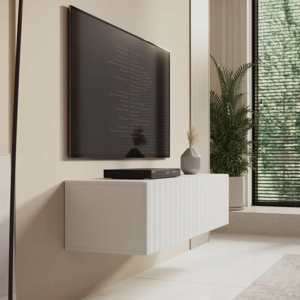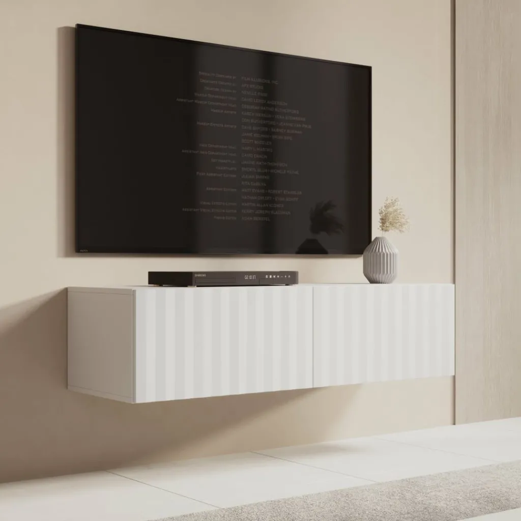 TV-meubel Angelina is een hangend meubel en uitgevoerd in een frisse witte kleur. De voorzijde is voorzien van een golvend ribbelpatroon – een subtiel accent dat meteen opvalt.