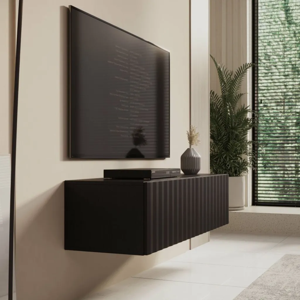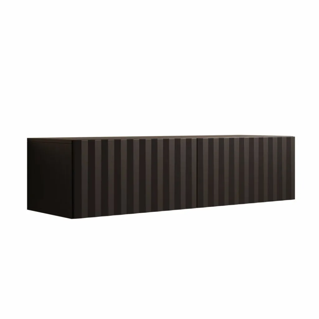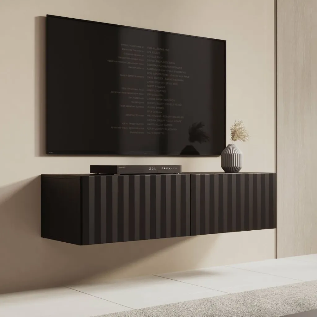 TV-meubel Angelina is een hangend meubel en uitgevoerd in een diepzwarte kleur. De voorzijde is voorzien van een golvend ribbelpatroon – een subtiel accent dat meteen opvalt.
