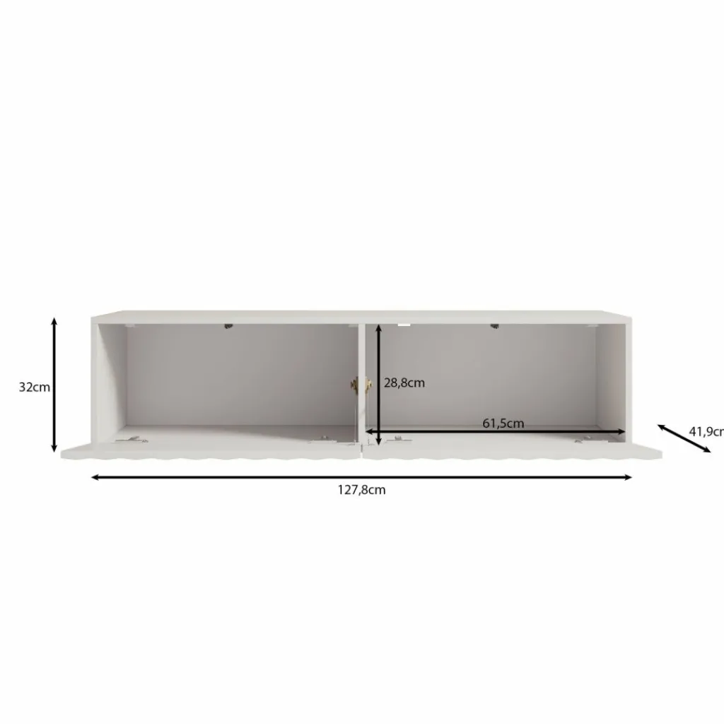 De kast beschikt over twee kleppen met een handig push-to-open systeem. Binnenin vind je twee ruime opbergvakken, ideaal voor het netjes opbergen van media-apparatuur, kabels of accessoires. Door het zwevende ontwerp blijft de vloer vrij, wat zorgt voor een luchtige en opgeruimde uitstraling.