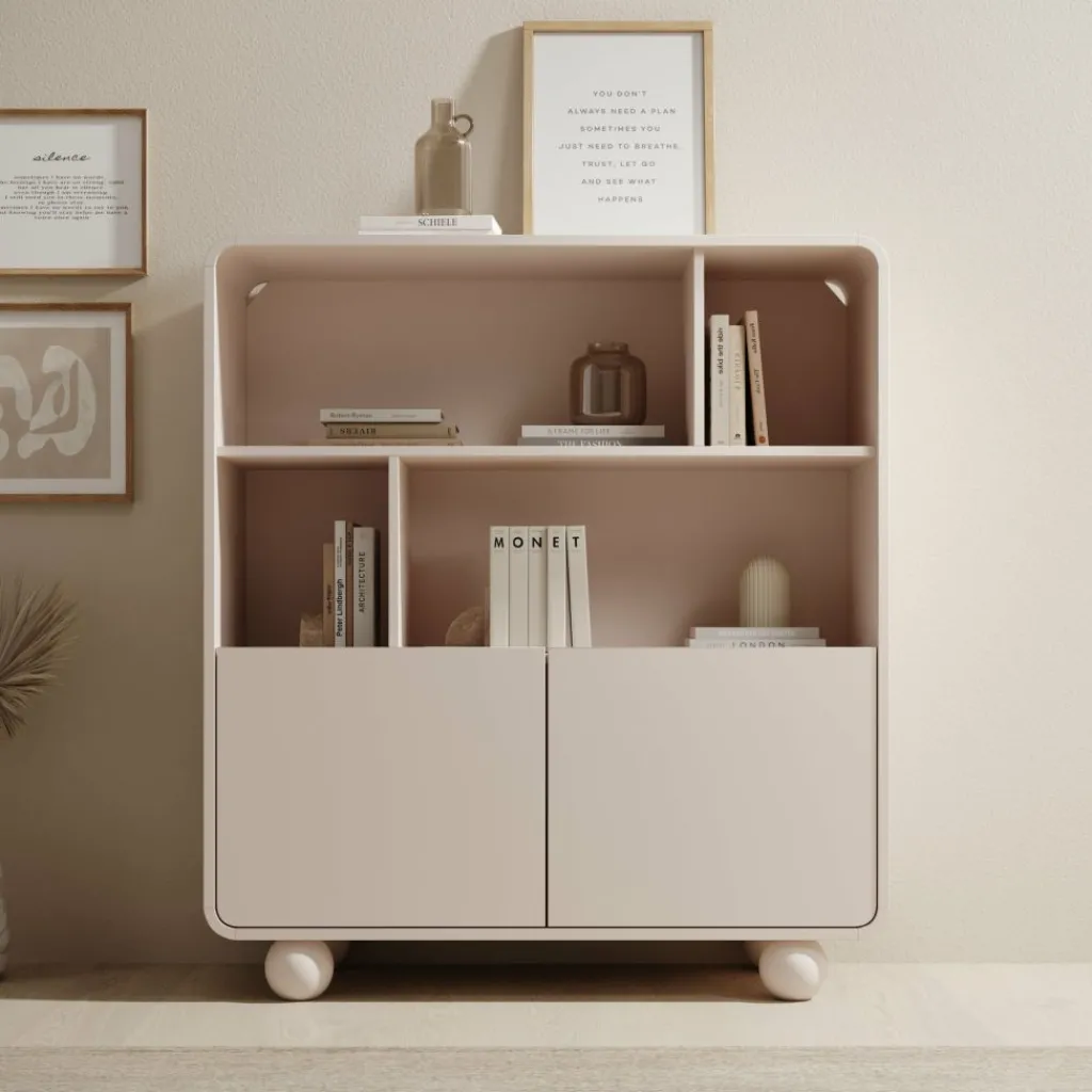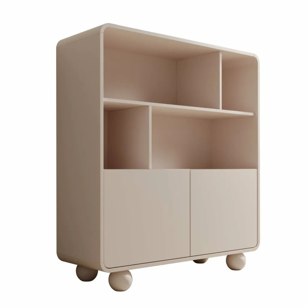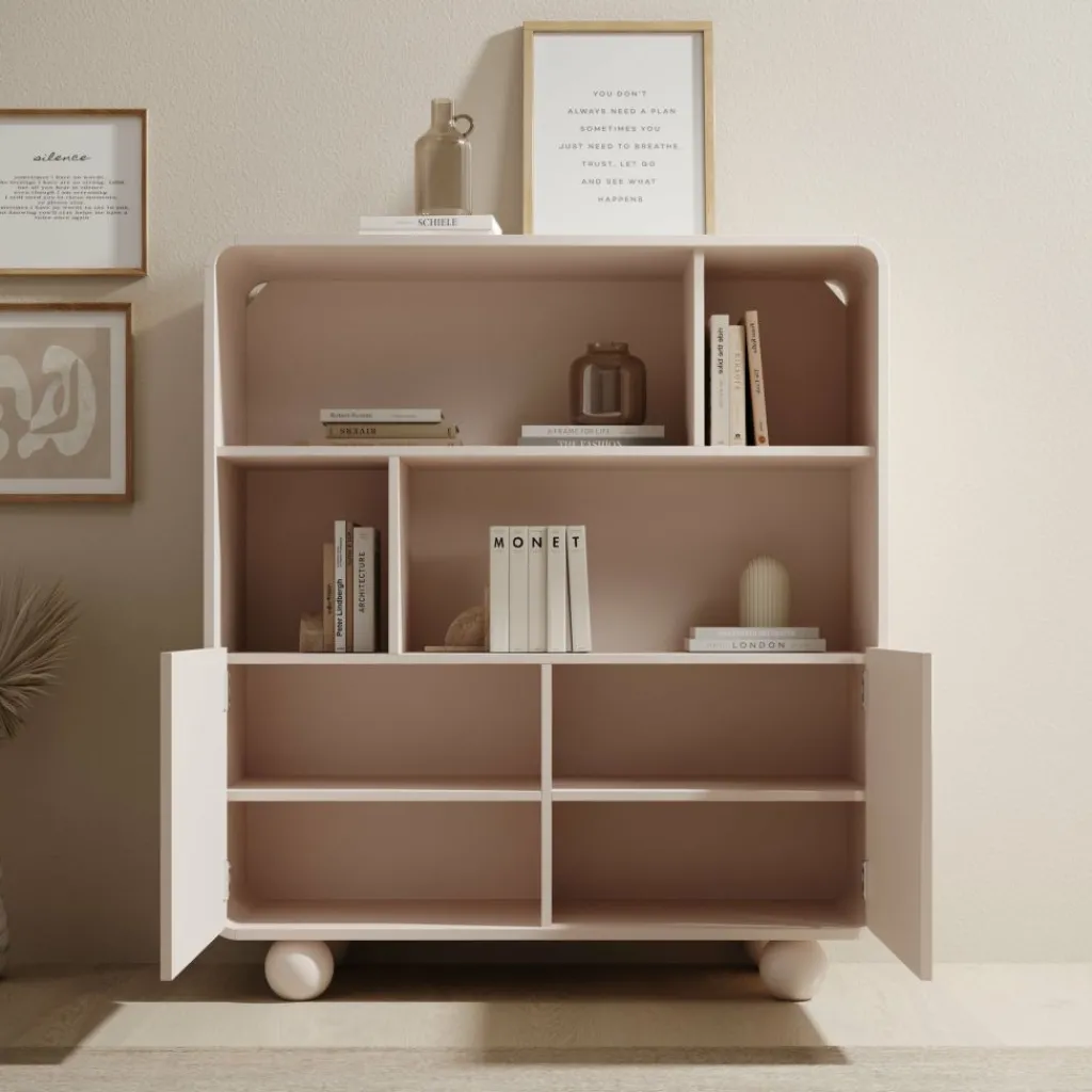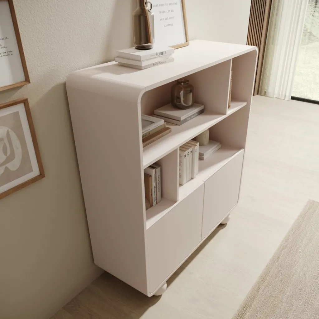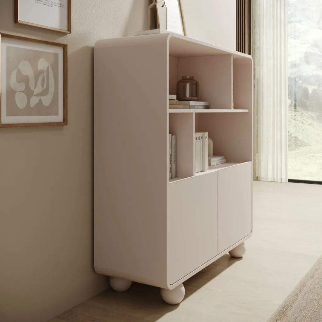 De Anobo boekenkast combineert speelse vormen met praktisch gebruik. Het ontwerp heeft afgeronde hoeken en staat op opvallende bolvormige pootjes. De open vakken zijn ideaal voor boeken of decoratie, terwijl de twee deuren extra opbergruimte bieden.